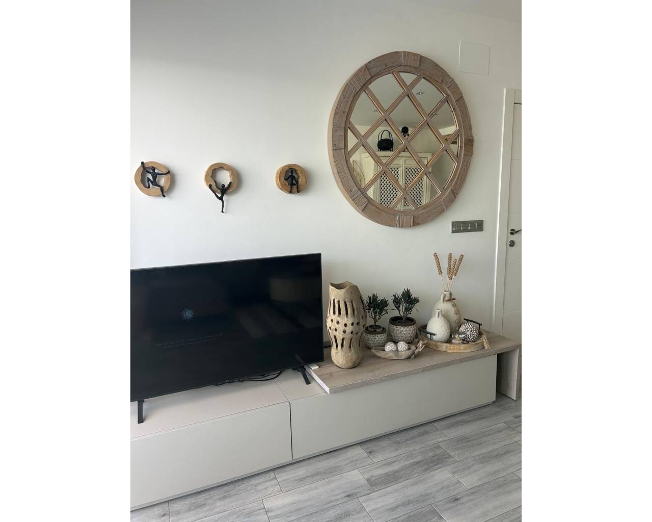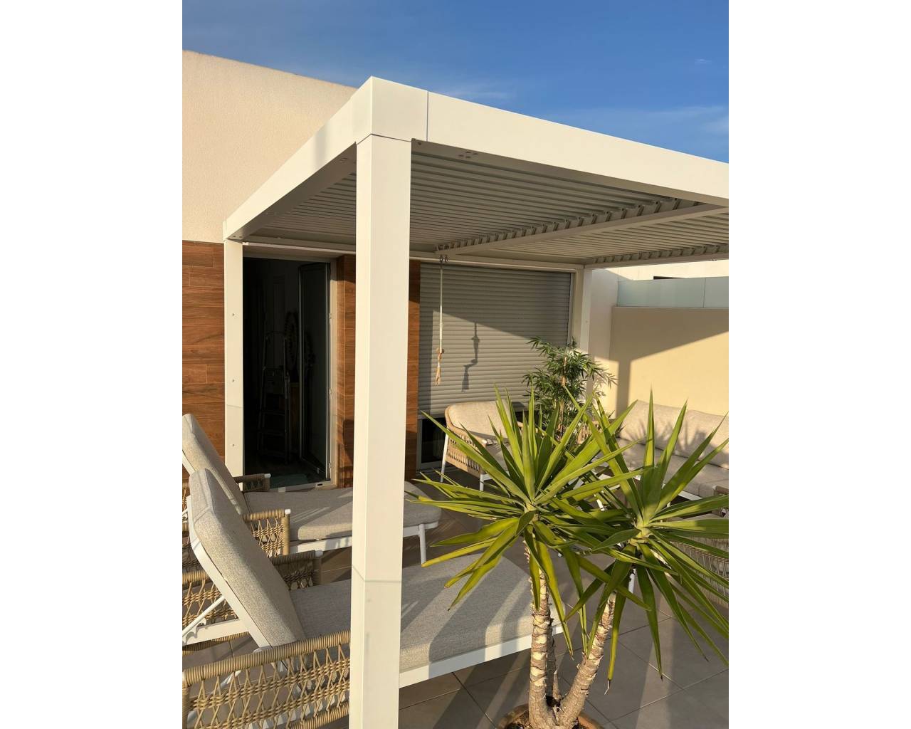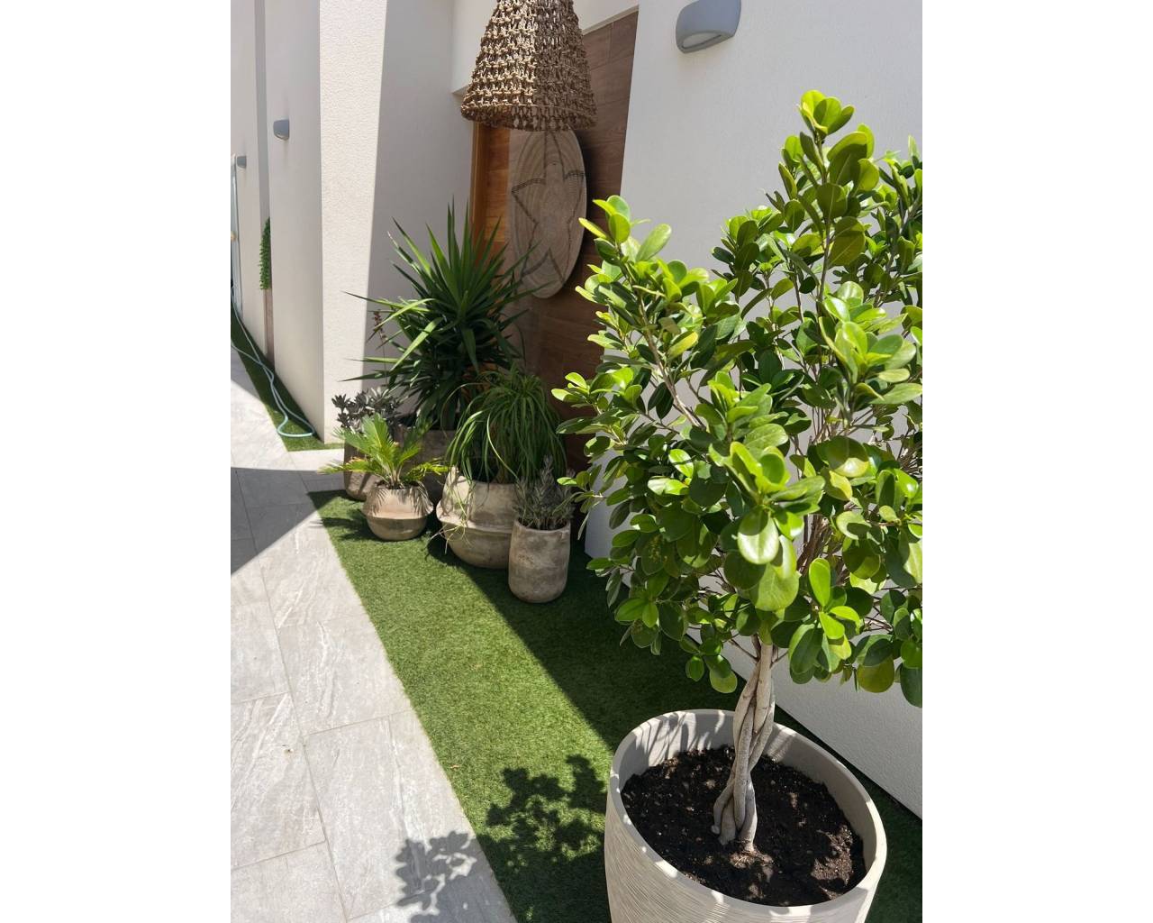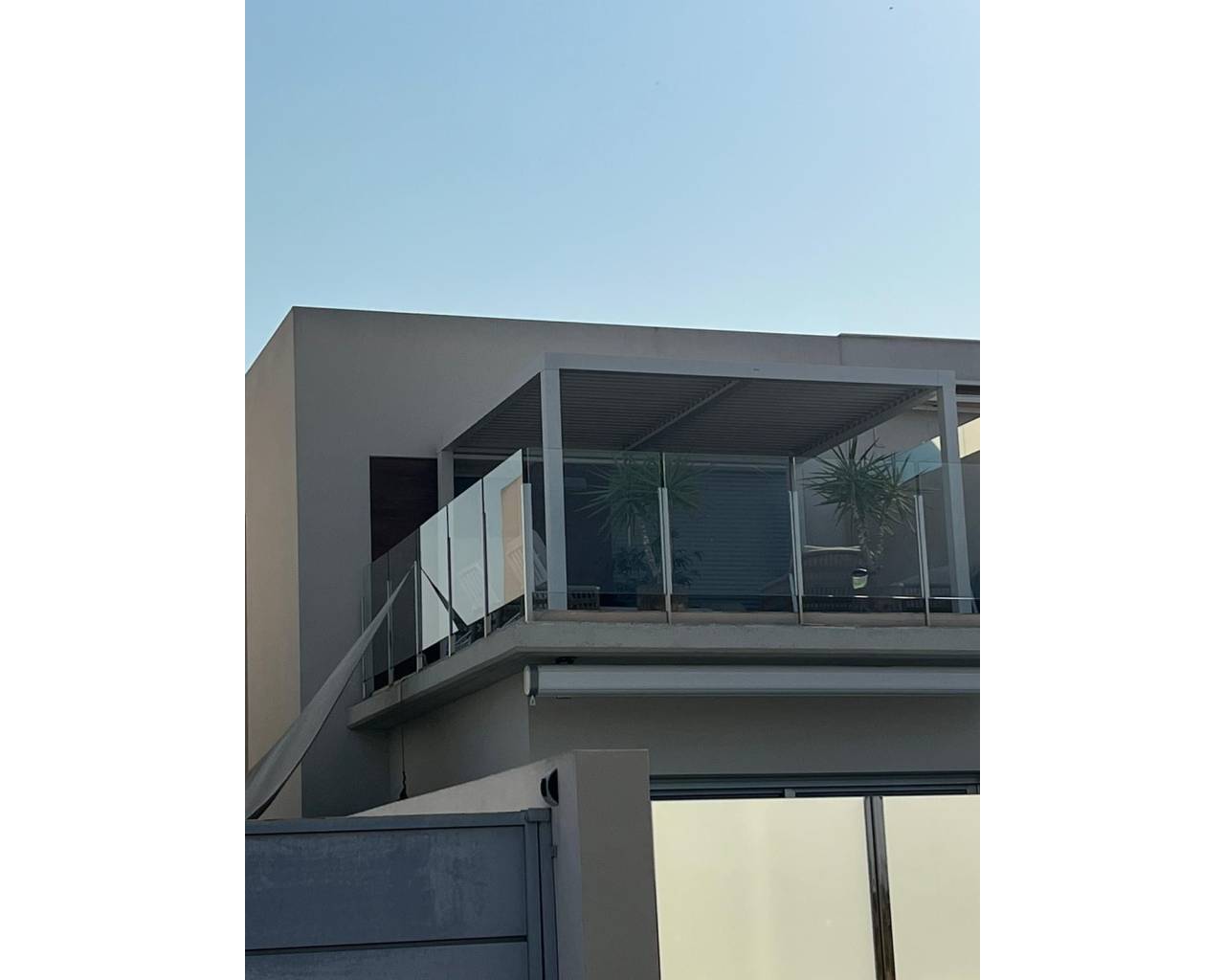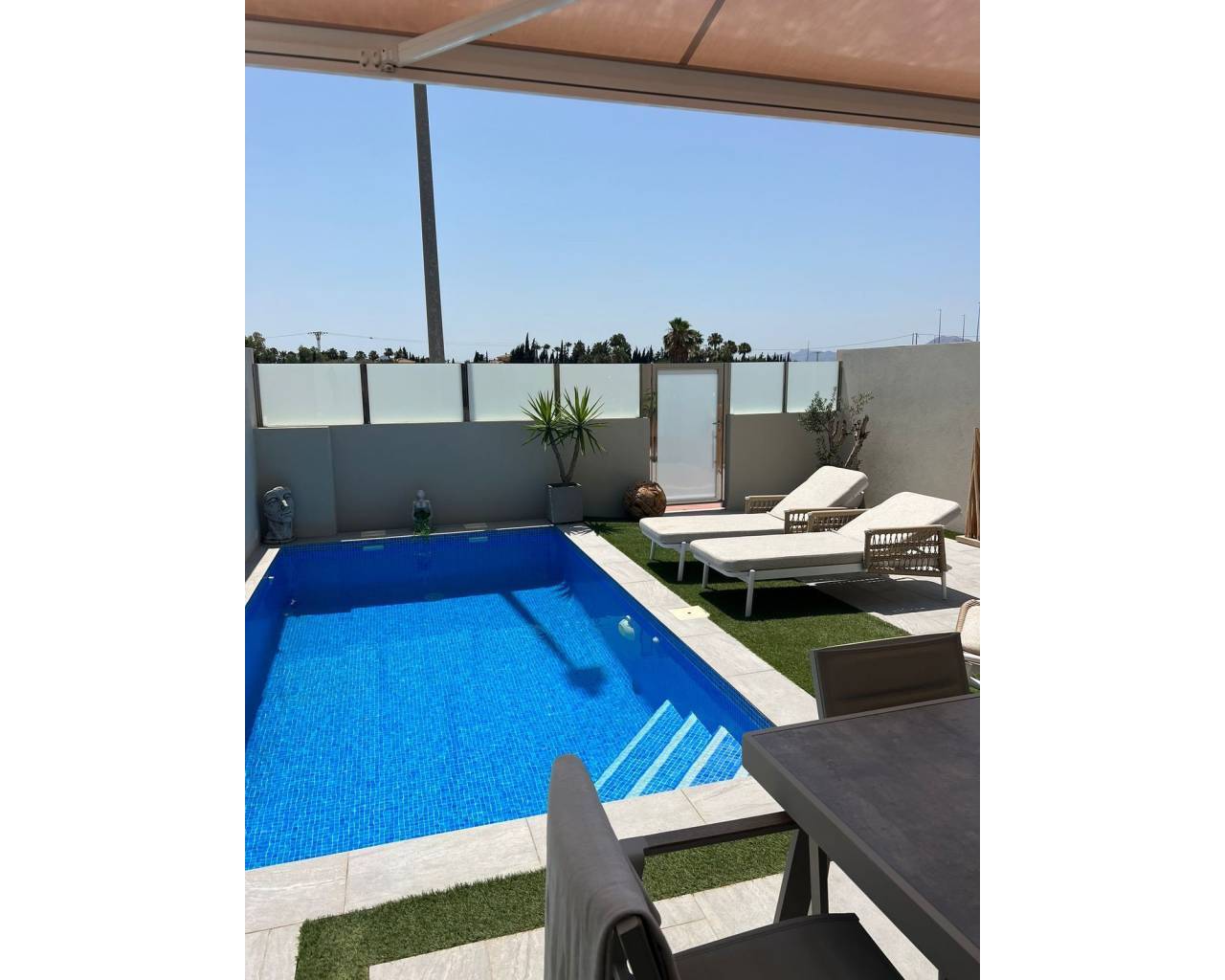 Discover this stunning contemporary villa flooded with natural light, south-facing and featuring a private swimming pool (2.80 m x 5.50 m), located in the sought-after area of Daya Vieja, just 3 minutes from Rojales and San Fulgencio. Fully furnished with high-end, carefully selected designer furniture, this semi-detached villa impresses from the moment you enter with its elegant and welcoming atmosphere. It offers 3 spacious bedrooms, 2 bathrooms, and 1 separate guest toilet, all designed for optimal comfort. The heart of the home features a bright, open and harmonious living space, where the modern kitchen blends seamlessly into the living room. Large windows provide direct views of the pool and the outdoor lounge area, creating a perfect connection between indoor and outdoor living—ideal for entertaining or enjoying everyday life under the Spanish sun. All bedrooms are equipped with built-in wardrobes offering generous storage space, while air conditioning ensures absolute comfort throughout the year. From the kitchen, a hallway leads to a guest bedroom with en-suite bathroom, followed by an additional guest bathroom. Upstairs, you will find two main bedrooms and a bathroom. At the end of the corridor, access to the front balcony reveals a true relaxation area, equipped with a retractable bioclimatic awning, ideal for creating a comfortable and intimate outdoor lounge. Tastefully decorated both inside and out, this turnkey villa combines elegance, brightness and high-quality finishes. A rare opportunity for a primary residence, holiday home or premium investment.