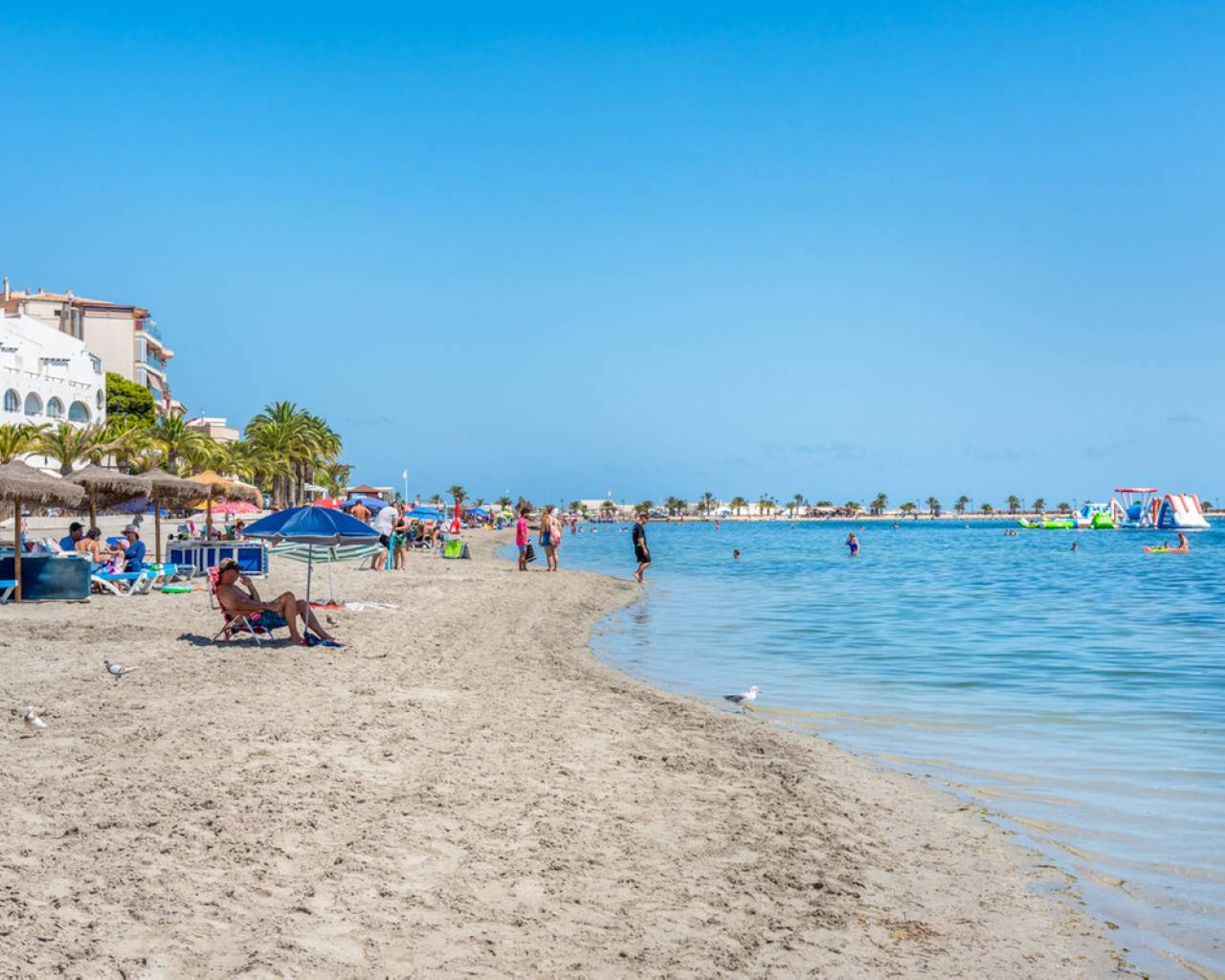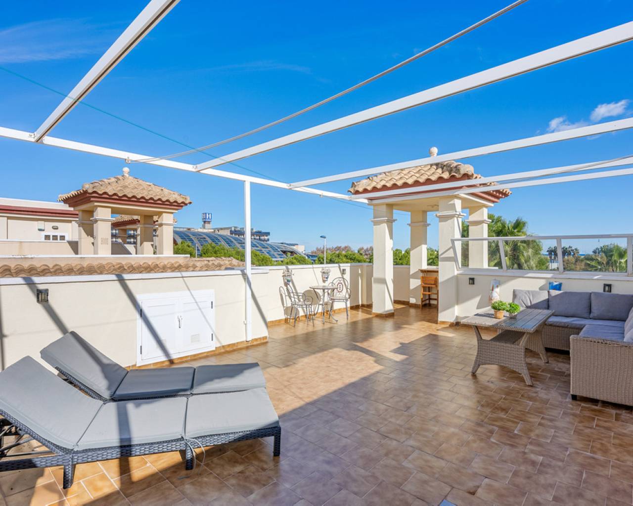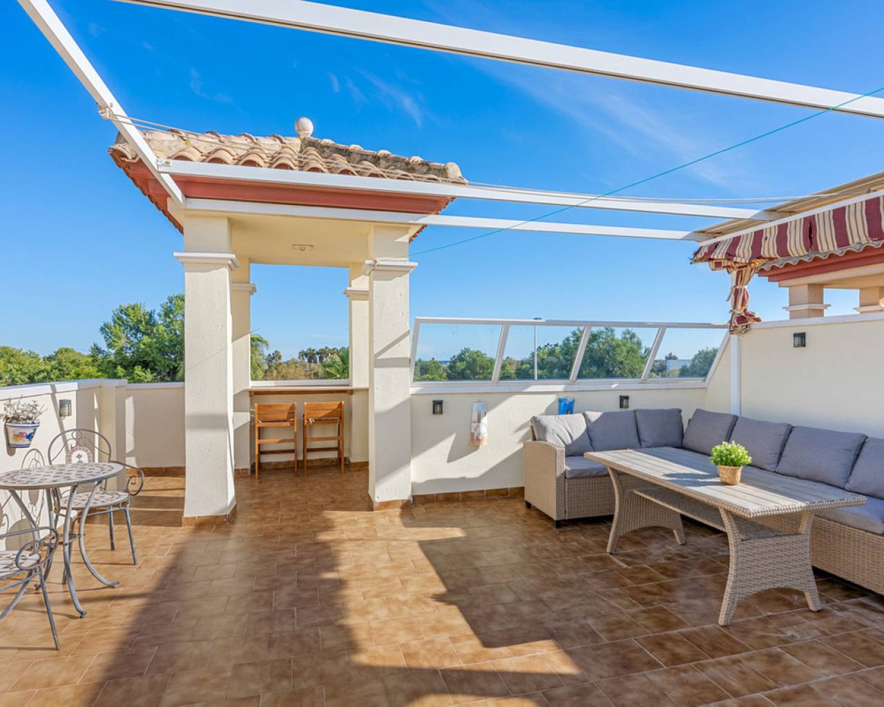 This beautiful renovated (2023) modern 3 bedroom top floor bungalow with private rooftop terrace/solarium with park/sea views is situated in San Pedro del Pinatar, Murcia within walking distance to the beach and the "salinas" of San Pedro. The property will be sold partially furnished and boasts a spacious living/dining room, a separate modern fully equipped kitchen with utility area, three bedrooms, a family bathroom, a terrace (7sqm) overlooking the park in front of the property, a private rooftop terrace/solarium (54sqm) with sea views to enjoy the sun all day long. Allocated parking space is also included. There is a lovely communal garden with swimming pool to enjoy the Spanish weather all year long. The area offers a vibrant social life with several restaurants, shops and entertainment for all ages. Discover your new home on the Costa Cálida. The property represents an excellent investment opportunity or a perfect Mediterranean getaway. Contact us today and schedule your visit to discover your future home in San Pedro del Pinatar.