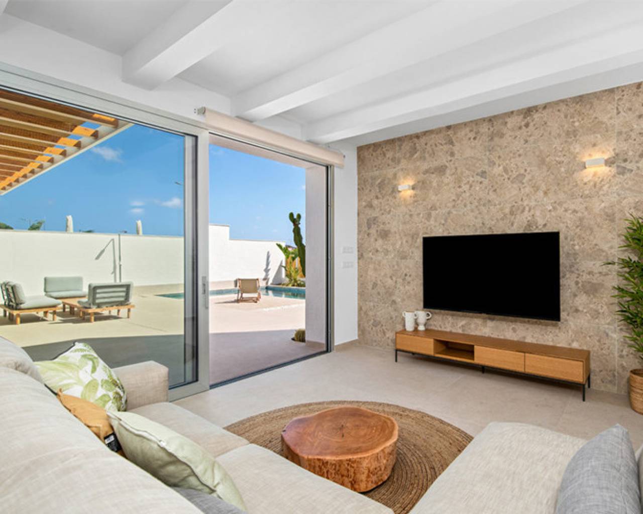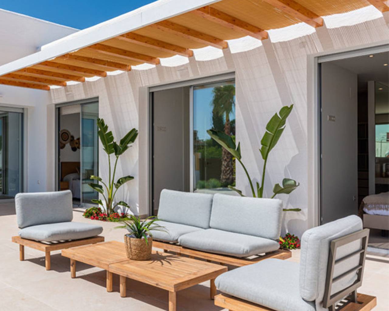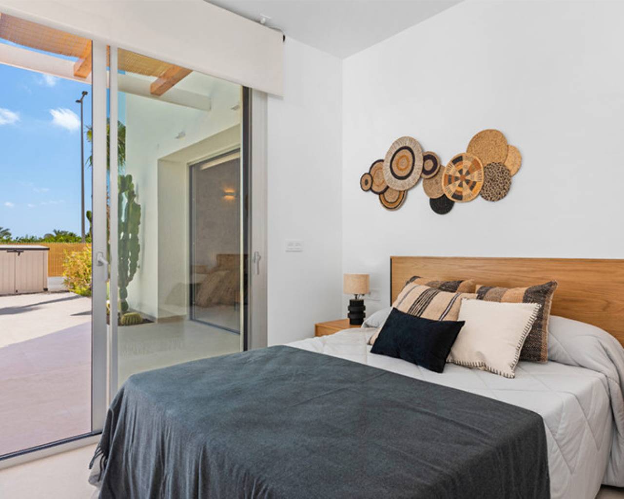 This new residential is located in Dolores (Alicante), a privileged area of the Costa Blanca, surrounded by nature and equipped with all services. 25 minutes from Alicante airport, near the beautiful beaches of Guardamar del Segura and a few minutes from the main golf courses in the area. Its excellent location makes the residential a perfect option for those looking for tranquillity. The residential is made up of 6 homes Ibizan style townhouses on plots independent with terrace, lounge area parking and private pool. The homes consist of a living-dining room, a fitted kitchen, 3 bedrooms, 2 bathrooms, 1 pantry and a solarium with privileged views. All of them carefully designed with high quality materials to satisfy the most demanding customers demanding. Outdoor parking spaces are available for Villa 05 and Villa 06.