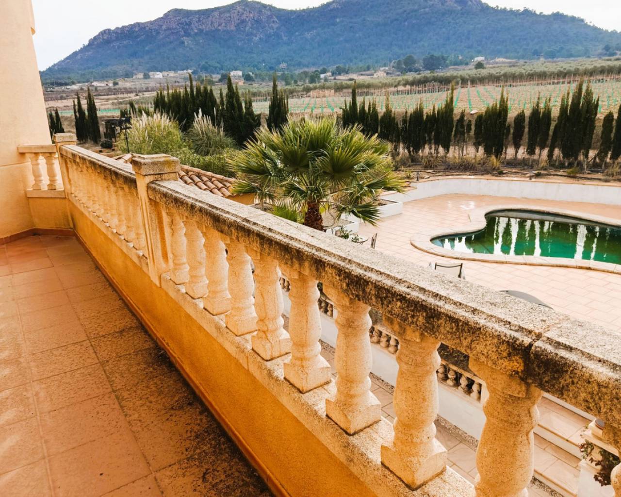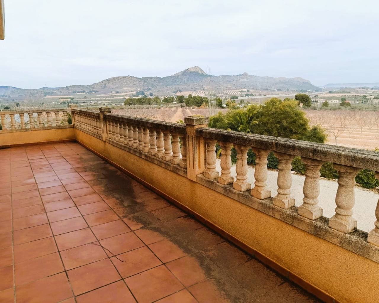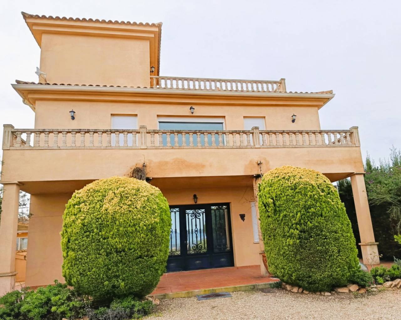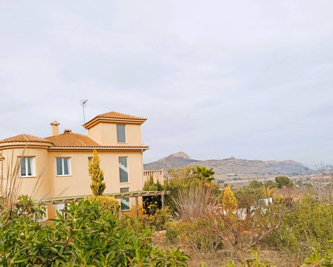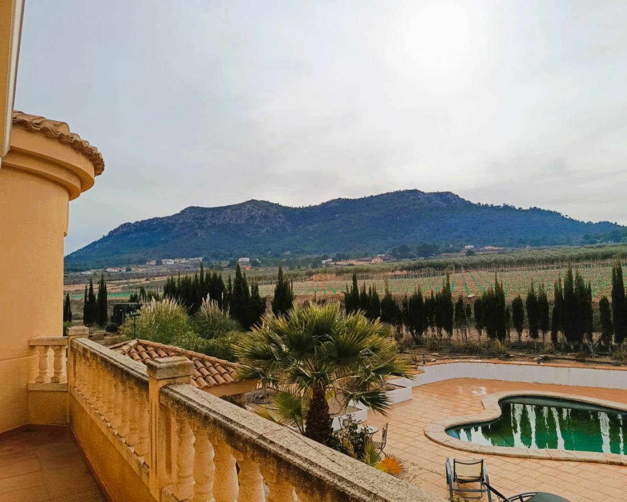 Set within more than 13,000 m² of enclosed land, this remarkable villa enjoys an elevated position with wide-ranging views across the surrounding countryside and uninterrupted sightlines to Sax Castle. While immersed in a rural setting, the property is officially located within the Elda municipality. Entry to the estate is through electric gates, opening onto a private driveway and double garage. The grounds have been designed for outdoor enjoyment, offering multiple areas to relax and entertain, including a covered dining space, a fully equipped summer kitchen and bar, and a dedicated BBQ area with an Indian tandoor. The land also incorporates a herb garden and established fruit trees such as fig and apple. The villa stands out architecturally, with its distinctive twin towers connected by an upper-level balcony. From this elevated position, the rear bedrooms overlook the sun-filled pool area and surrounding terraces, creating a strong connection between the house and its outdoor spaces. The main entrance, facing south, leads into a spacious reception area currently used as a dining room. Large windows allow light to flow through the interior throughout the day, while framing views of the landscape beyond. On this level, the property also offers a well-proportioned kitchen, a comfortable living room centred around a double-sided fireplace, a double bedroom and a bathroom. The first floor is arranged around a central gallery, giving access to four bedrooms and two bathrooms, with balconies on both sides of the house. Two of the bedrooms are located within the towers; one features an en-suite bathroom, while the other shares a Jack-and-Jill bathroom. At the top of the house, a further staircase leads to a practical service area and a roof terrace, from where the views towards Sax Castle are particularly impressive, especially after dark. The property is connected to mains services and benefits from solar panels installed in recent years, significantly reducing electricity costs. Underfloor heating and air conditioning ensure year-round comfort. Carefully planned and solidly built, the villa features 29 windows, providing light, views and a sense of space in every room. This is a substantial and well-equipped home, ideal for those seeking privacy, character and energy efficiency, combined with exceptional surroundings.