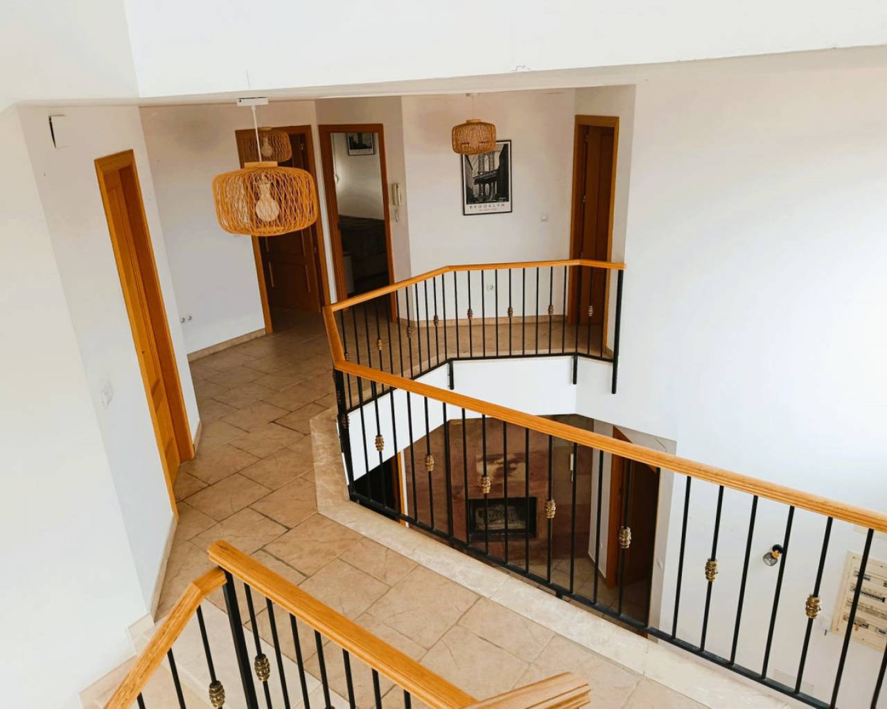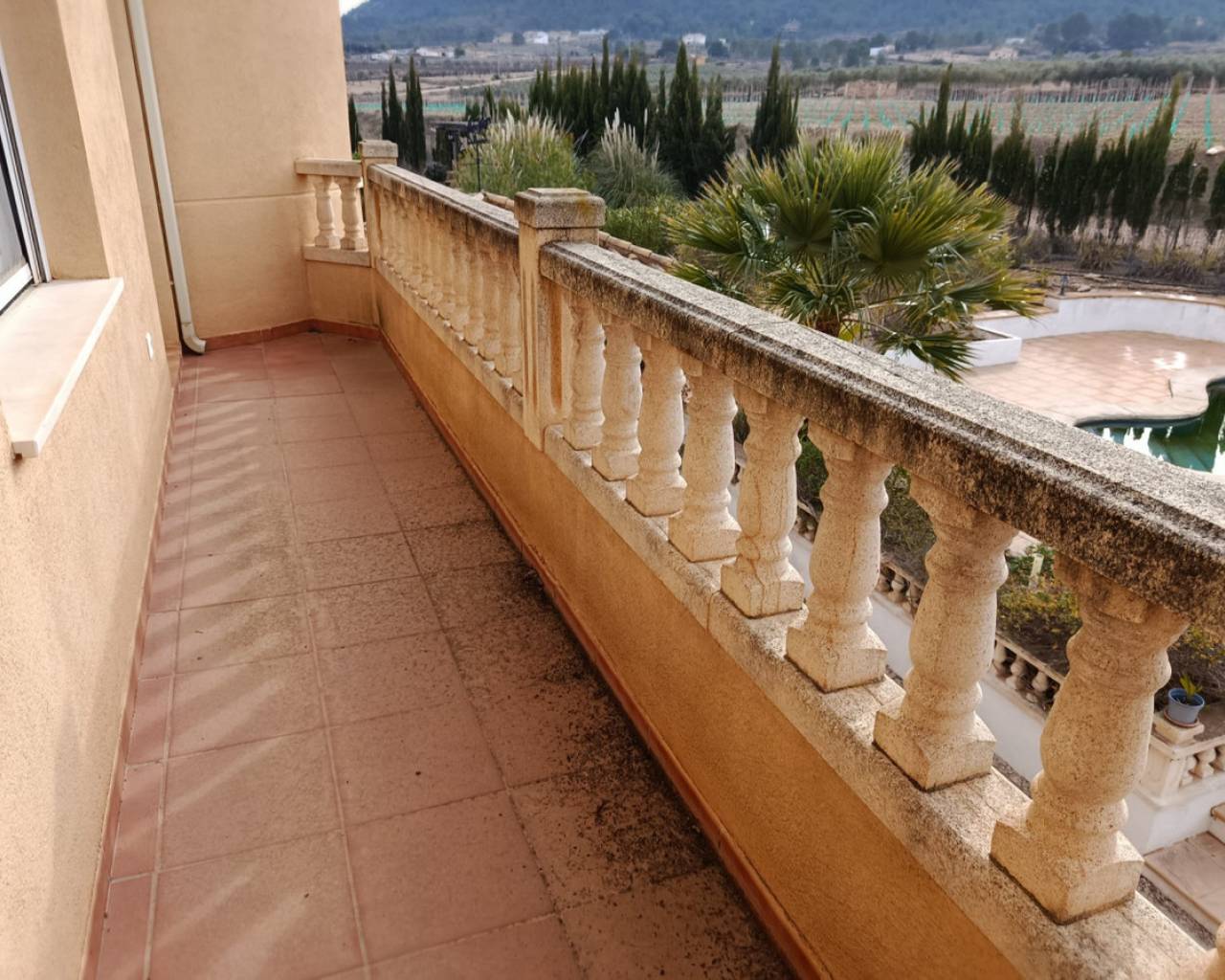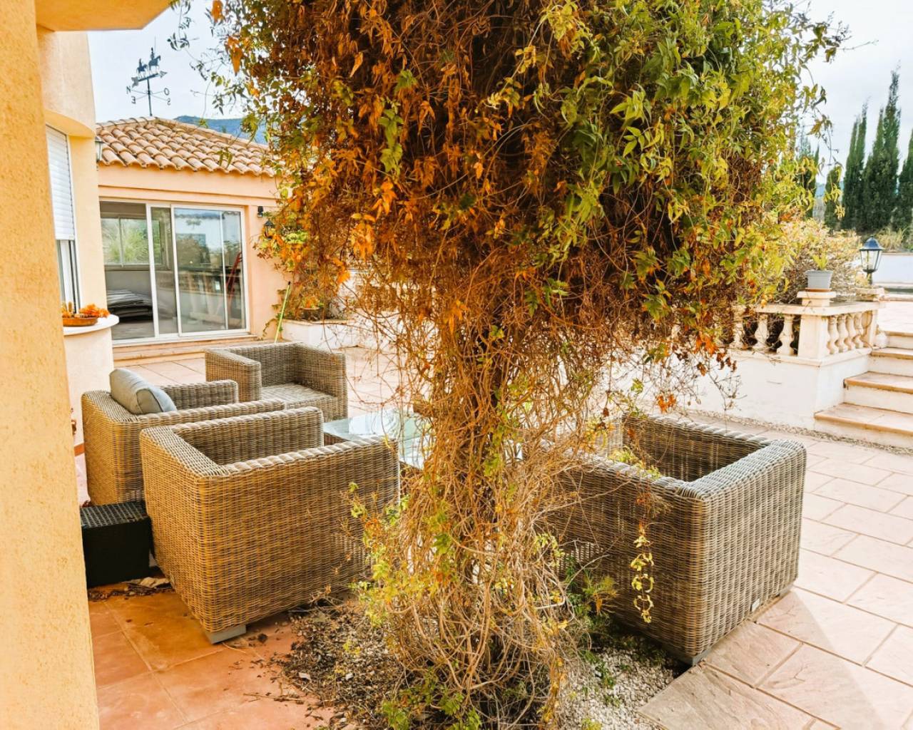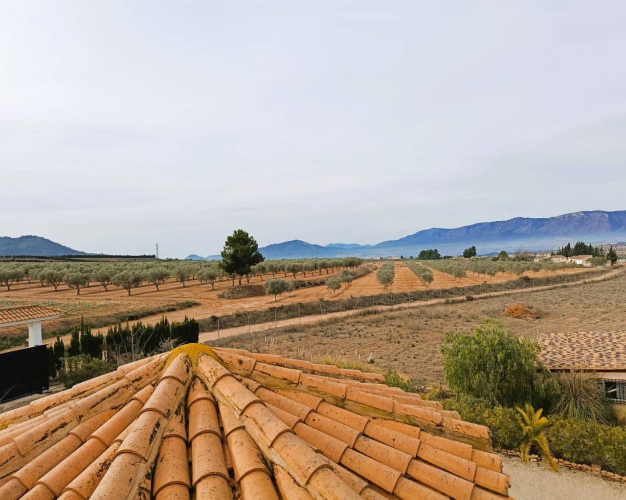 Set within more than 13,000 m² of enclosed land, this remarkable villa enjoys an elevated position with wide-ranging views across the surrounding countryside and uninterrupted sightlines to Sax Castle. While immersed in a rural setting, the property is officially located within the Elda municipality. Entry to the estate is through electric gates, opening onto a private driveway and double garage. The grounds have been designed for outdoor enjoyment, offering multiple areas to relax and entertain, including a covered dining space, a fully equipped summer kitchen and bar, and a dedicated BBQ area with an Indian tandoor. The land also incorporates a herb garden and established fruit trees such as fig and apple. The villa stands out architecturally, with its distinctive twin towers connected by an upper-level balcony. From this elevated position, the rear bedrooms overlook the sun-filled pool area and surrounding terraces, creating a strong connection between the house and its outdoor spaces. The main entrance, facing south, leads into a spacious reception area currently used as a dining room. Large windows allow light to flow through the interior throughout the day, while framing views of the landscape beyond. On this level, the property also offers a well-proportioned kitchen, a comfortable living room centred around a double-sided fireplace, a double bedroom and a bathroom. The first floor is arranged around a central gallery, giving access to four bedrooms and two bathrooms, with balconies on both sides of the house. Two of the bedrooms are located within the towers; one features an en-suite bathroom, while the other shares a Jack-and-Jill bathroom. At the top of the house, a further staircase leads to a practical service area and a roof terrace, from where the views towards Sax Castle are particularly impressive, especially after dark. The property is connected to mains services and benefits from solar panels installed in recent years, significantly reducing electricity costs. Underfloor heating and air conditioning ensure year-round comfort. Carefully planned and solidly built, the villa features 29 windows, providing light, views and a sense of space in every room. This is a substantial and well-equipped home, ideal for those seeking privacy, character and energy efficiency, combined with exceptional surroundings.