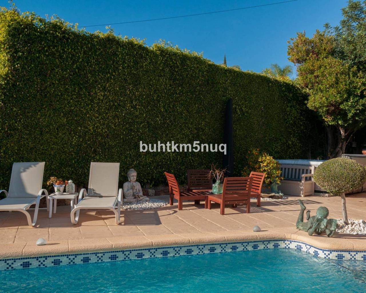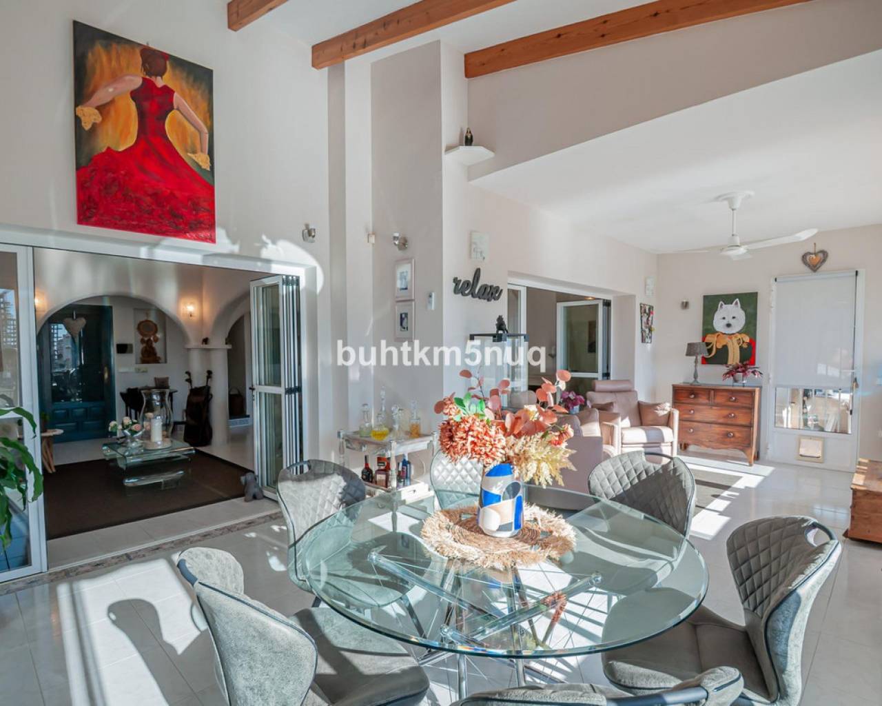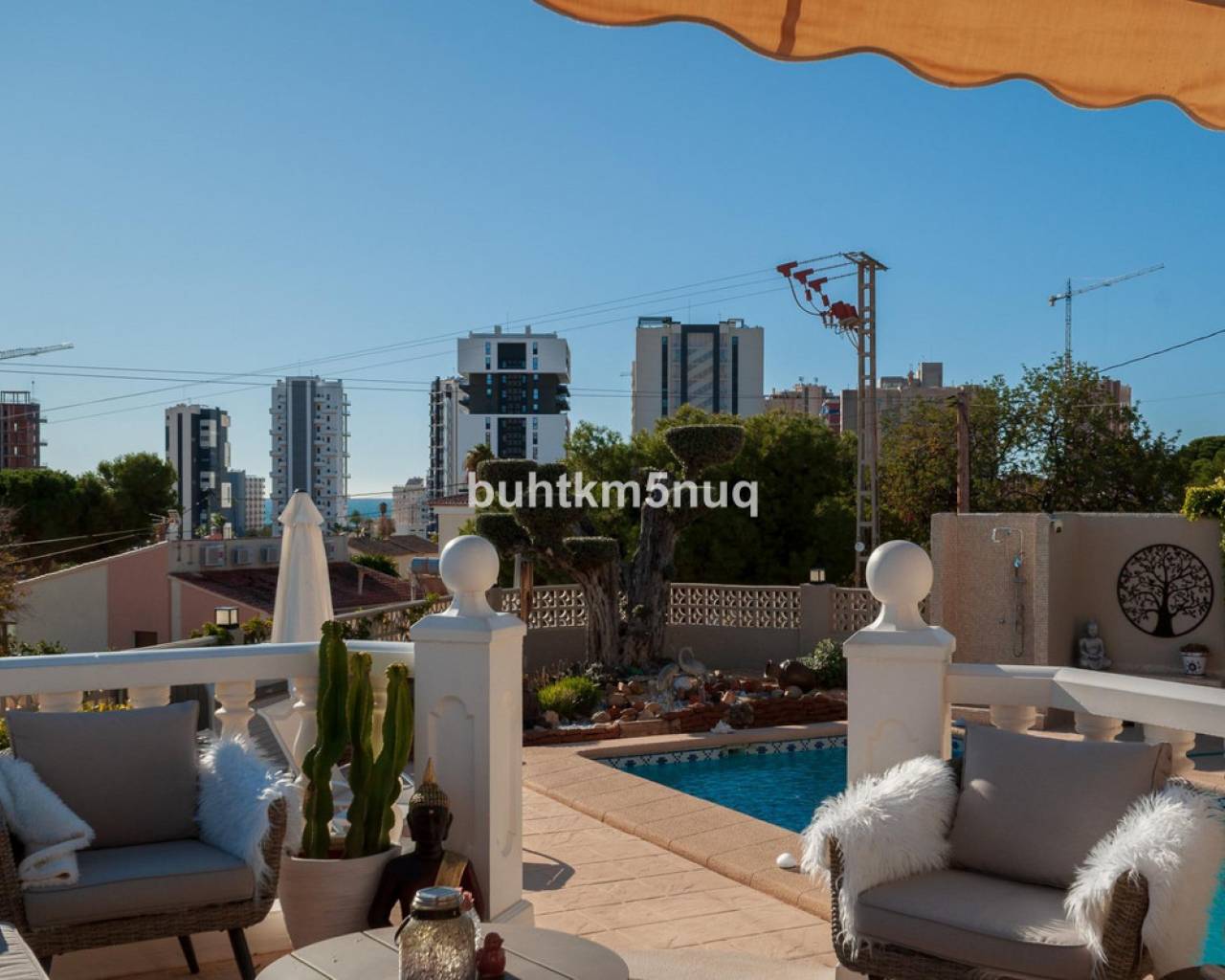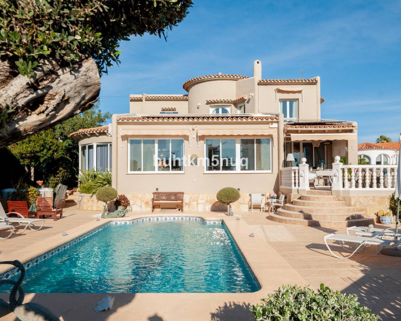 Thanks to its south-facing orientation, the villa enjoys sunshine all day long. It offers peace and privacy while being perfectly located: the beach is just 700 metres away, with shops, restaurants and the town centre within walking distance.~The property offers 318 m2 of built-up area on a flat 824 m2 plot, featuring a Mediterranean garden, private swimming pool, jacuzzi and sunny terraces with breathtaking sea views.~Inside, the villa has 4 bedrooms, 3 bathrooms, a bright living area with direct outdoor access, a modern kitchen and a separate office. Fully renovated and equipped with underfloor heating, air conditioning, solar panels and a garage with charging point.~A warm and elegant home where sun, views and comfort come together — ideal as a permanent residence or a second home on the Costa Blanca.