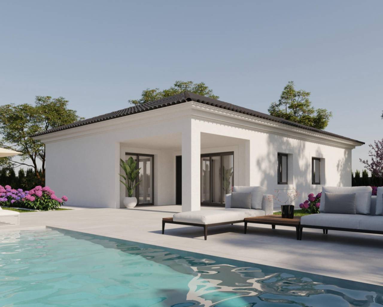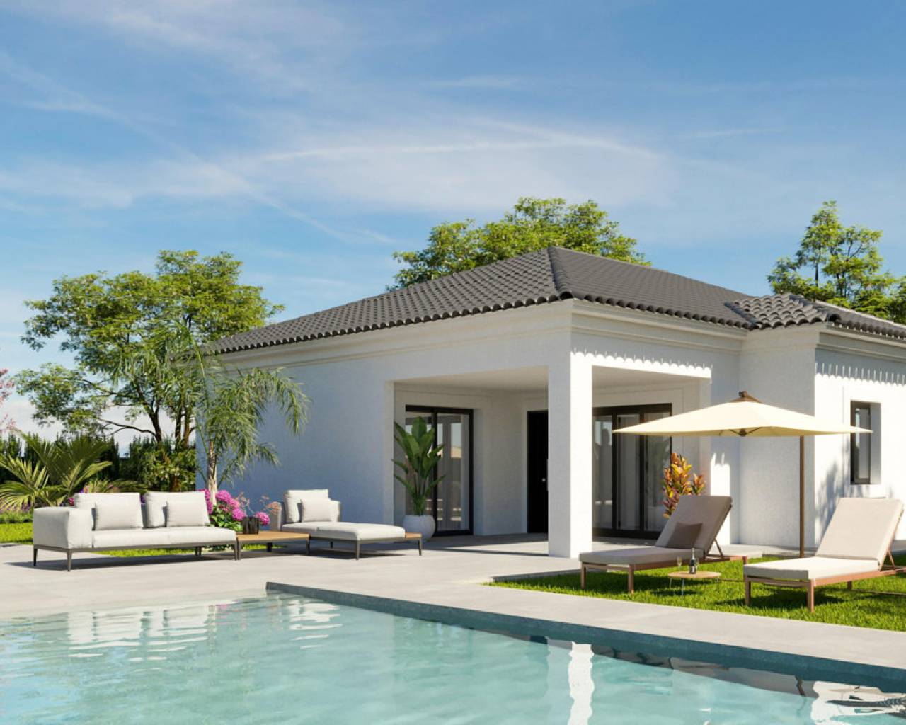 YOUR DREAM HOME Discover the perfect villa where design, quality, and comfort come together to offer you an unparalleled lifestyle. It will have all the necessary utilities, including water and electricity supply, installation of a photovoltaic panel system for self-consumption of electric energy, and a wastewater treatment system using a biological oxidation purifier. It will feature high-quality finishes and an extensive luxury specification list. Equipped with a 8x4 swimming pool with an outdoor shower, porcelain perimeter around the pool, pre-installation for heating, barbecue area with toilet facilities, enclosed garage with an automatic door and included motor, pre-installation for an electric charging point, landscaped area with artificial turf, motorized automatic access gate to the plot (including motor), and a natural stone-clad wall. ***Notes: • Upon full completion of the project, the final construction report and water and electricity certifications will be delivered. • The construction completion timeline, once the building permit is obtained, depends on the size of the property and its annexes: 8–10 months for single-story Insulated Slab homes 12–14 months for single-story homes With Structure 12–14 months for two-story Insulated Slab homes 15–18 months for two-story homes With Structure • The construction will be carried out as a SELF-DEVELOPMENT project.