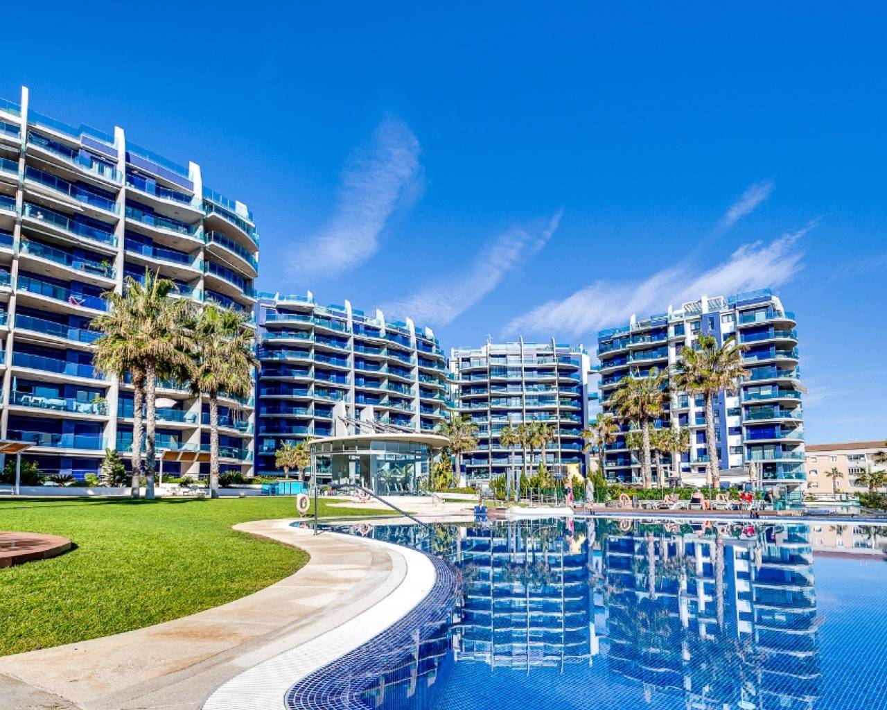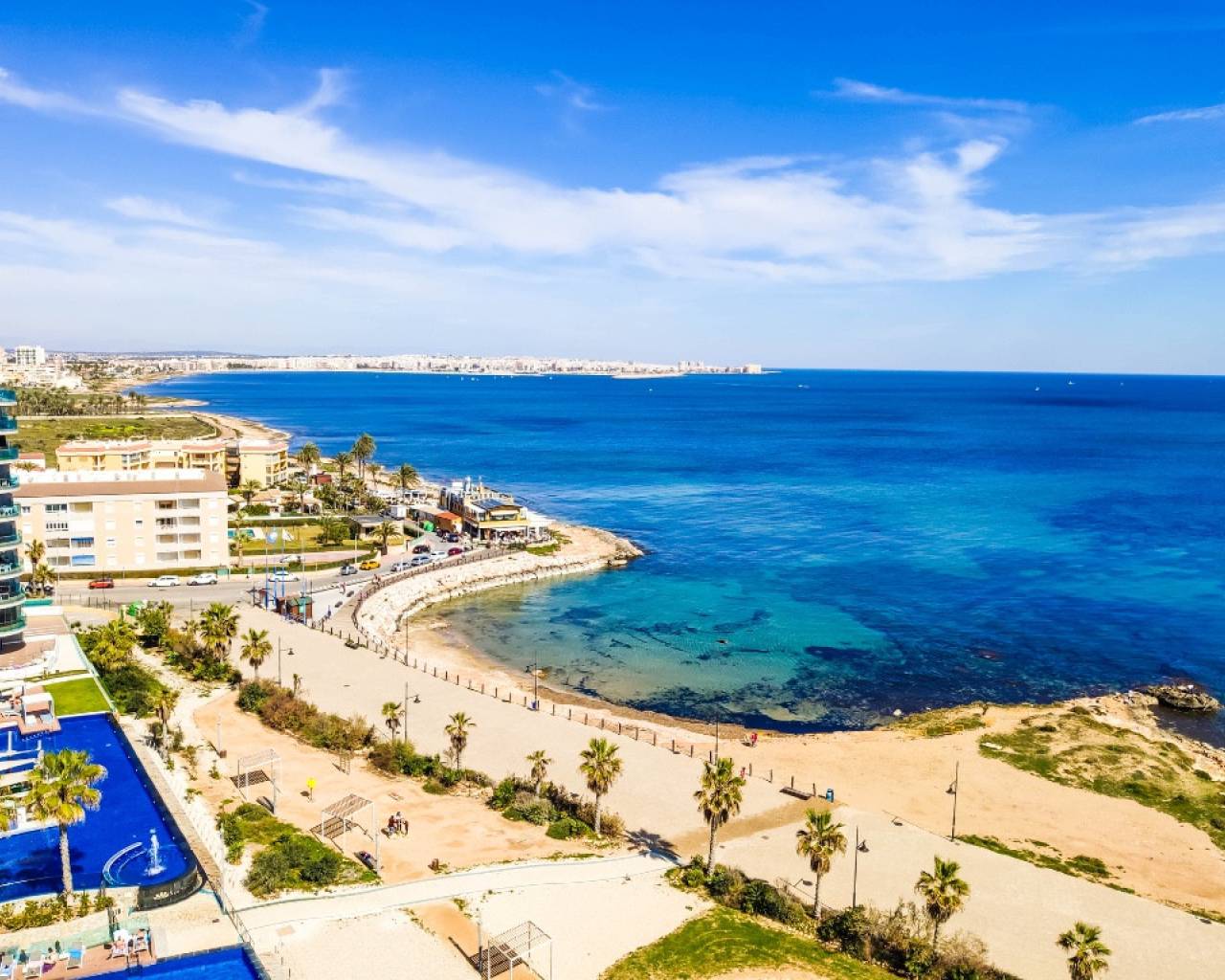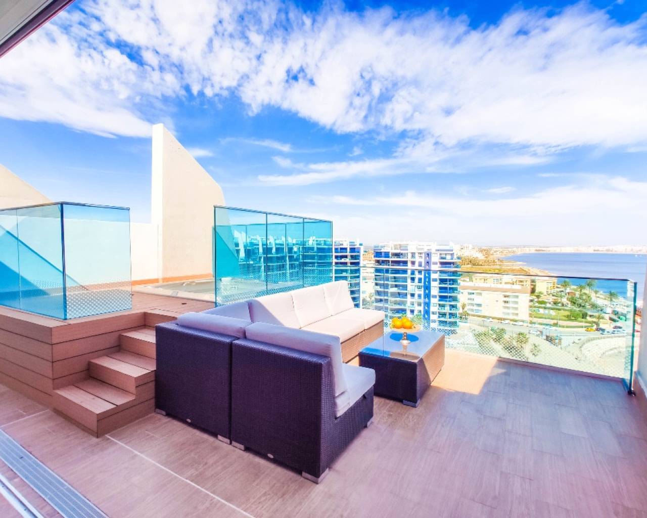 For sale an exceptional frontline apartment in first sea line in Punta Prima. Penthouse consists of 2 bedrooms, 2 bathroom, 9 floor apartment in the Sea Senses development in Punta Prima with spectacular all round panoramic sea views and only 50 meters from the Rocio del Mar beach. Hot and cold air conditioning. Lift access is available. The modern galley-style kitchen is fully equipped with dishwasher, oven, microwave, coffee machine and leads to a utility room equipped with washing machine and tumble drier.The spacious master bedroom benefits from wonderful sea views, large fitted wardrobes. The en-suite bathroom includes a large walk-in shower. Another bedroom benefits large fitted wardrobes.The family bathroom consists of a large walk in shower, lavatory and wash hand basin with separate storage unit.The ultra modern communal area includes three infinity pools - one heated for all year round use, four Jacuzzis, Finnish and Turkish saunas, gymnasium, Bali beds, pool bar and chill out area offering food and drinks, pool Jacuzzi's, children's play area with water fountains, children's paddling pool, play house, football and padel tennis courts.