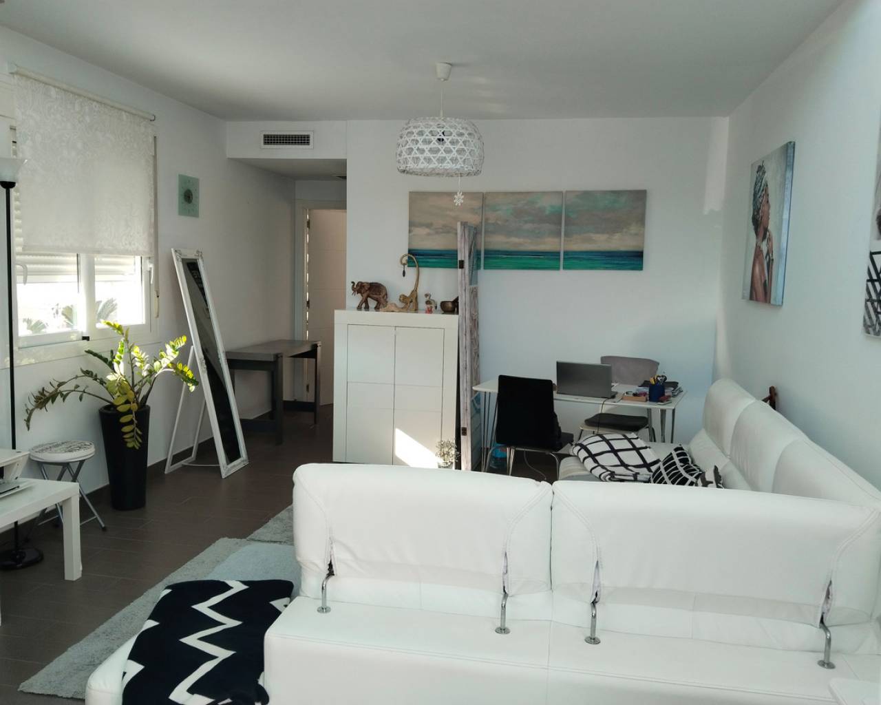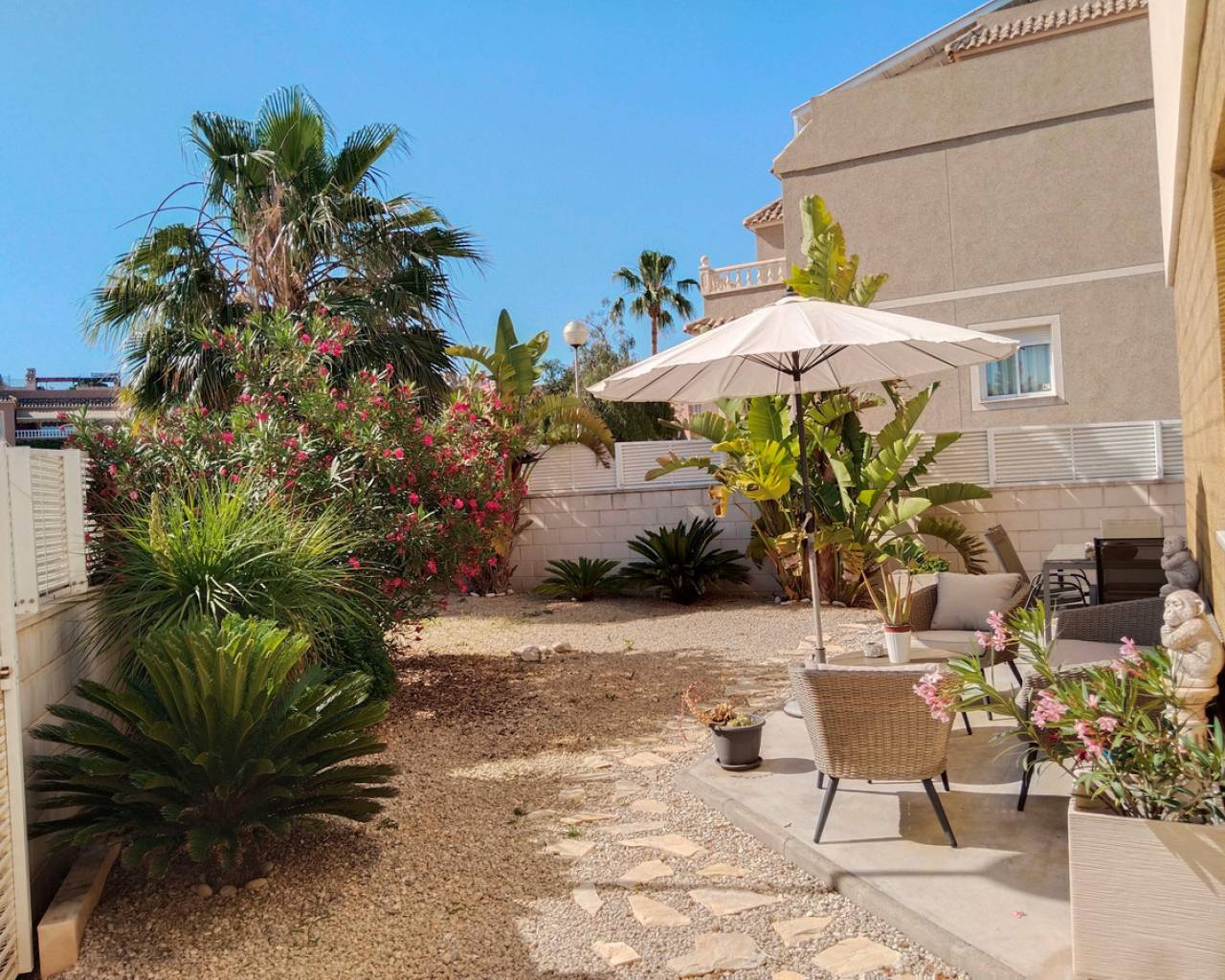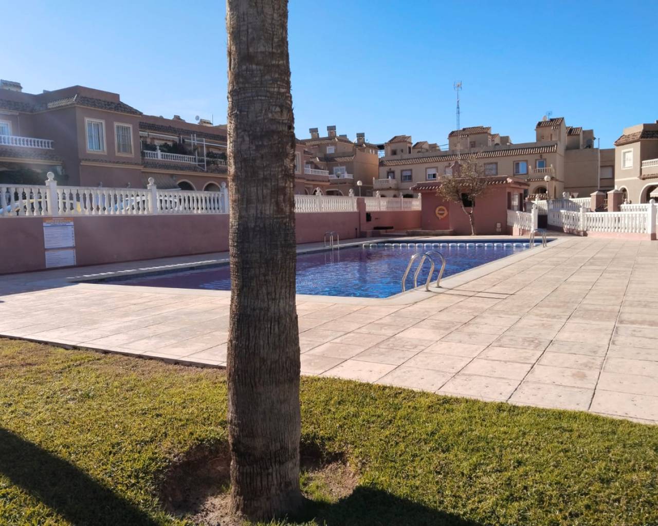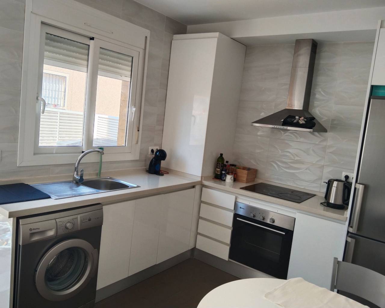 This corner positioned semi detached property is a rare opportunity to purchase one of the best positioned Vision models with the added bonus of an extra large garden. This modern property is ready to move in and the developers are still building this model in the area so it is like purchasing a new build property without having to wait a year for  the property to be finished. Other benifits include being offered for sale 10,000 euros cheaper then the new build price and has the kitchen appliances, air-conditioning and the garden landscaped included.. The Vision model offwers a comfortable energy efficient and,bright interior with a built area of over 75m2 and includes features such as thermal and acoustic ventilation in the roof and walls, ducted air.conditioning throughout and a heat pump hot water system reducing C02 emissions and 75% of the water is heated free, The devekopers design for this villa is flexible allowing distribution to suit the individual and the current owner chose a seperate kitchen but this can be easily reverted to make it open plan if you prefer. This corner position offers plenty of outside space even enough for a private pool to be installed if required. The orientation allows sunshine early right up until 3pm in the winter and 6pm in the summer and is ideal for enjoying your coffee on the terrace, BBQ or relaxing in the sun. Within walking distance of the Masa Square and the Gran Alacant comercial centre where you will find a French coffee shop, Italian restaurant, American diner, Spanish tapas, Chinese wok, KFC and Burger kIng, bars, gym, shops and 4 supermarkets including Aldi and Lidl. Gran Alacant is perfect location for living and visiitng it is a 10 minute drive to the airport, just 15km to Alicante city (there is a bus service), lovely long sandy beaches where you can walk to Santa Pola or to Alicante plus a nature reserve and nice hiking routes. Be quick to register your interest in this property.