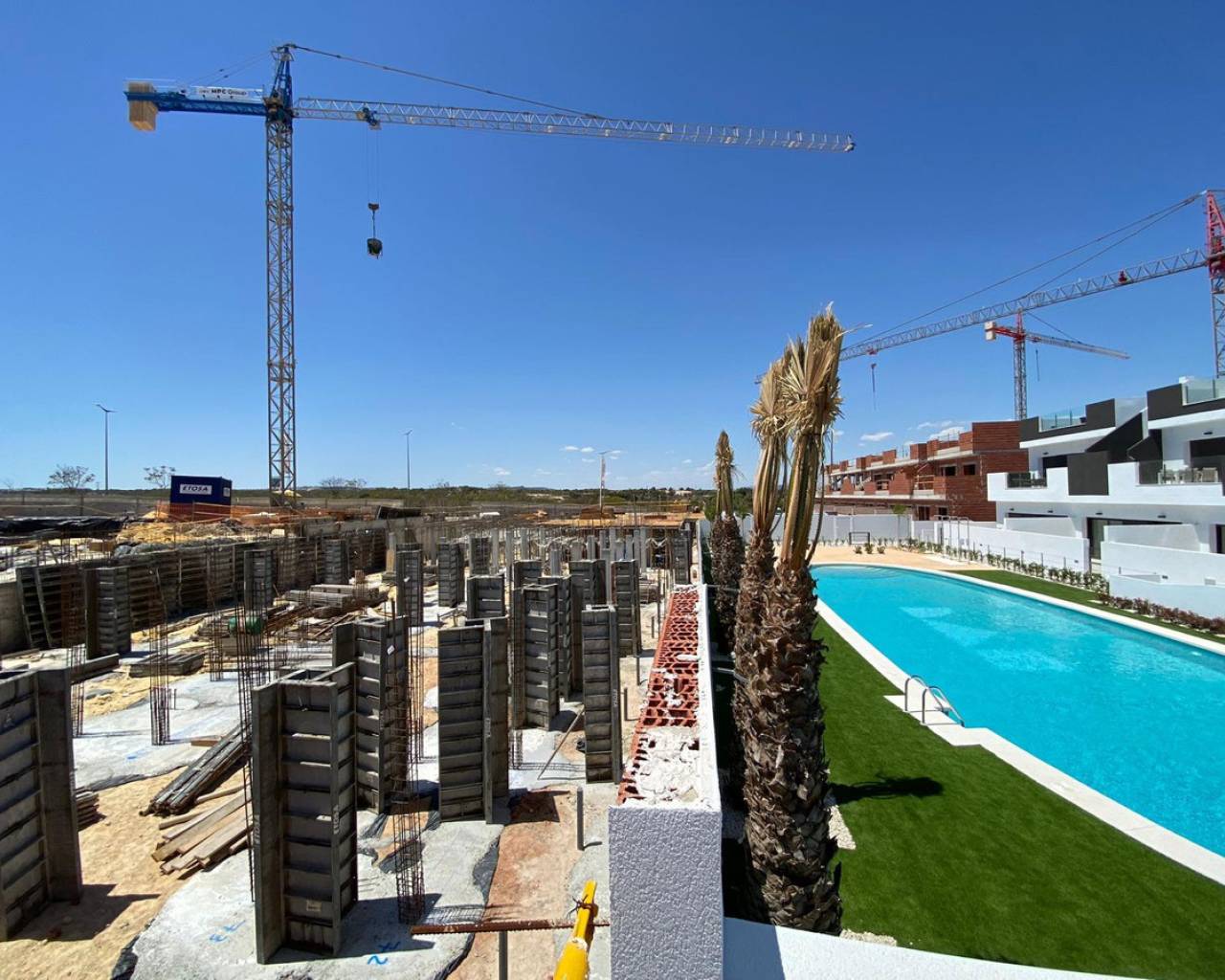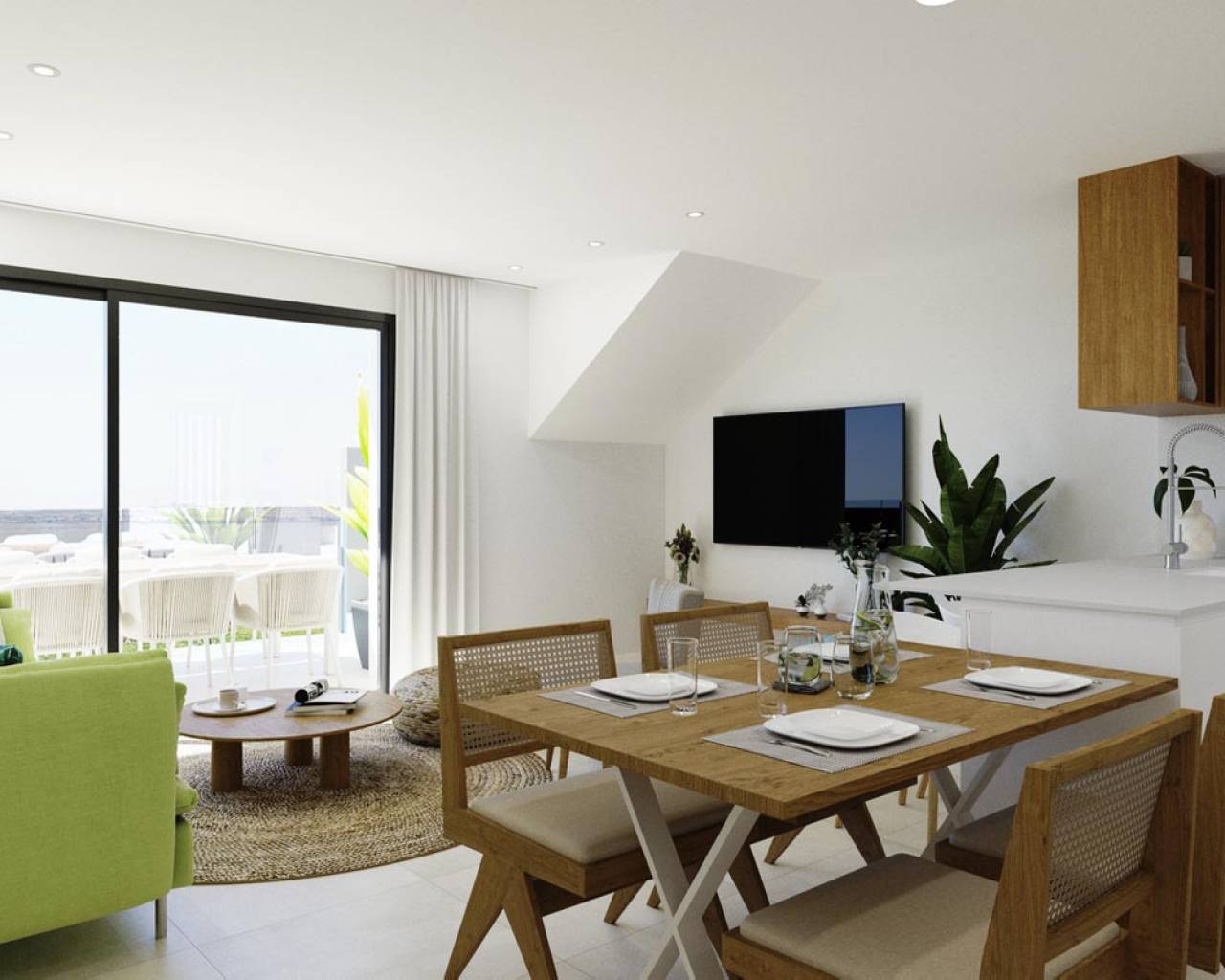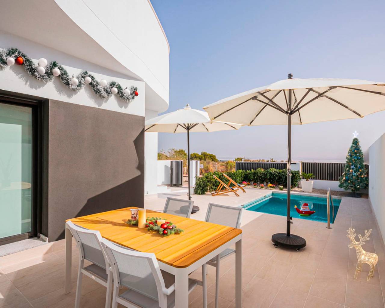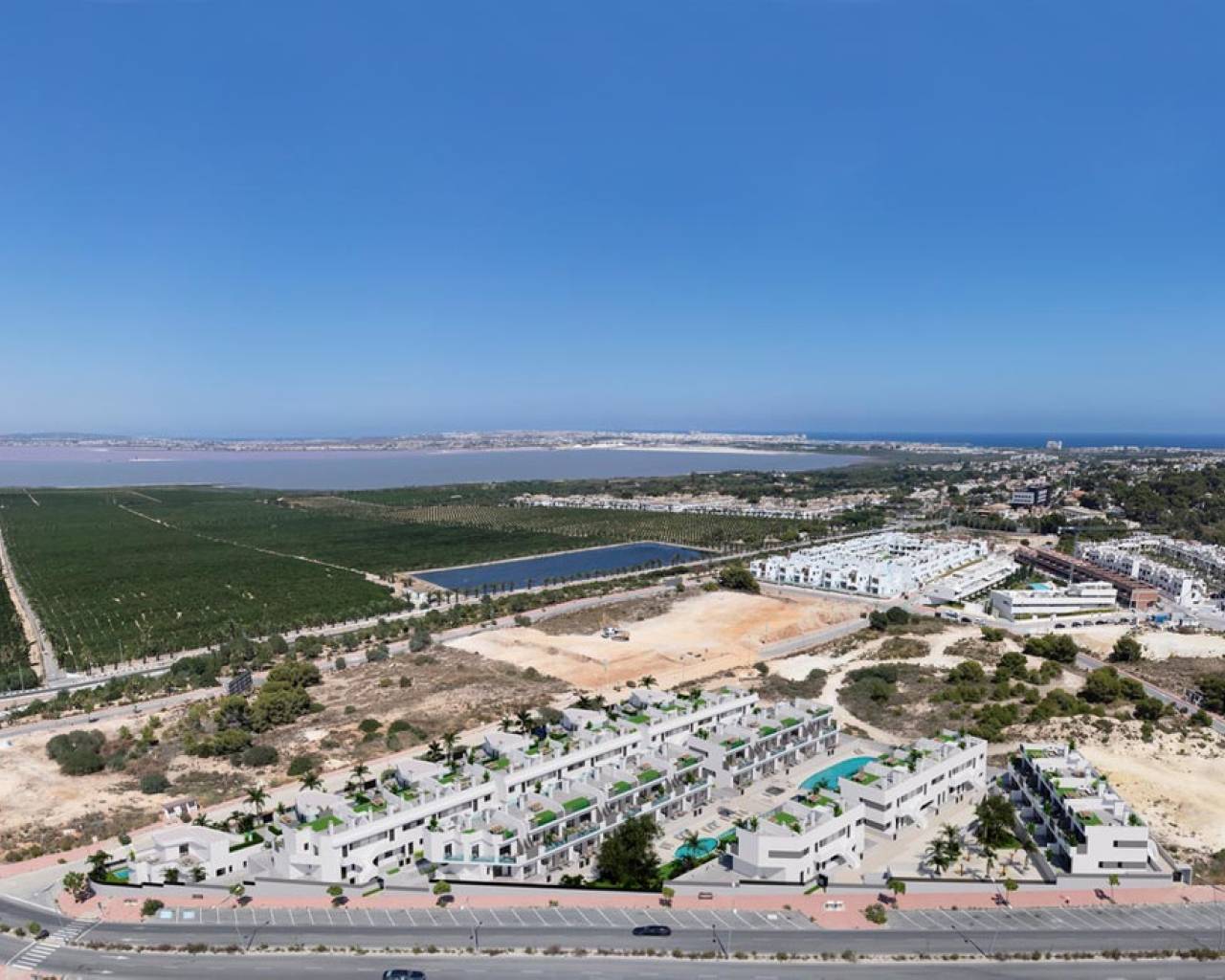 Some novels need to be read at a certain age, in a specific mood, and in the right context and atmosphere—not before, not after—in order to fully enjoy them and grasp their nuances. This is exactly what has happened with this project. The project you now see before you had already been in our minds many years ago, but for different reasons, the right moment had not yet arrived. Over time, it has incorporated elements and improvements that have enriched what was once only an idea. After this necessary process of maturation, we now see it become a reality of which we are tremendously proud. For us, living means appreciating and being part of the environment that surrounds us, for that is as important as the very cement that binds together the elements of a home. When we chose the name of this project and the green and pink colors, it was because we were fully aware that the stunning views of the Salada salt lake and the lemon trees are, in fact, one of the main values of these homes. Bright white houses, filled with natural light, clearly inspired by the Mediterranean lifestyle. At the same time, every detail has been carefully considered, even those not immediately visible, such as the materials and high-quality finishes used in construction—a reflection of our 30 years of experience building homes. If you finally choose our townhouses, you should select between havig views to the Salt lake Salada, or to the pool, and also between top or ground floor. Anyway, you will provide a fantastic house full of natural light, with an spacious living room joined to the kitchen. You will have the privilege of living in an exclusive residential complex with spacious communal areas: gardens, a garden-gym, playground, and of course, two large communal swimming pools—one for adults and the other for children. Ultimately, we offer you the opportunity to live the Mediterranean lifestyle and make it entirely yours. Because if we look closely, this development has nearly everything to become a small paradise with views of your new life.