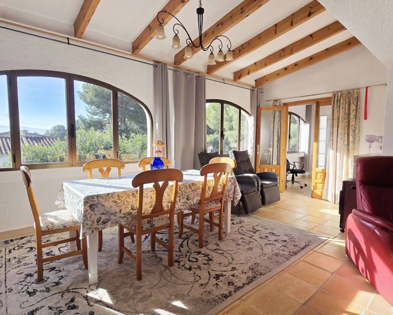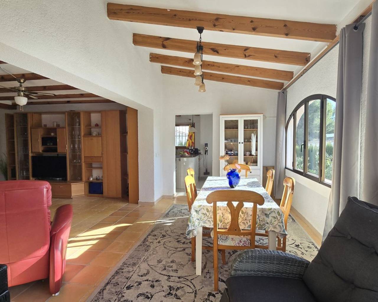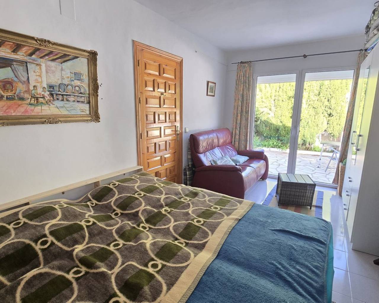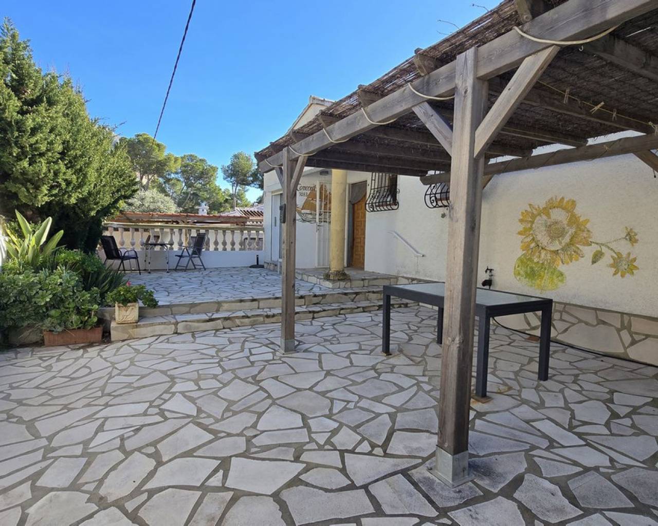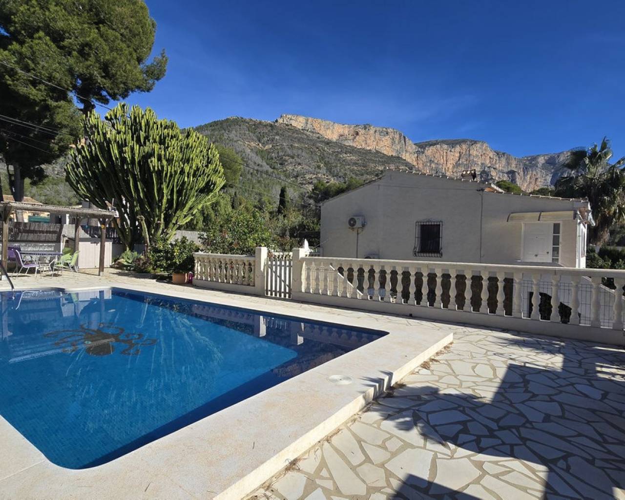 This quietly and sunny located villa offers a beautiful view of Montgó and impresses, among other things, with its location near the La Sella golf course as well as its good connections to Jávea, Jesús Pobre, and Denia. The house offers plenty of space, privacy, and flexible usage options – ideal for families, guests, or for combining living and renting. The main living area includes a spacious, open-plan living and dining area, a separate fully equipped kitchen with a small dining corner, three bedrooms with fitted wardrobes, and two bathrooms. A pellet stove provides pleasant warmth and atmosphere, the majority of the windows are double-glazed, and two of the bedrooms are equipped with air conditioning. The lower level features a separate apartment with three bedrooms, a living room, a kitchen, and a bathroom – ideal for visitors or as a completely self-contained living unit. The upper living area is easily accessible from the higher road, while the lower living space with the separate apartment has its own access via the lower road. This creates two independent, well-accessible areas with optimal privacy and flexible usage. Furthermore, the villa offers a private pool, sunny terraces, a carport on both the upper and lower floors, as well as generous storage rooms. It has good structural insulation, and the installations are easily accessible in the basement, facilitating maintenance and any adjustments. A versatile villa in a very good location where the quiet surroundings and beautiful mountain view provide a pleasant living environment.