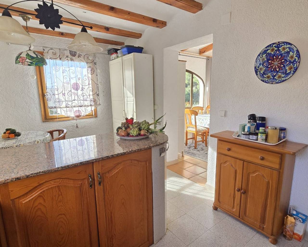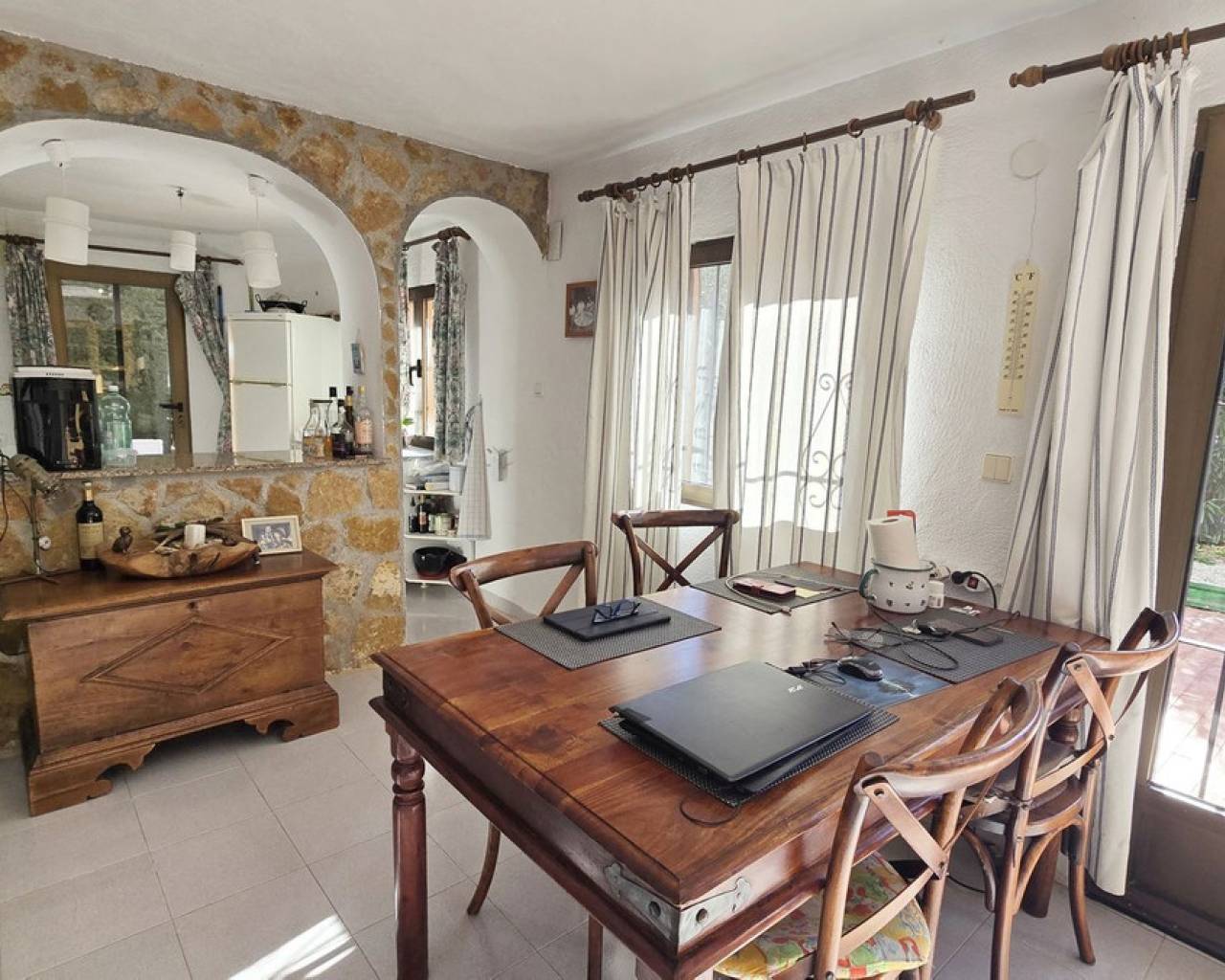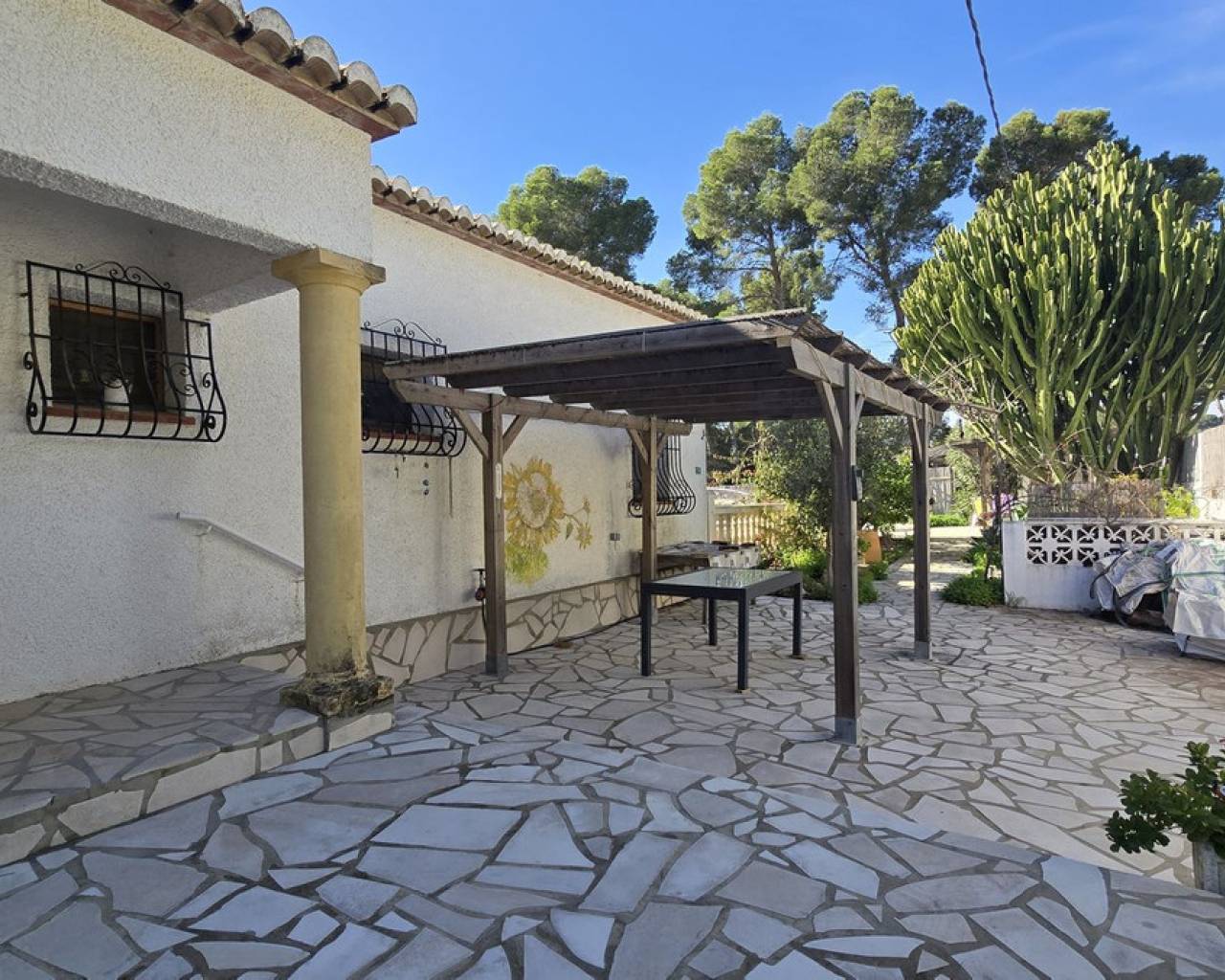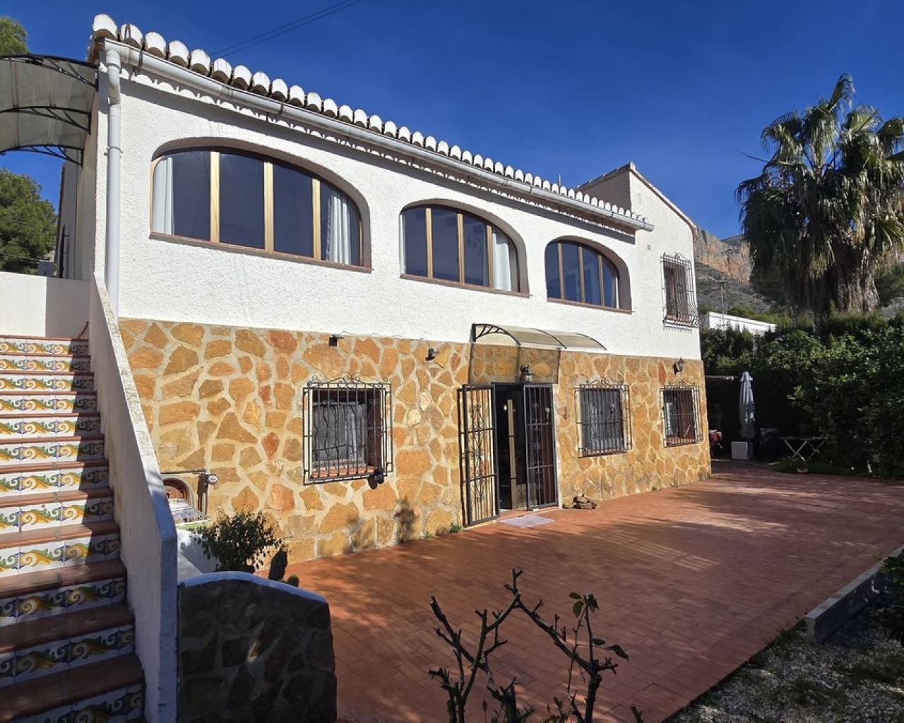 This quietly and sunny located villa offers a beautiful view of Montgó and impresses, among other things, with its location near the La Sella golf course as well as its good connections to Jávea, Jesús Pobre, and Denia. The house offers plenty of space, privacy, and flexible usage options – ideal for families, guests, or for combining living and renting. The main living area includes a spacious, open-plan living and dining area, a separate fully equipped kitchen with a small dining corner, three bedrooms with fitted wardrobes, and two bathrooms. A pellet stove provides pleasant warmth and atmosphere, the majority of the windows are double-glazed, and two of the bedrooms are equipped with air conditioning. The lower level features a separate apartment with three bedrooms, a living room, a kitchen, and a bathroom – ideal for visitors or as a completely self-contained living unit. The upper living area is easily accessible from the higher road, while the lower living space with the separate apartment has its own access via the lower road. This creates two independent, well-accessible areas with optimal privacy and flexible usage. Furthermore, the villa offers a private pool, sunny terraces, a carport on both the upper and lower floors, as well as generous storage rooms. It has good structural insulation, and the installations are easily accessible in the basement, facilitating maintenance and any adjustments. A versatile villa in a very good location where the quiet surroundings and beautiful mountain view provide a pleasant living environment.