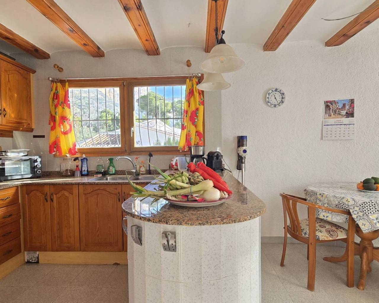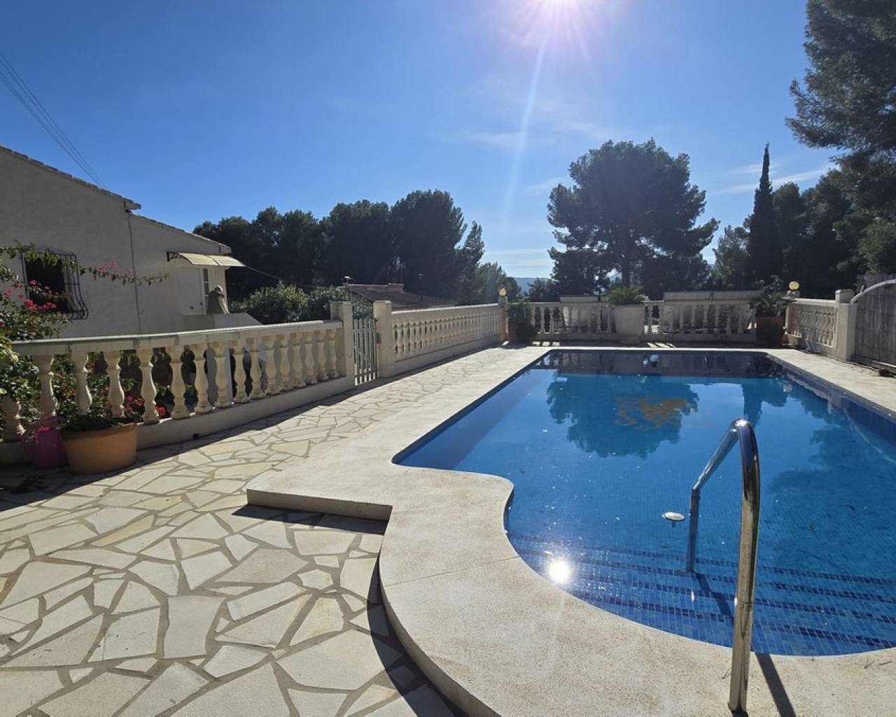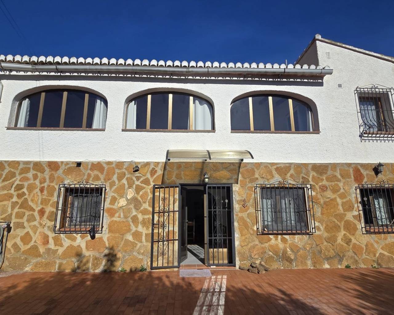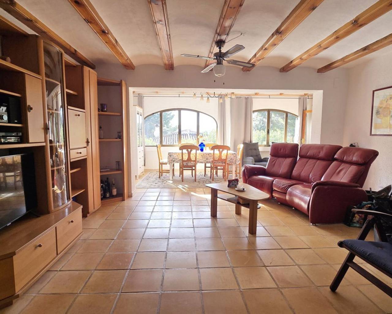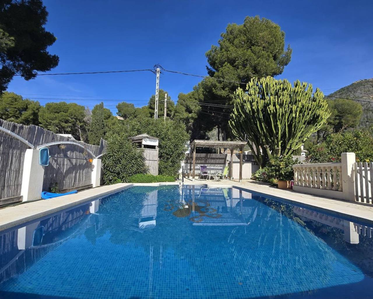 This quietly and sunny located villa offers a beautiful view of Montgó and impresses, among other things, with its location near the La Sella golf course as well as its good connections to Jávea, Jesús Pobre, and Denia. The house offers plenty of space, privacy, and flexible usage options – ideal for families, guests, or for combining living and renting. The main living area includes a spacious, open-plan living and dining area, a separate fully equipped kitchen with a small dining corner, three bedrooms with fitted wardrobes, and two bathrooms. A pellet stove provides pleasant warmth and atmosphere, the majority of the windows are double-glazed, and two of the bedrooms are equipped with air conditioning. The lower level features a separate apartment with three bedrooms, a living room, a kitchen, and a bathroom – ideal for visitors or as a completely self-contained living unit. The upper living area is easily accessible from the higher road, while the lower living space with the separate apartment has its own access via the lower road. This creates two independent, well-accessible areas with optimal privacy and flexible usage. Furthermore, the villa offers a private pool, sunny terraces, a carport on both the upper and lower floors, as well as generous storage rooms. It has good structural insulation, and the installations are easily accessible in the basement, facilitating maintenance and any adjustments. A versatile villa in a very good location where the quiet surroundings and beautiful mountain view provide a pleasant living environment.
