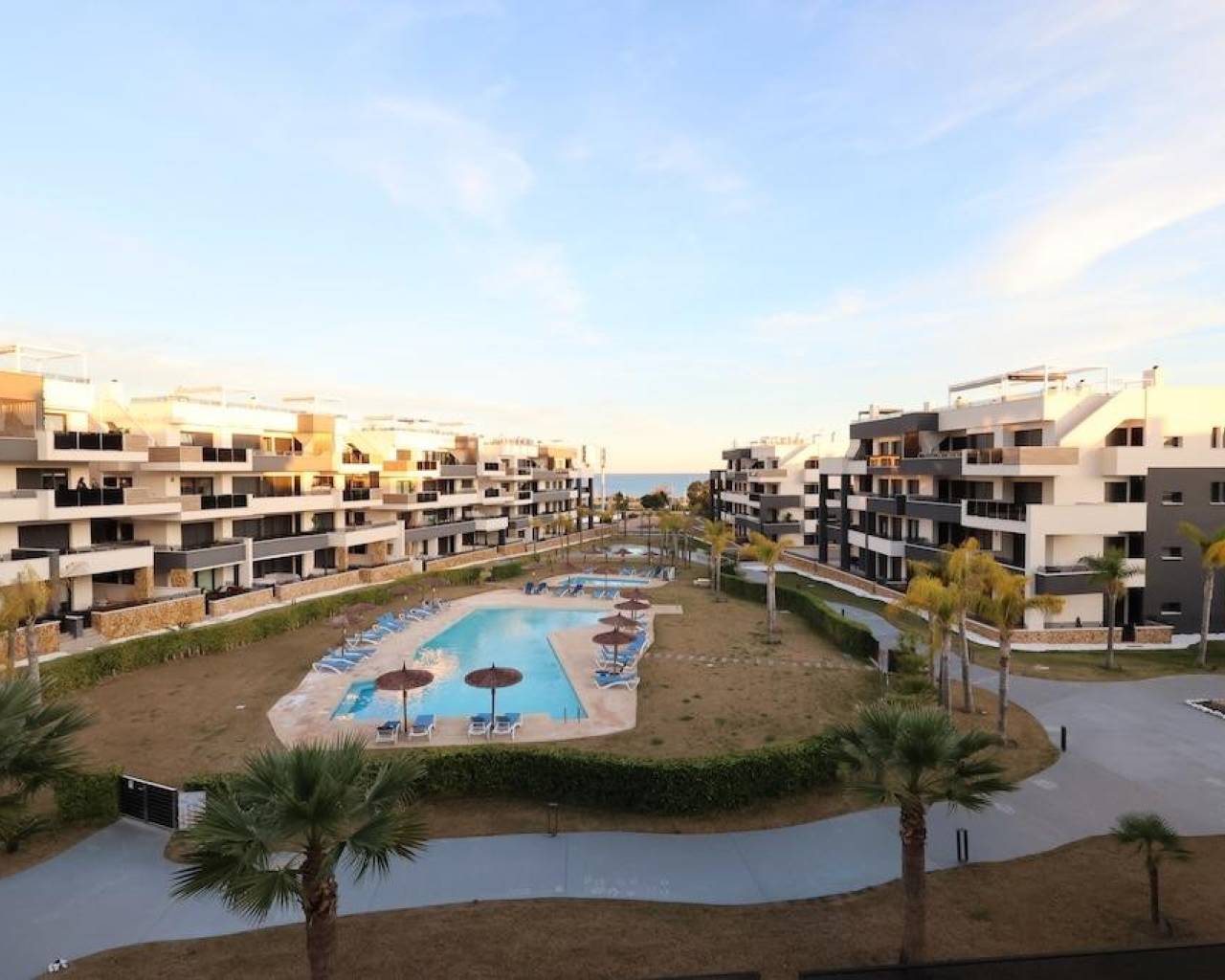 Playa Flamenca, Residencial Amanecer de Luxe: Second-floor apartment (81 m2) with sea and pool views. Features 2 bedrooms, 2 bathrooms (1 en-suite), and an open-plan kitchen/living area leading to a large terrace. Includes storage, garage, and access to a gym and BBQ area. Sold fully furnished.
