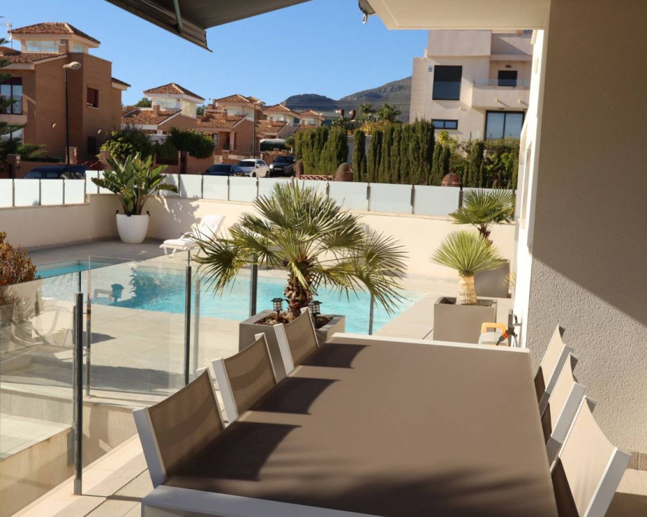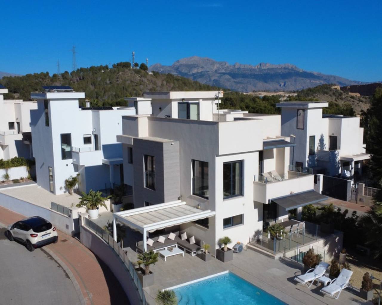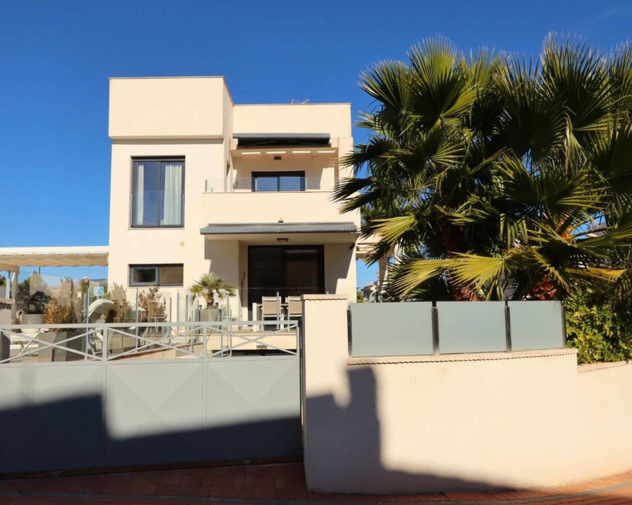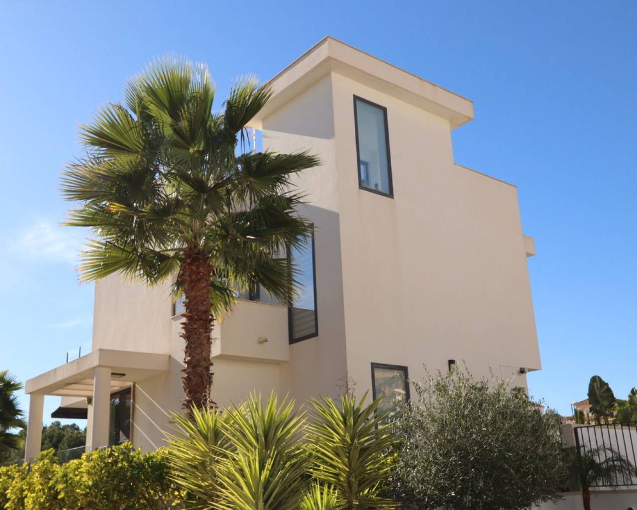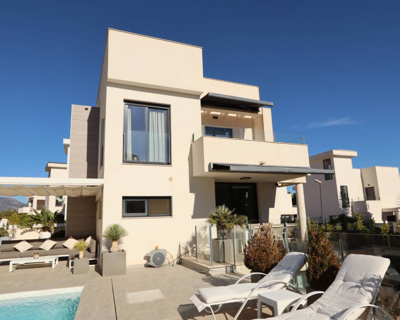 Discover this sophisticated contemporary villa located in the prestigious Coloma neighborhood of La Nucía. Built in 2019 and facing south, it offers a modern lifestyle surrounded by tranquility, with spectacular open views of the sea, mountains, and city. The property features 205 m² of living space and 233 m² built on a plot of 390 m². It has 3 spacious bedrooms and 3 elegant bathrooms, making it an ideal home for families or those seeking a modern residence with large, bright spaces. The heart of the house is its open-plan living room, connected to a fully equipped kitchen with Siemens and Bosch appliances. Large windows and terraces provide a fantastic connection to the outdoors, where a lovely garden and a private pool create the perfect atmosphere for relaxation and enjoying the Mediterranean climate. The home offers exceptional comfort year-round thanks to centralized air conditioning, shutters, double glazing, and security alarm. Additionally, it has pre-installation for a jacuzzi and outdoor kitchen, as well as the possibility of adding solar panels. One of the highlights is its large basement, a versatile space ideal for a gym, cinema room, or even an independent studio, as it can be created with a separate entrance. It also includes laundry room, pantry, walk-in closet, storage room, and private parking. Located in one of the most sought-after areas of La Nucía, the villa combines privacy and convenience. Shopping centers, schools, restaurants, and leisure spaces are just a few minutes away, and the beach is only 6.5 km away. Alicante Airport is approximately 60 km away. A modern, elegant property ready to enjoy: Mediterranean luxury at its finest. Would you like to visit? We are at your disposal to arrange a visit and show you every detail.