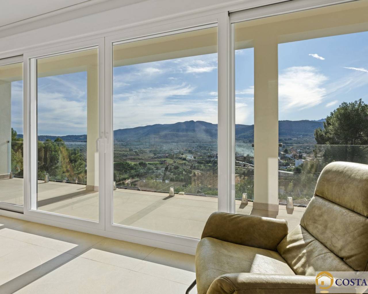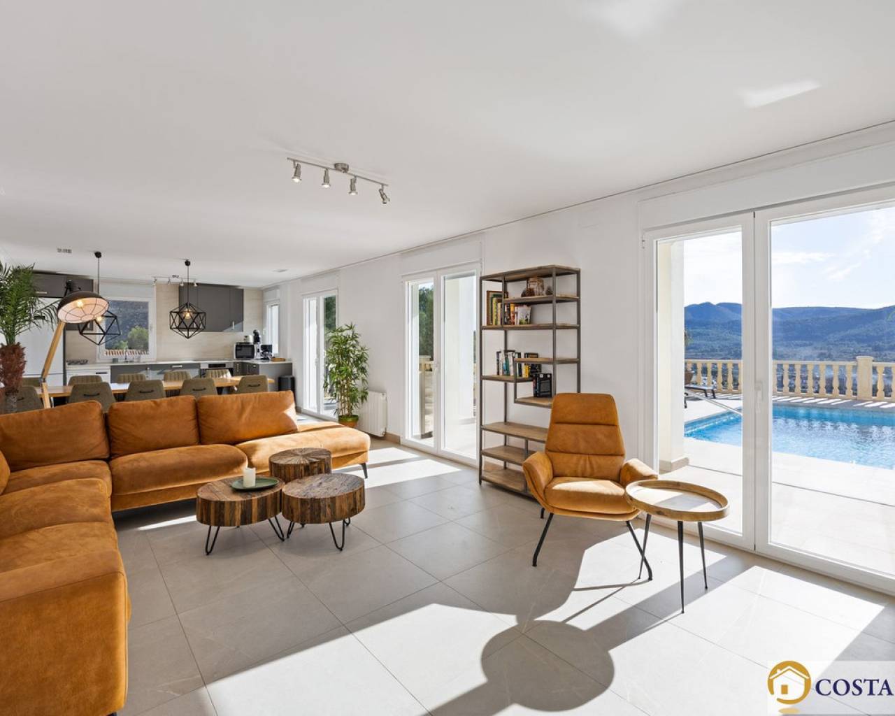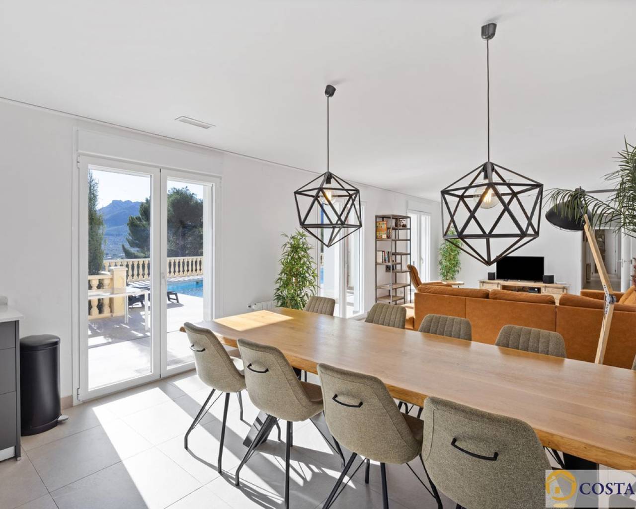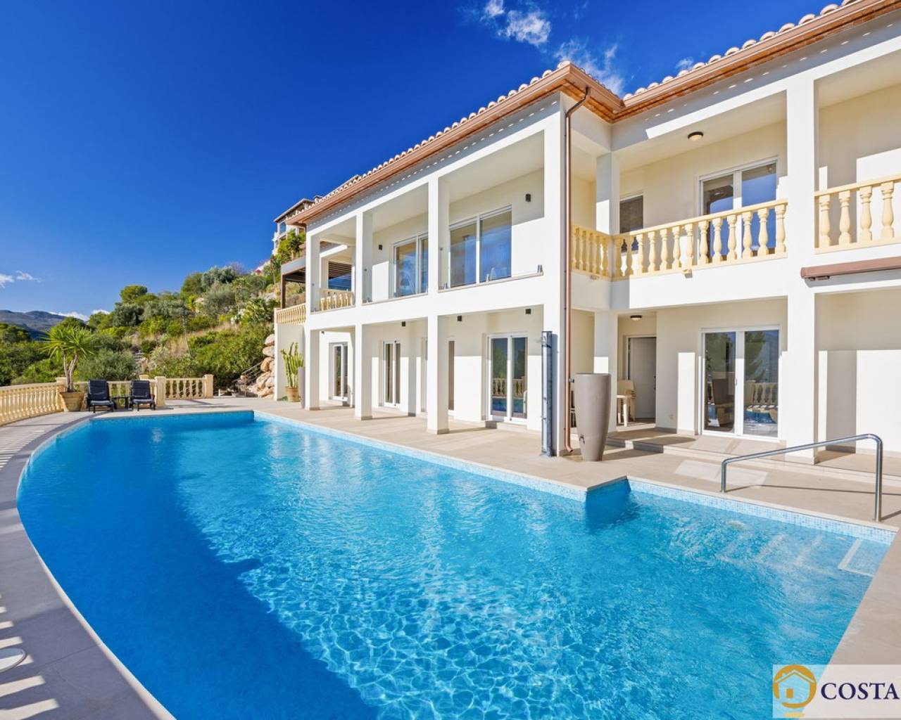 Unique, spacious villa with panoramic views in Alcalalí This beautiful, modern and elegant villa is located on a sunny, south-facing hill with a breathtaking panoramic view over the valley. Combining timeless luxury with exceptional space and light, the property is located a short walk from the amenities of the village. The beautiful beaches of Calpe can be reached in just 20 minutes by car. PLOT The asking price includes two plots: the main plot of 1,468 m² on which the villa stands, and an adjacent building plot of 844 m² where an additional house can be realized. In total, more than 2,300m2. For buyers who are only interested in the plot with the existing villa, we are open to consultation. LAYOUT - MAIN FLOOR Through an electric gate you reach spacious, secure parking and the stately entrance. The generous reception hall leads to an impressive open plan living and dining room of approx. 80 m² with large windows and direct access to a sun terrace. The luxurious, fully equipped kitchen connects to an attractive, covered naya/chill-out patio for al fresco dining. Adjacent is a practical utility room. On this floor there are also: a large master suite with fitted wardrobes, hot/cold air conditioning, private balcony and a spacious en-suite bathroom with walk-in shower; two additional bedroom suites with fitted wardrobes, hot/cold air conditioning and access to sun terraces; a separate guest toilet. POOL LEVEL - GUEST APARTMENT An internal lift or staircase connects to the pool level where there is a fully self-contained apartment. Here you will find an open plan living/dining kitchen of approx. 50 m² with three double patio doors leading out to the pool terrace. Furthermore: a spacious bedroom suite with en-suite shower, fitted wardrobes and direct access to the pool terrace; three double bedrooms, also with fitted wardrobes, hot/cold air conditioning and patio doors; a large family bathroom with walk-in shower, a guest toilet, utility room and a very spacious storage room. OUTDOOR LIVING The outside area is nothing short of spectacular: an 15 x 6.5 metre swimming pool, approximately 200 m² of sun terraces, an outdoor shower and beautifully landscaped, low-maintenance Mediterranean gardens—all designed to maximise the sun, privacy and views. COMFORT Electric underfloor heating via heat pump Full hot/cold air conditioning in all areas Electrically operated roller shutters Spacious, secure parking INVESTMENT The property has a tourist license, which can be renewed in the name of the new owner and is therefore excellent as a spacious family villa and as a high-quality investment opportunity. ALCALALI Alcalalí is a charming and authentic Spanish village in the beloved Jalon Valley (Marina Alta), known for its peace, nature and warm village atmosphere. In the historic center you will find cozy squares, local restaurants, cafes, a bakery, small shops and various basic amenities. The village is also known for its walking and cycling routes, the almond blossom in spring and the strong sense of community with both Spanish and international residents. A major plus of this villa is its exceptional location within walking distance of the village center. That means: walking to the bakery or a coffee in the square in the morning, dining in a local restaurant in the evening – without needing the car – while enjoying complete peace, privacy and spectacular views at home. This combination of free living with panorama, walking distance to amenities and a short drive to the beaches of Calpe makes the house particularly attractive for both permanent residence and (luxury) rental.