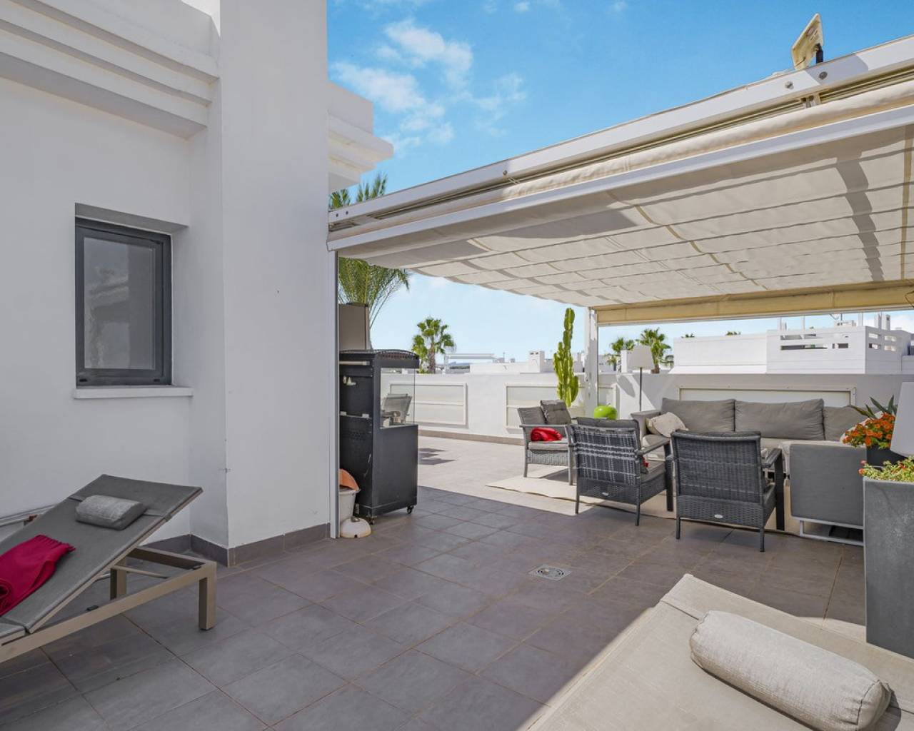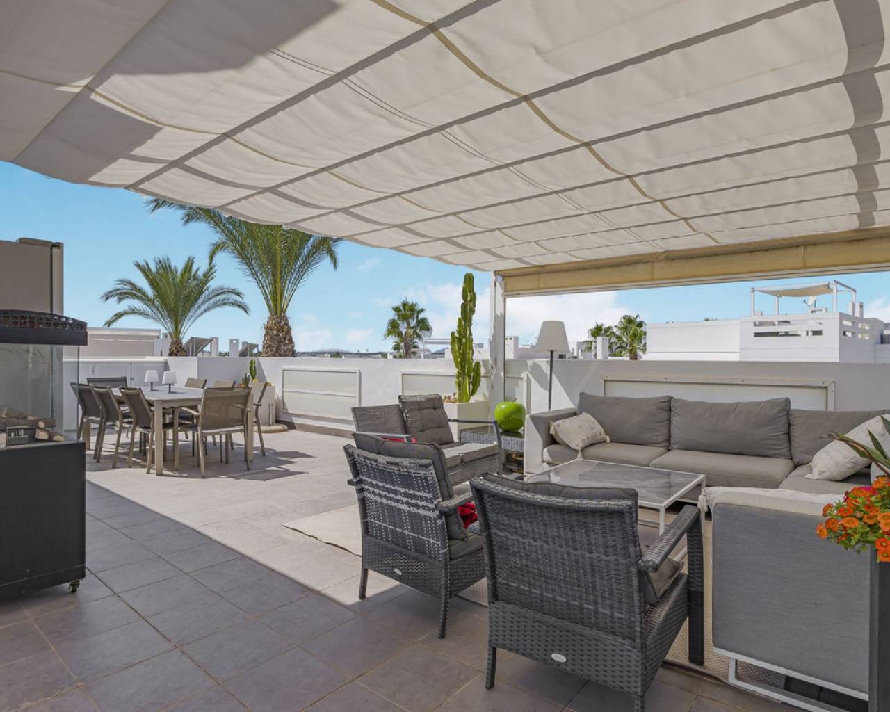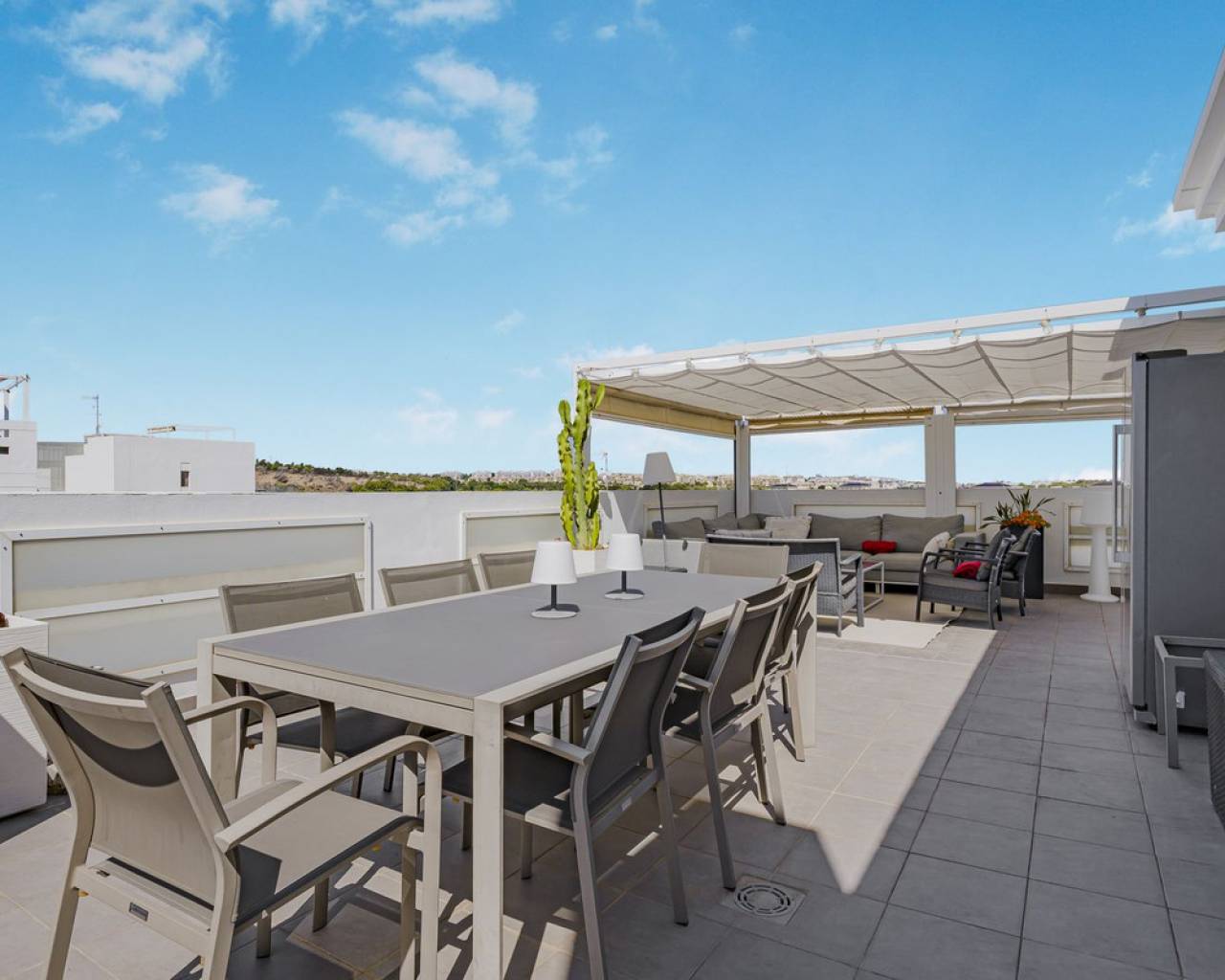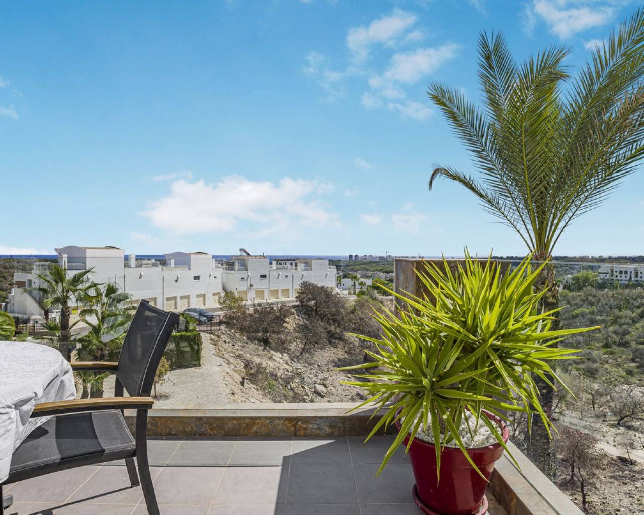 This home is situated on the first floor of the sought-after Danubio 1 complex in Las Ramblas and offers a total living space of 97.3 m² spread over two levels. On the main floor you are welcomed by a bright and generous living area with direct access to a charming terrace of almost 12 m². The floor also features a fully equipped kitchen, two well-lit bedrooms and a bathroom. An internal staircase leads to the upper level, which can easily be used as a third bedroom, home office or hobby room. From this level you access the impressive private roof terrace of 79 m², offering open views, sunshine throughout the day and ample space for relaxation, social gatherings and enjoyable barbecue evenings. The property is accessed via a shared entrance with staircases leading to the central part of the floor, ensuring both privacy and security. From the home you can enjoy beautiful views over green surroundings and the golf course, with the Mediterranean Sea visible on the horizon. The area is peaceful and scenic, with green spaces, walking paths and stunning views, while still being just minutes from the beaches of Campoamor and Cabo Roig. The popular La Zenia Boulevard shopping center, restaurants, services and good transport connections are also nearby. This is a rare opportunity to purchase a property in one of the most desirable areas of Orihuela Costa, ideal as a permanent home, holiday residence or investment.