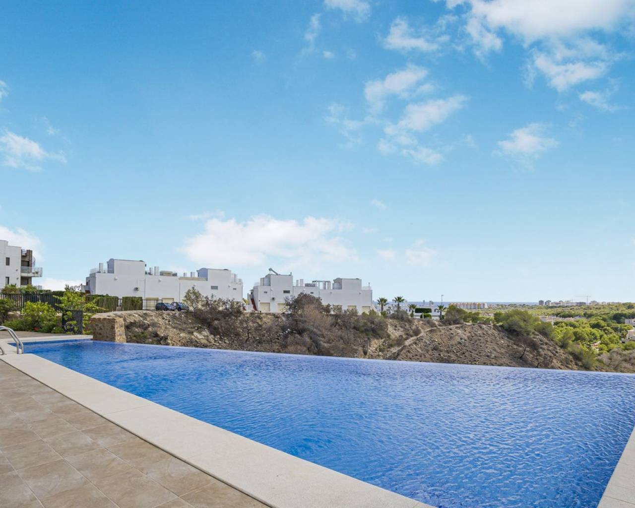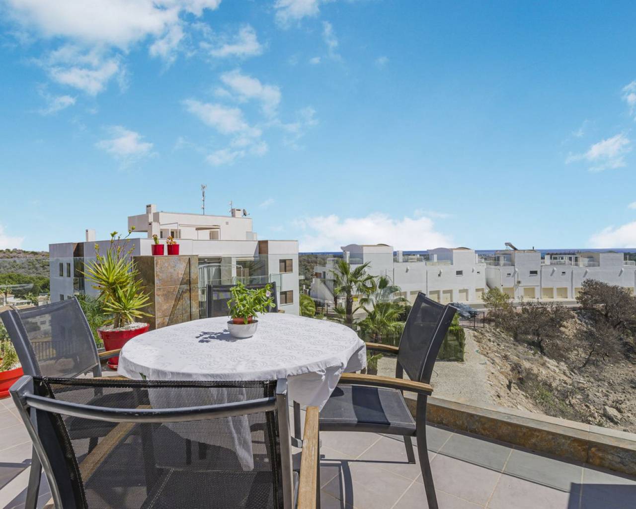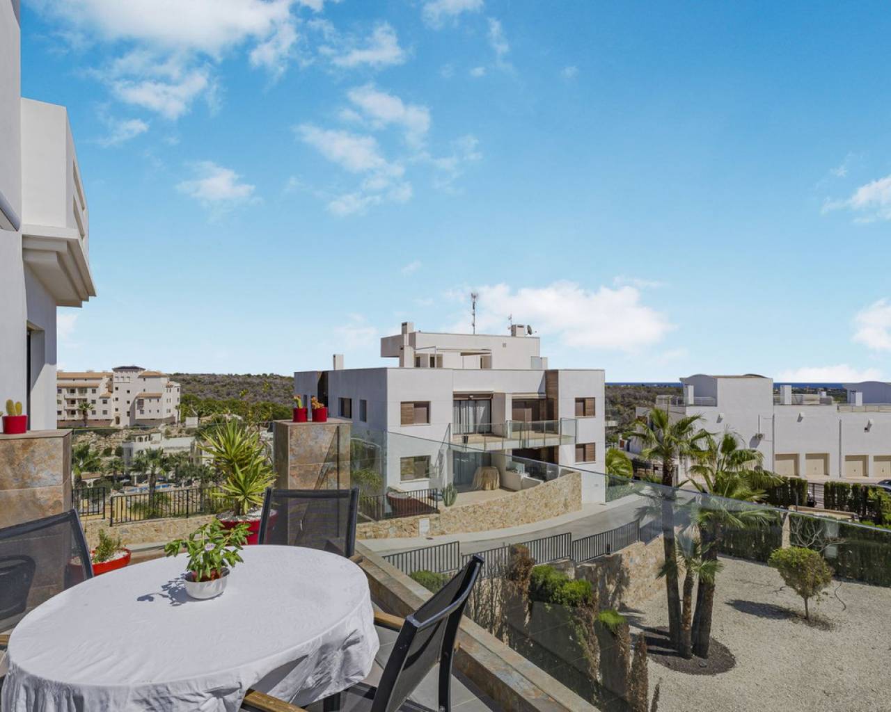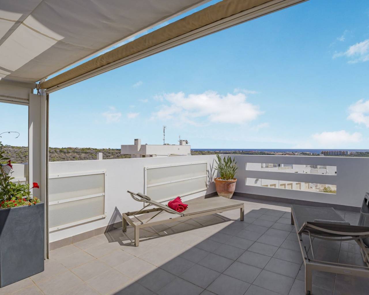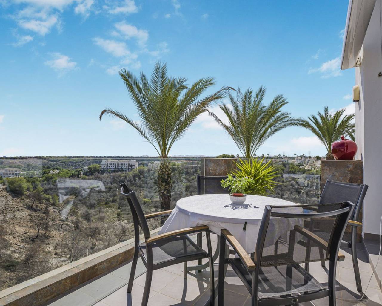 This home is situated on the first floor of the sought-after Danubio 1 complex in Las Ramblas and offers a total living space of 97.3 m² spread over two levels. On the main floor you are welcomed by a bright and generous living area with direct access to a charming terrace of almost 12 m². The floor also features a fully equipped kitchen, two well-lit bedrooms and a bathroom. An internal staircase leads to the upper level, which can easily be used as a third bedroom, home office or hobby room. From this level you access the impressive private roof terrace of 79 m², offering open views, sunshine throughout the day and ample space for relaxation, social gatherings and enjoyable barbecue evenings. The property is accessed via a shared entrance with staircases leading to the central part of the floor, ensuring both privacy and security. From the home you can enjoy beautiful views over green surroundings and the golf course, with the Mediterranean Sea visible on the horizon. The area is peaceful and scenic, with green spaces, walking paths and stunning views, while still being just minutes from the beaches of Campoamor and Cabo Roig. The popular La Zenia Boulevard shopping center, restaurants, services and good transport connections are also nearby. This is a rare opportunity to purchase a property in one of the most desirable areas of Orihuela Costa, ideal as a permanent home, holiday residence or investment.