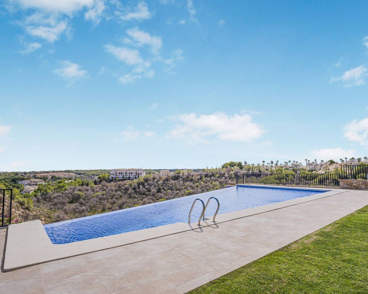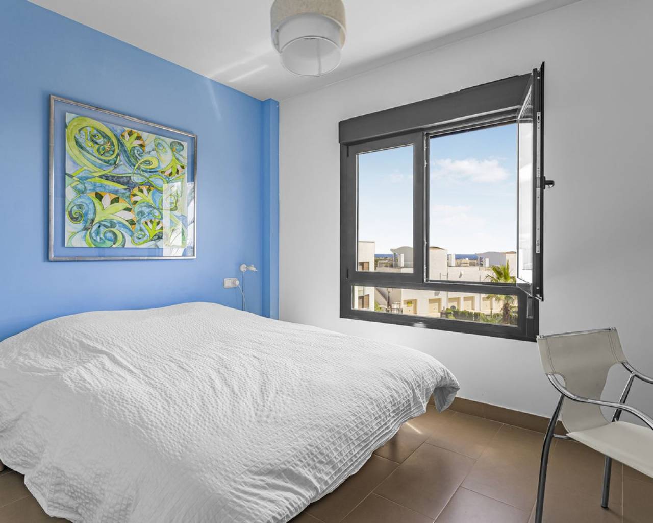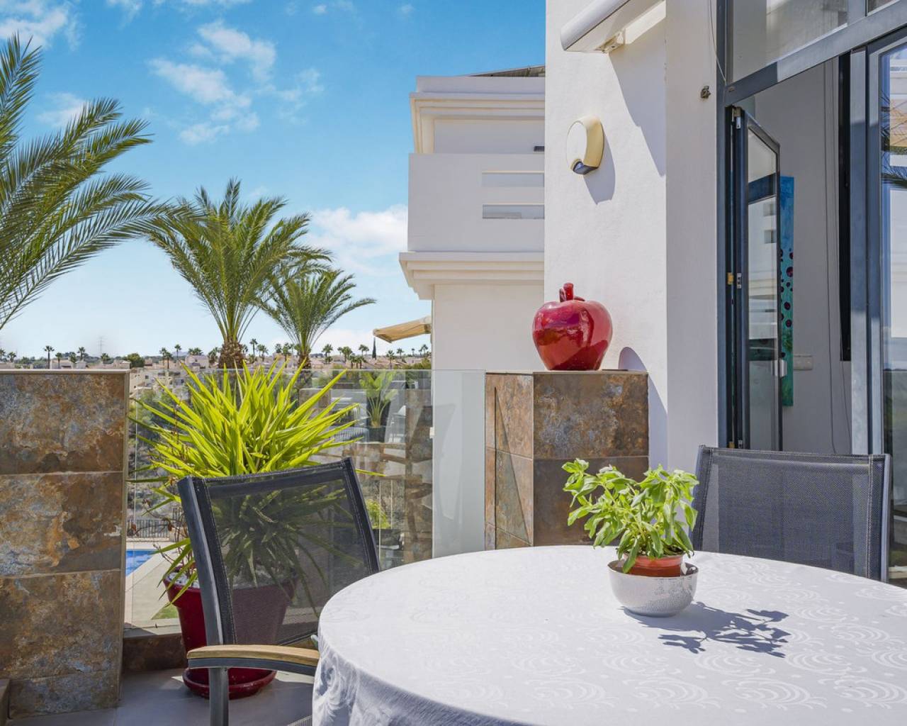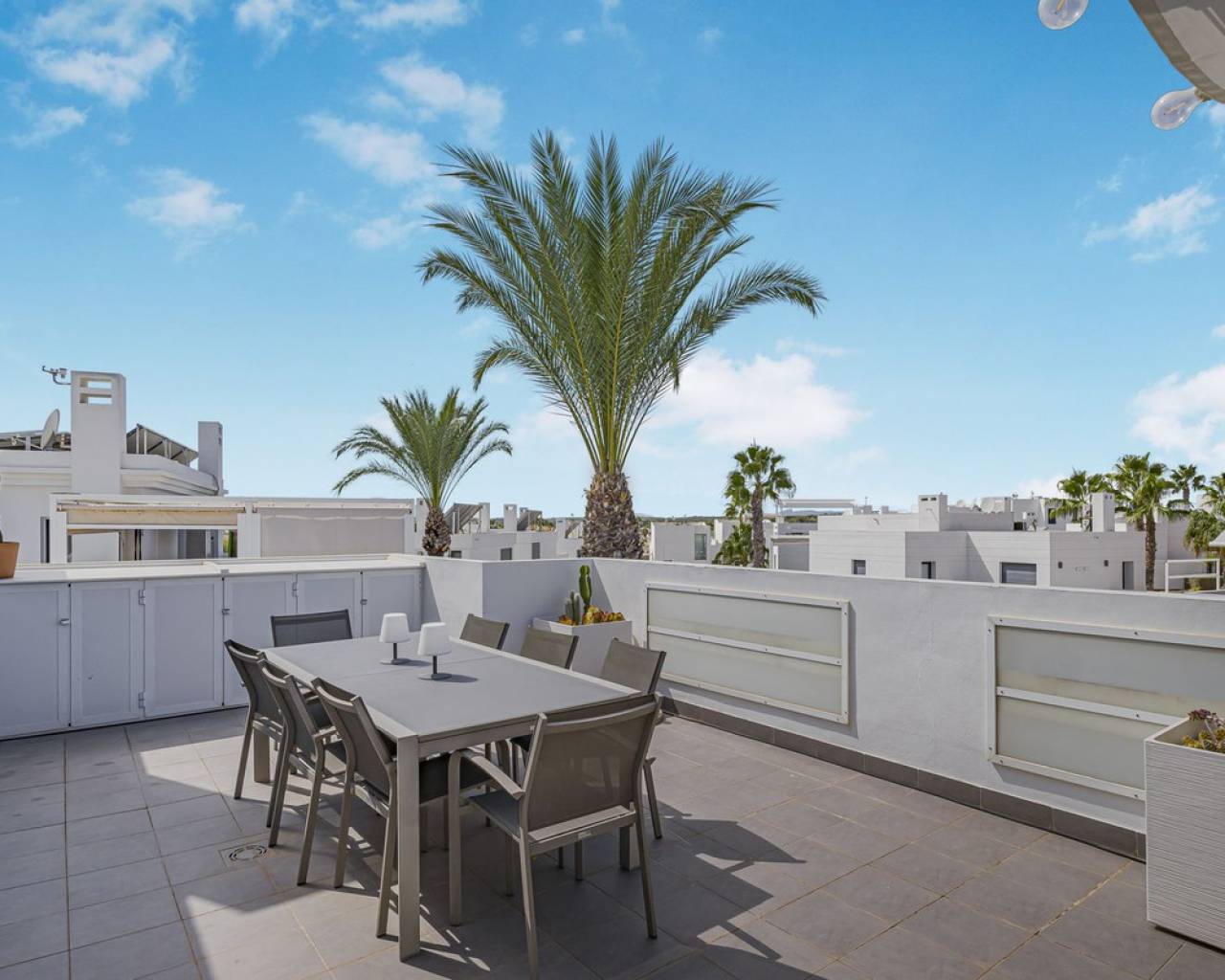 This home is situated on the first floor of the sought-after Danubio 1 complex in Las Ramblas and offers a total living space of 97.3 m² spread over two levels. On the main floor you are welcomed by a bright and generous living area with direct access to a charming terrace of almost 12 m². The floor also features a fully equipped kitchen, two well-lit bedrooms and a bathroom. An internal staircase leads to the upper level, which can easily be used as a third bedroom, home office or hobby room. From this level you access the impressive private roof terrace of 79 m², offering open views, sunshine throughout the day and ample space for relaxation, social gatherings and enjoyable barbecue evenings. The property is accessed via a shared entrance with staircases leading to the central part of the floor, ensuring both privacy and security. From the home you can enjoy beautiful views over green surroundings and the golf course, with the Mediterranean Sea visible on the horizon. The area is peaceful and scenic, with green spaces, walking paths and stunning views, while still being just minutes from the beaches of Campoamor and Cabo Roig. The popular La Zenia Boulevard shopping center, restaurants, services and good transport connections are also nearby. This is a rare opportunity to purchase a property in one of the most desirable areas of Orihuela Costa, ideal as a permanent home, holiday residence or investment.