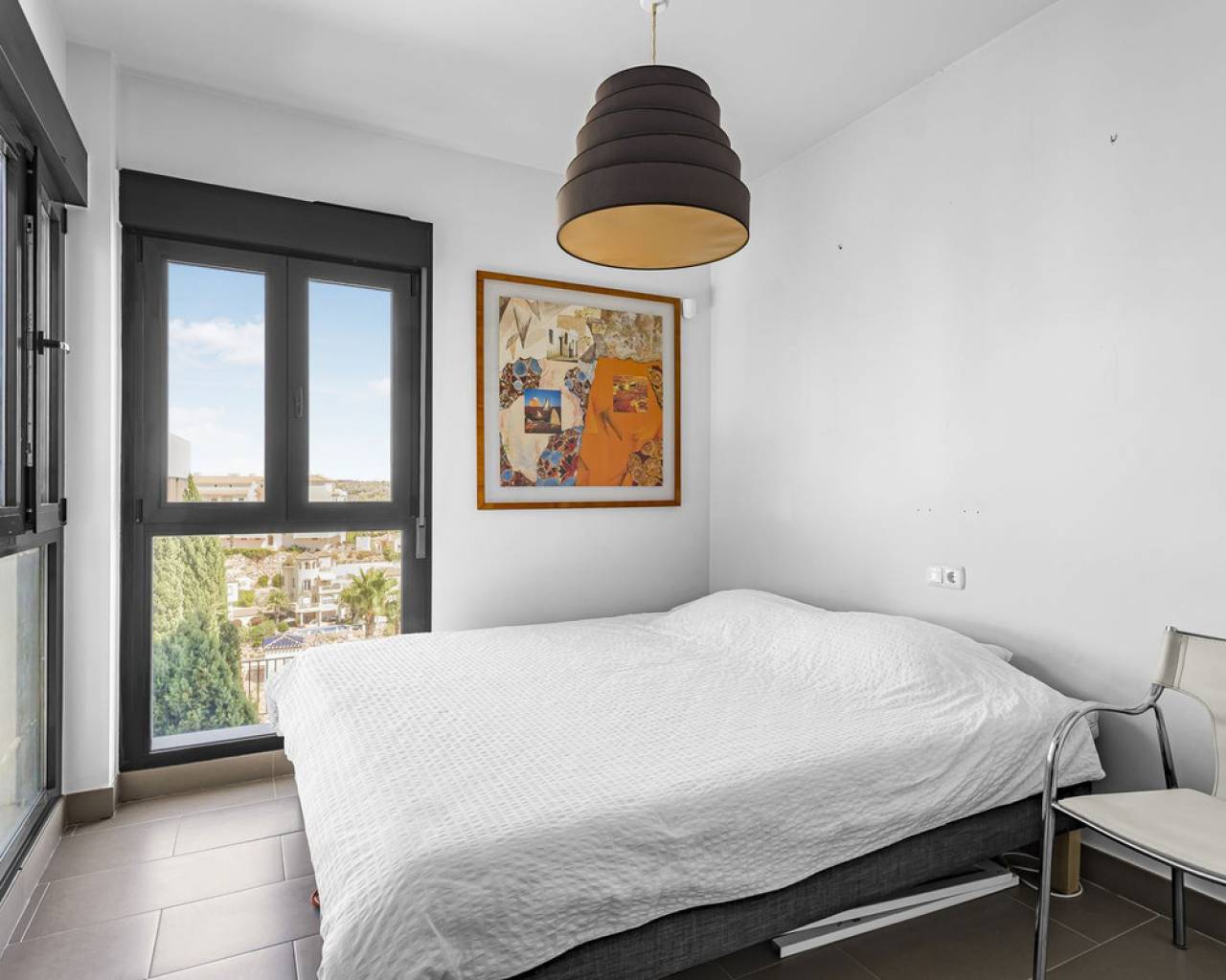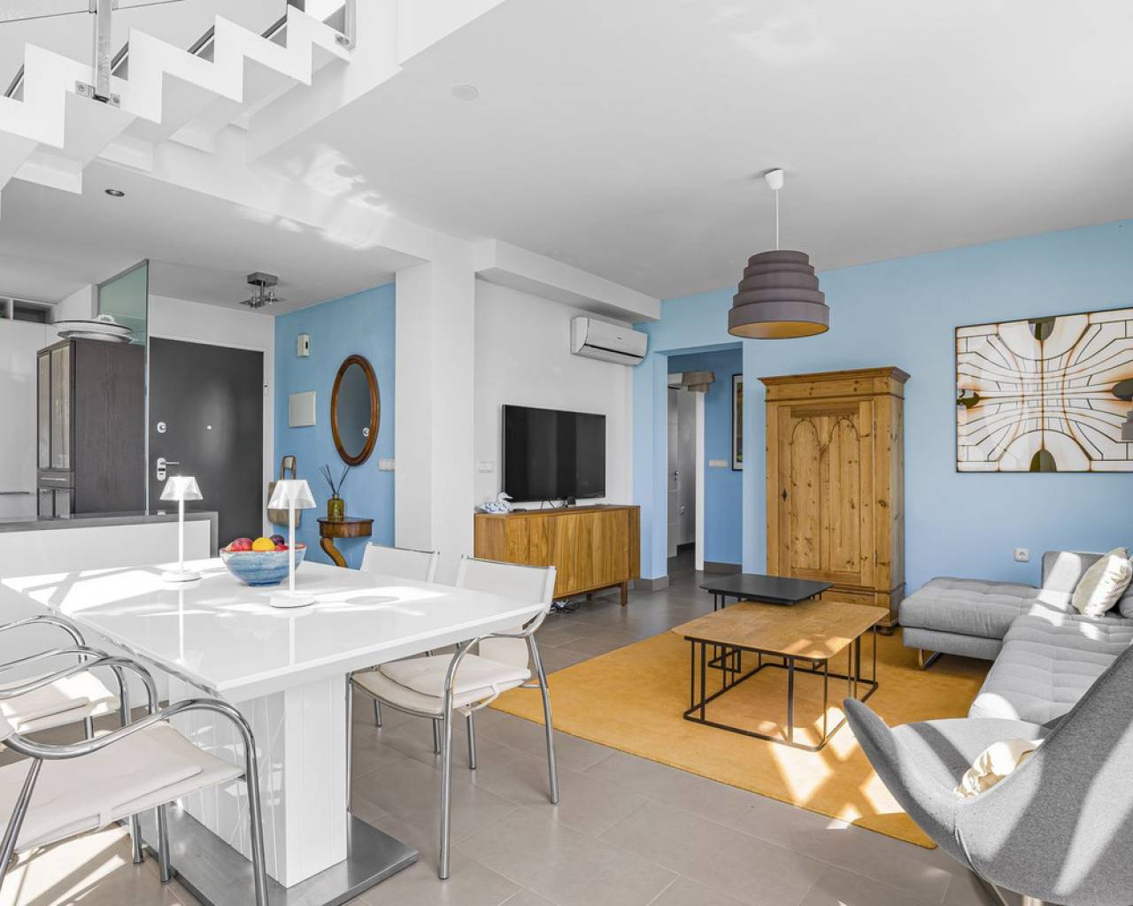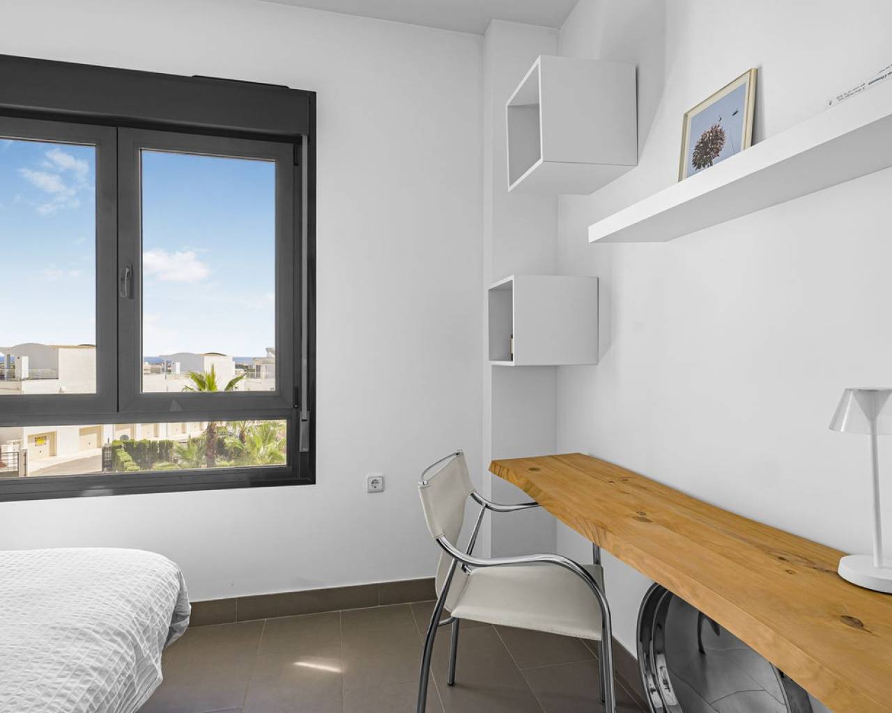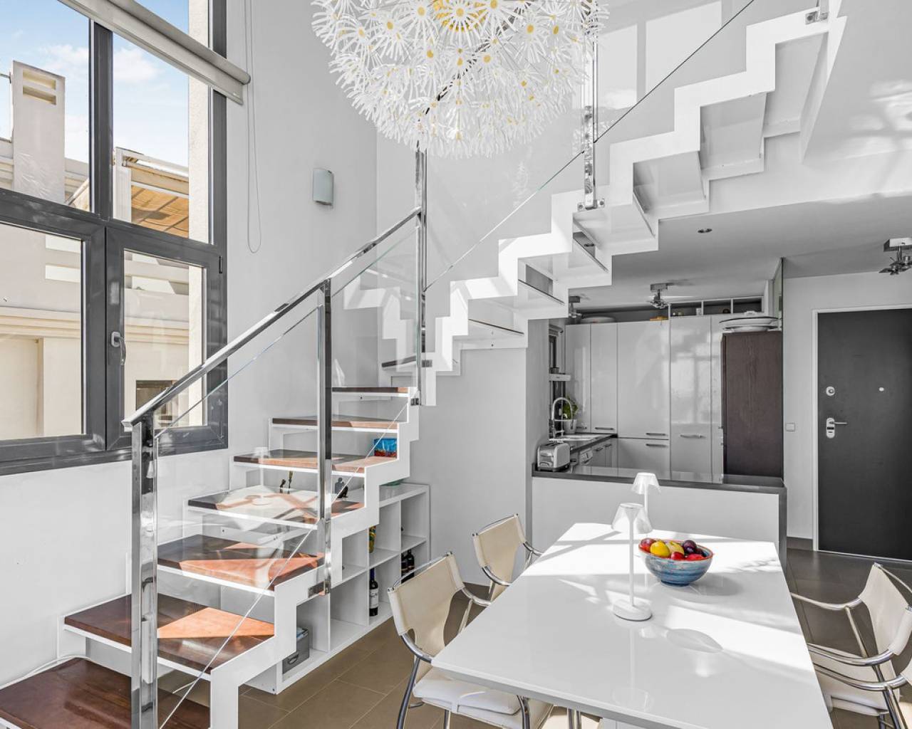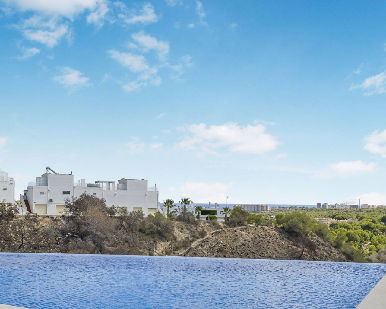 This home is situated on the first floor of the sought-after Danubio 1 complex in Las Ramblas and offers a total living space of 97.3 m² spread over two levels. On the main floor you are welcomed by a bright and generous living area with direct access to a charming terrace of almost 12 m². The floor also features a fully equipped kitchen, two well-lit bedrooms and a bathroom. An internal staircase leads to the upper level, which can easily be used as a third bedroom, home office or hobby room. From this level you access the impressive private roof terrace of 79 m², offering open views, sunshine throughout the day and ample space for relaxation, social gatherings and enjoyable barbecue evenings. The property is accessed via a shared entrance with staircases leading to the central part of the floor, ensuring both privacy and security. From the home you can enjoy beautiful views over green surroundings and the golf course, with the Mediterranean Sea visible on the horizon. The area is peaceful and scenic, with green spaces, walking paths and stunning views, while still being just minutes from the beaches of Campoamor and Cabo Roig. The popular La Zenia Boulevard shopping center, restaurants, services and good transport connections are also nearby. This is a rare opportunity to purchase a property in one of the most desirable areas of Orihuela Costa, ideal as a permanent home, holiday residence or investment.