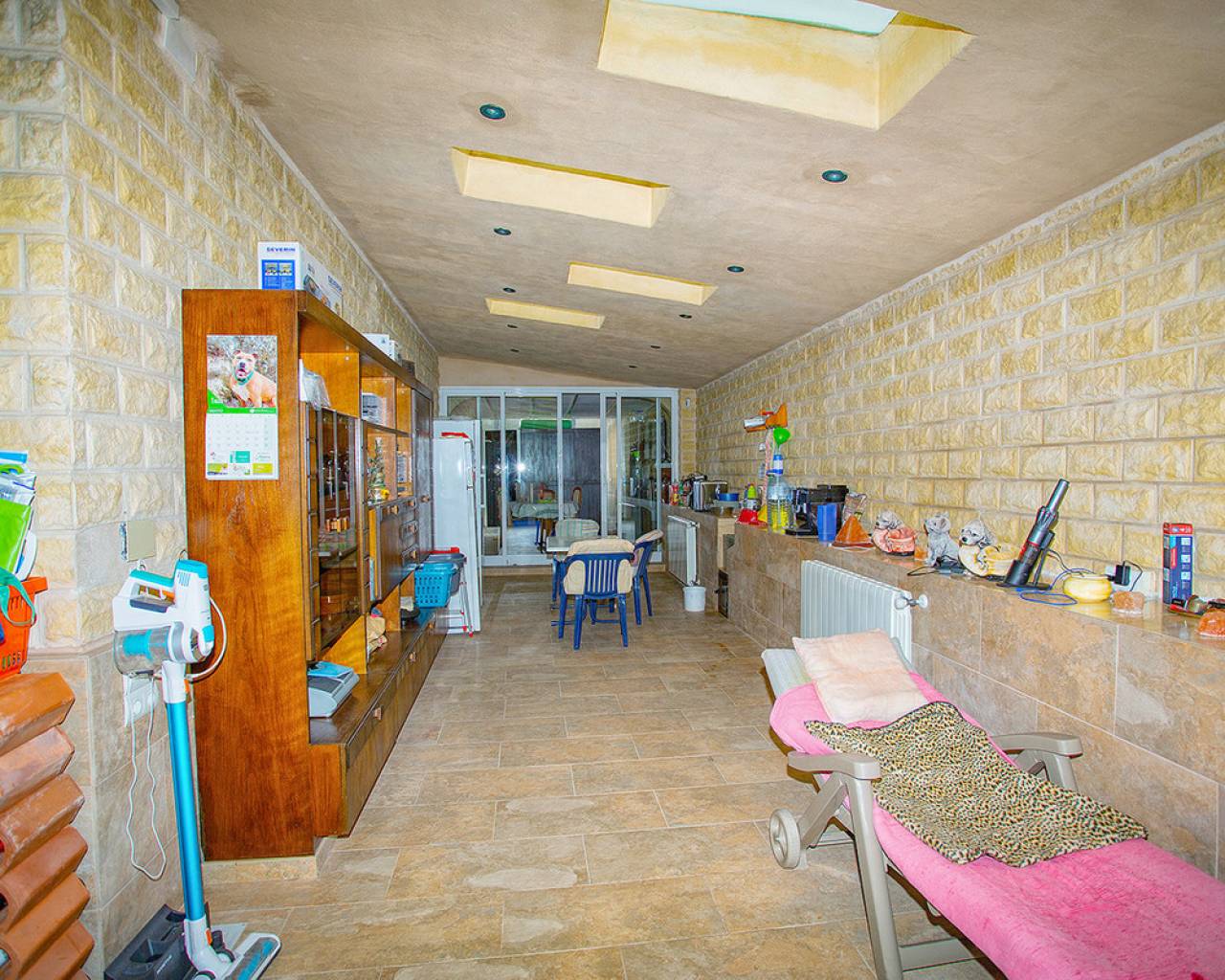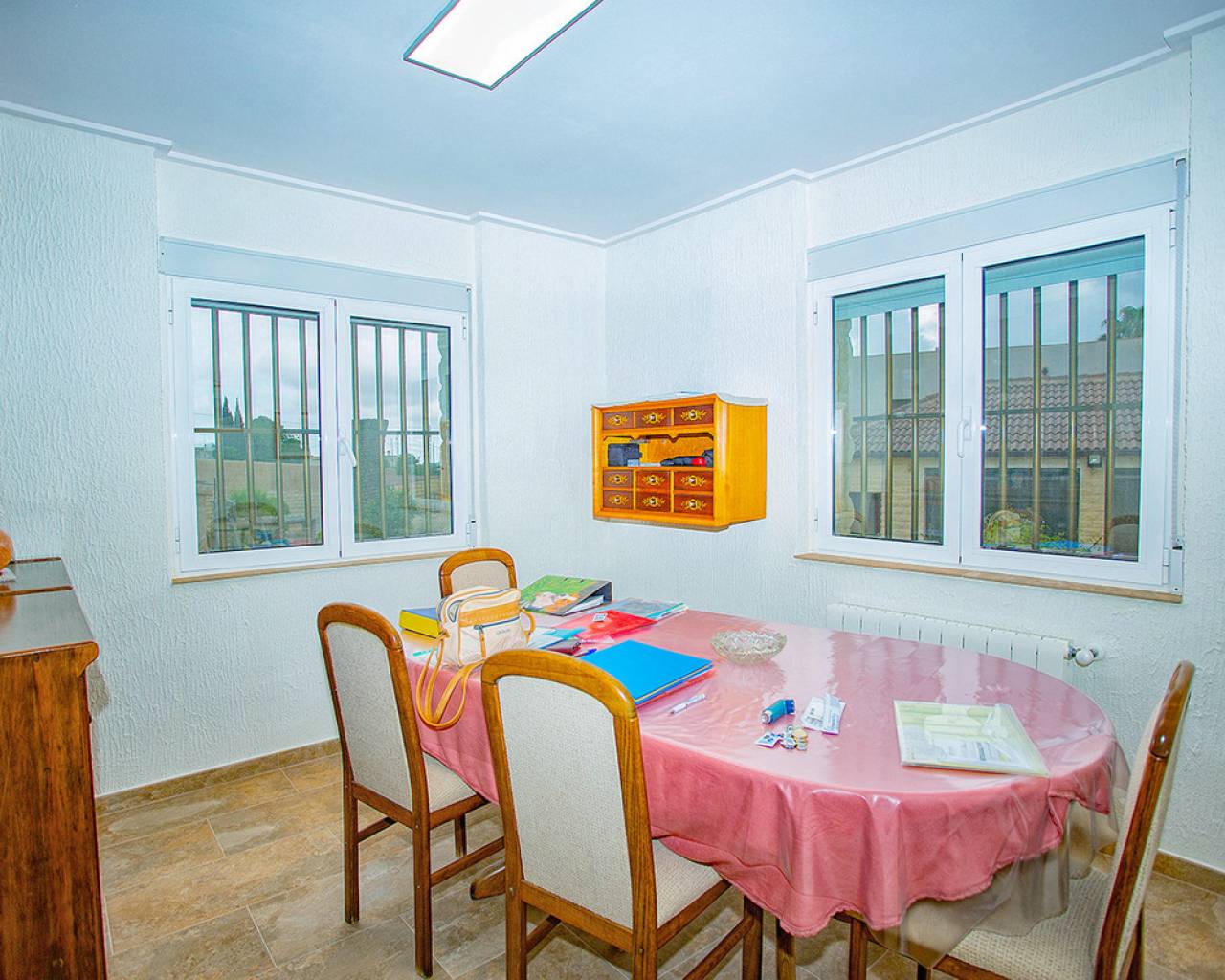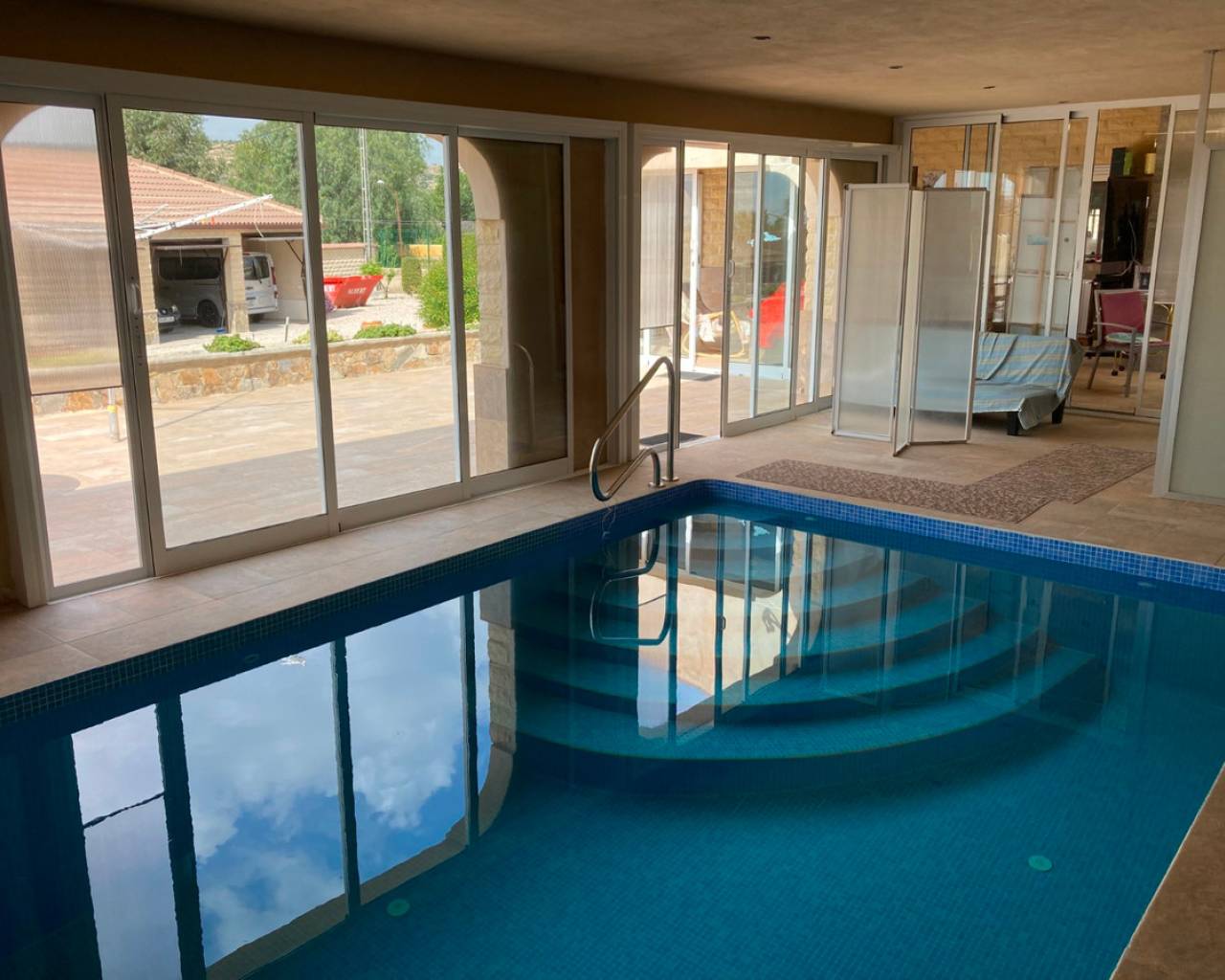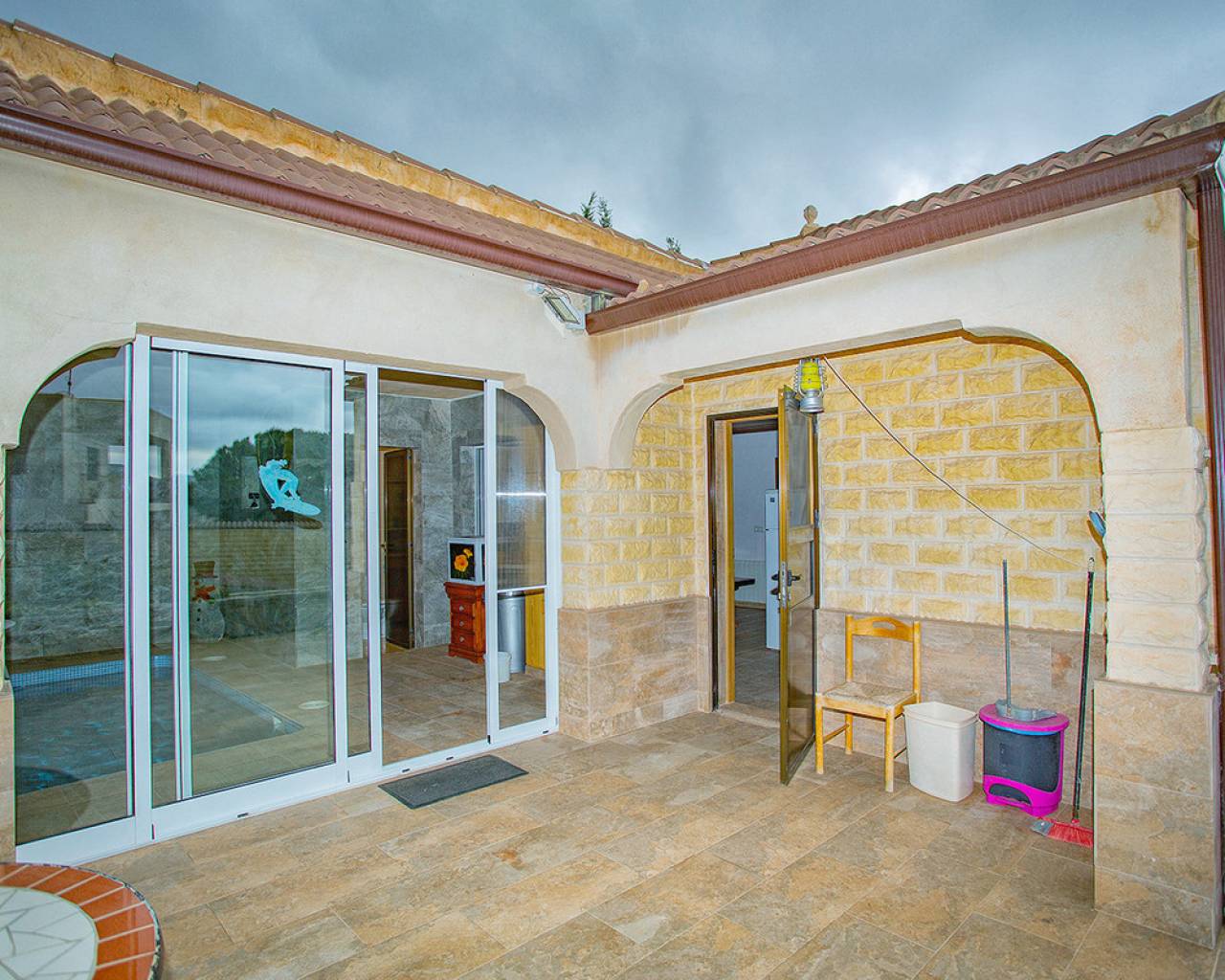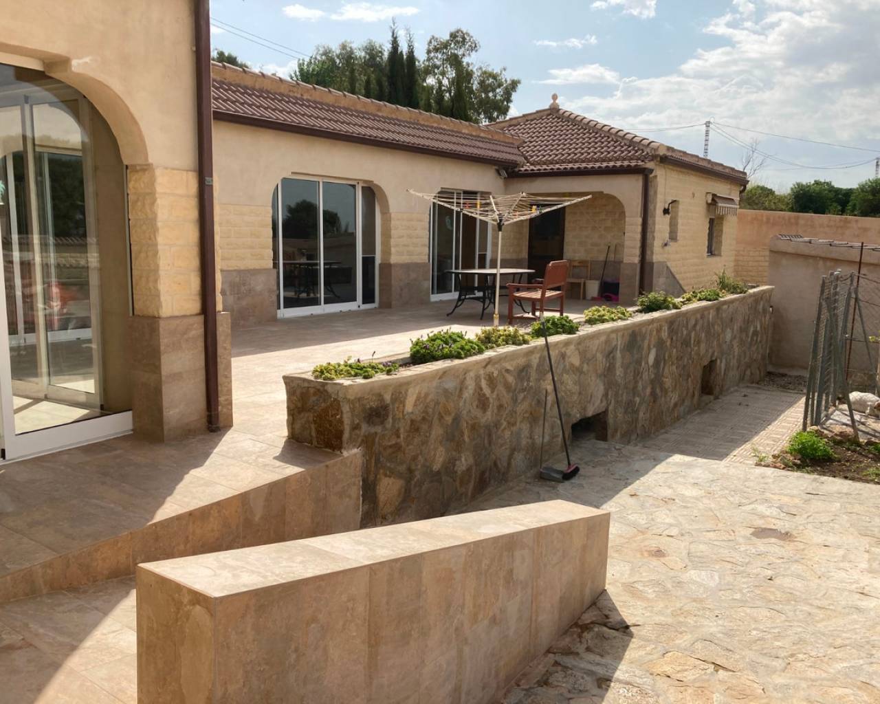 We are very proud to can present you this unique country house recently renovated to a high standard level to live all year round without any missing amenities also during the winter months just a 15 min drive to the Alicante airport and just a 5 minutes drive to the beautiful city of Elche which is famous for its UNESCO world heritage "Largest palm grove in Europe". Only two years ago the complete property which consists of a main building, a guest house, an indoor pool area and a garage was extensively renovated, including all electricical installation and the water pipes. The house was isolated with a layer of EPS which was covered with an additional layer of bricks. Also a central heating system with the latest heat pump technology was installed throughout the complete building. Not to forget to mention the large covered and glassed former terrace which serves now as an extension of the main building and goes around almost half of the house fronts. Due to its massive roof structure and the installed heating system it could also be converted in any additional separate rooms.  The indoor pool which can be accessed both from the guest house and from the main building with its large southwest facing glass front is heated also via its own heating pump. In the pool area can also be found a shower, a toilet and an infrared sauna. Beside the few steps up the entrace of the house it can be easily accessed also via a ramp. A central air conditioning system is pre-installed in the main building, which just need to be connected. The guest house it is already equipped with its own air conditioning. What it makes that house even more unique and which gives you a more spacious feeling is that there are no doors built inside the main building - it is indeed a "must-see" and "must-feel" house. You will definitely note that the owner thought on every little and technical detail by doing that renovation. Main building: You enter the 234 m2 main builing via the porche in the living area. On the left hand side you will find an eating area, a kitchen area and on the opposite side you enter the office area from where you get into the sleeping room and a bathroom area with a huge shower.  Currently there is only one sleeping room in the main building. But e.g. the eating room could be transformed back into one additional sleeping room (as it was before the renovation) or you could open a wall and extend it to the newly created additional living area. Guest house: You enter it via the open living room and its kitchen. There is one sleeping room and a bathroom also with a large shower installed. The air conditioned independetn flat measures 61m2 in total. The external large garage with 70 m2 provides space for 3 cars. On the left hand side there is a separated storage and workshop room. In the centre of the all walled and private plot of 1463 m2 is a small garden and a small house for dogs. On the other corner of the plot is a small open building which could be used as an outside kitchen and barbecue area. On the left hand side of the entrance to the plot is currently a small cactus garden. That means that the complete plot and its garden is very easy to maintain. The house also do have an alarm system and on the different corners on the plot are installed lamps with motion detectors. And,if you do not want to take the car, a bus stop is just a few meters away to get easily e.g. to Elche. The sum it up: You will find with that property almost every comfort which you might already have and which you do not want to miss in your future home on the Costa Blanca. If you have any questions in regards to that property or to any other house on our website, please don't hesitate to contact us.
