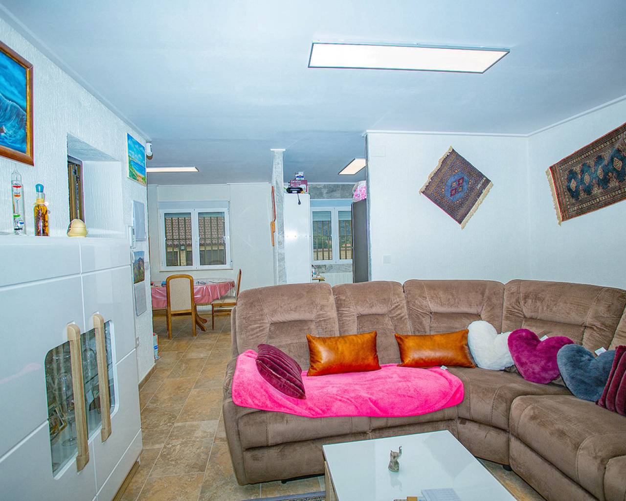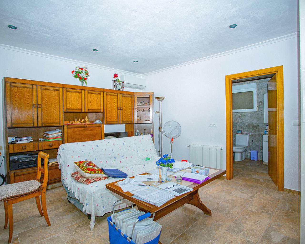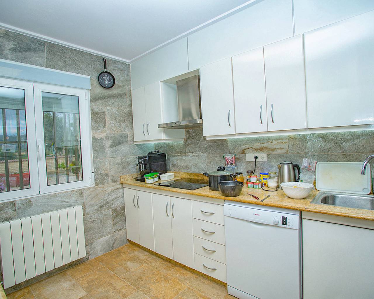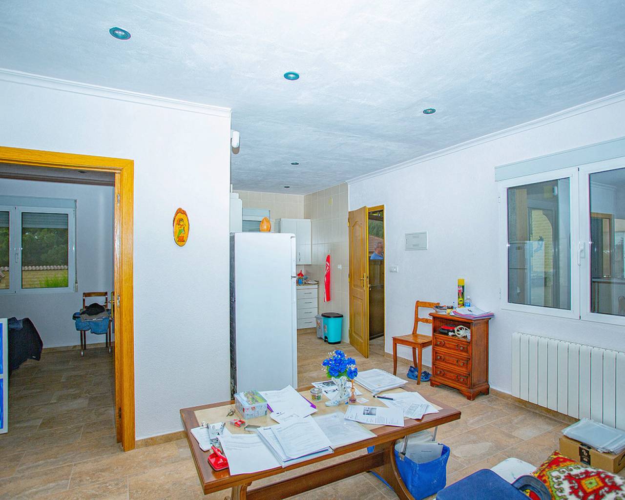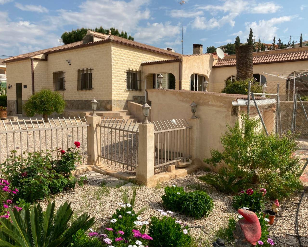 We are very proud to can present you this unique country house recently renovated to a high standard level to live all year round without any missing amenities also during the winter months just a 15 min drive to the Alicante airport and just a 5 minutes drive to the beautiful city of Elche which is famous for its UNESCO world heritage "Largest palm grove in Europe". Only two years ago the complete property which consists of a main building, a guest house, an indoor pool area and a garage was extensively renovated, including all electricical installation and the water pipes. The house was isolated with a layer of EPS which was covered with an additional layer of bricks. Also a central heating system with the latest heat pump technology was installed throughout the complete building. Not to forget to mention the large covered and glassed former terrace which serves now as an extension of the main building and goes around almost half of the house fronts. Due to its massive roof structure and the installed heating system it could also be converted in any additional separate rooms.  The indoor pool which can be accessed both from the guest house and from the main building with its large southwest facing glass front is heated also via its own heating pump. In the pool area can also be found a shower, a toilet and an infrared sauna. Beside the few steps up the entrace of the house it can be easily accessed also via a ramp. A central air conditioning system is pre-installed in the main building, which just need to be connected. The guest house it is already equipped with its own air conditioning. What it makes that house even more unique and which gives you a more spacious feeling is that there are no doors built inside the main building - it is indeed a "must-see" and "must-feel" house. You will definitely note that the owner thought on every little and technical detail by doing that renovation. Main building: You enter the 234 m2 main builing via the porche in the living area. On the left hand side you will find an eating area, a kitchen area and on the opposite side you enter the office area from where you get into the sleeping room and a bathroom area with a huge shower.  Currently there is only one sleeping room in the main building. But e.g. the eating room could be transformed back into one additional sleeping room (as it was before the renovation) or you could open a wall and extend it to the newly created additional living area. Guest house: You enter it via the open living room and its kitchen. There is one sleeping room and a bathroom also with a large shower installed. The air conditioned independetn flat measures 61m2 in total. The external large garage with 70 m2 provides space for 3 cars. On the left hand side there is a separated storage and workshop room. In the centre of the all walled and private plot of 1463 m2 is a small garden and a small house for dogs. On the other corner of the plot is a small open building which could be used as an outside kitchen and barbecue area. On the left hand side of the entrance to the plot is currently a small cactus garden. That means that the complete plot and its garden is very easy to maintain. The house also do have an alarm system and on the different corners on the plot are installed lamps with motion detectors. And,if you do not want to take the car, a bus stop is just a few meters away to get easily e.g. to Elche. The sum it up: You will find with that property almost every comfort which you might already have and which you do not want to miss in your future home on the Costa Blanca. If you have any questions in regards to that property or to any other house on our website, please don't hesitate to contact us.