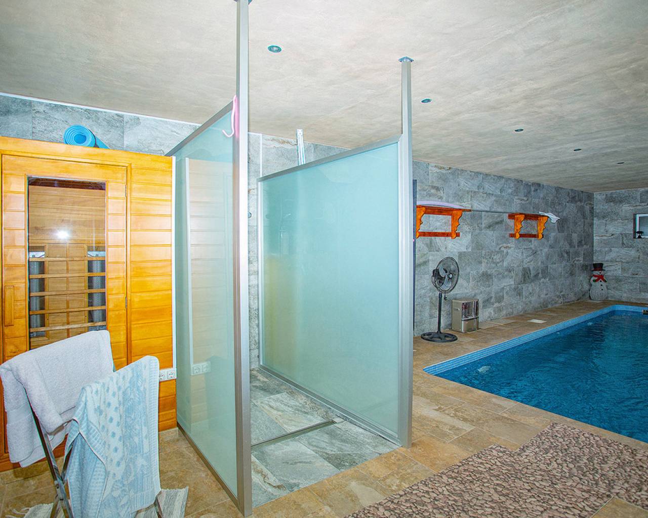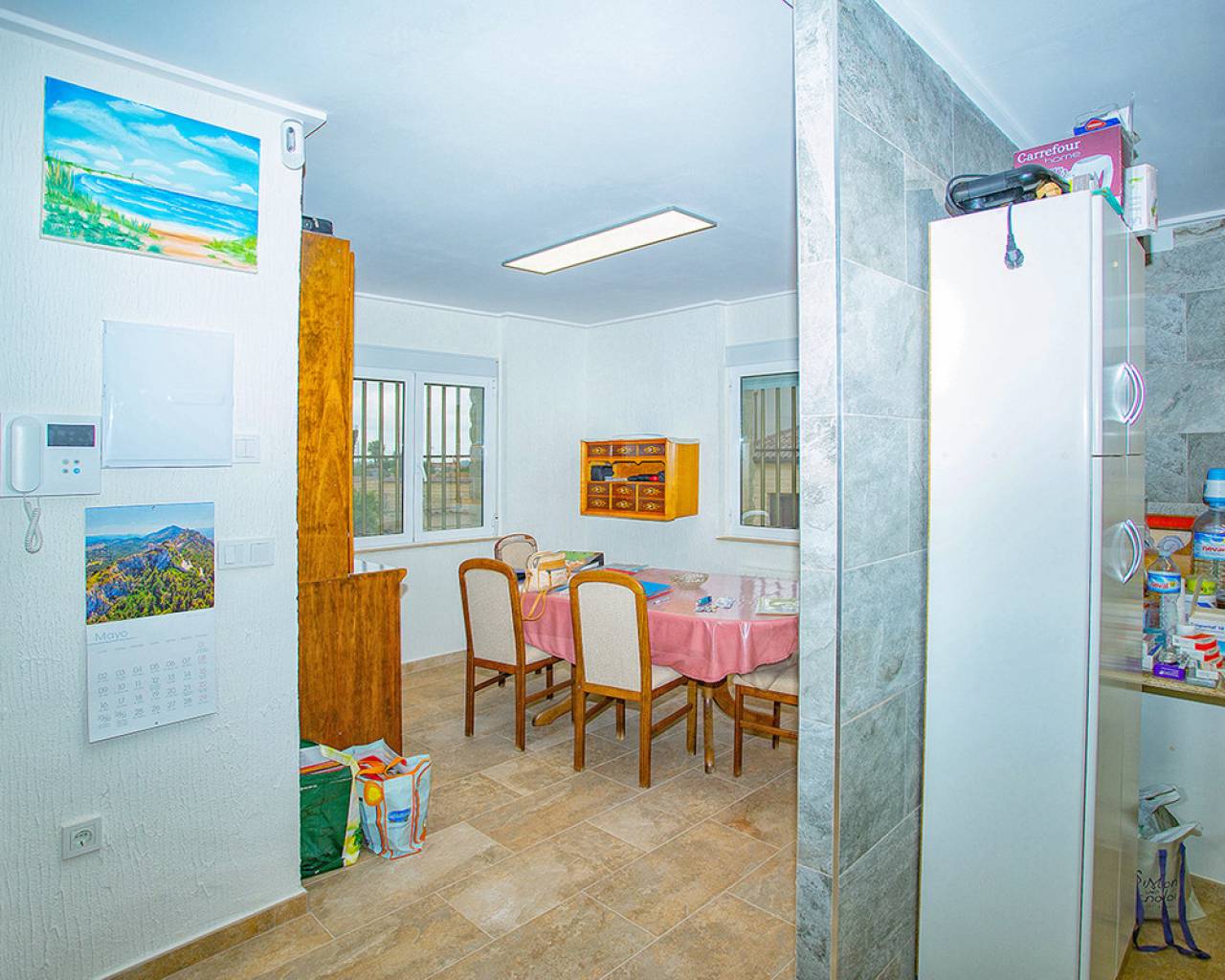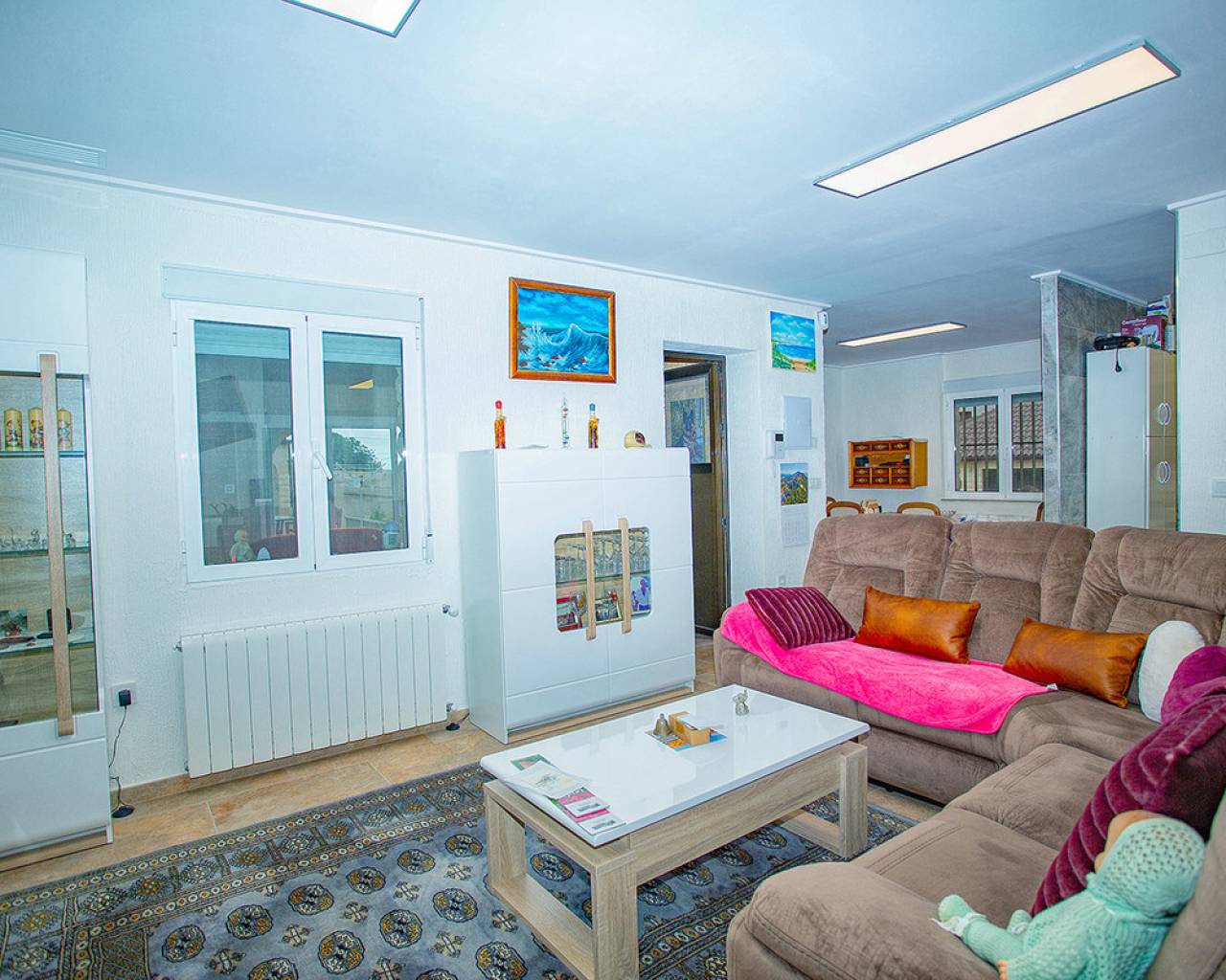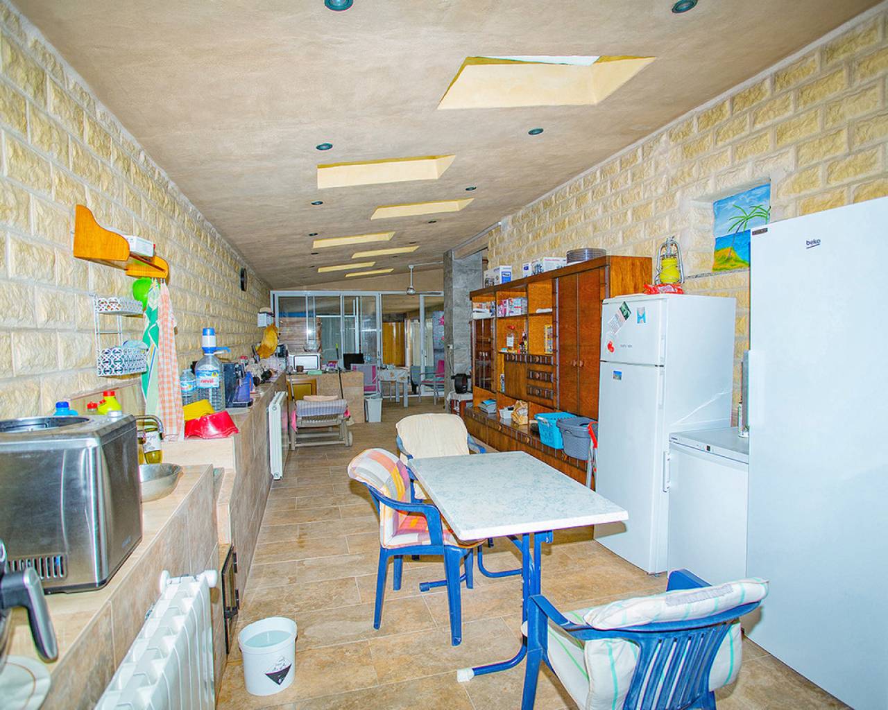 We are very proud to can present you this unique country house recently renovated to a high standard level to live all year round without any missing amenities also during the winter months just a 15 min drive to the Alicante airport and just a 5 minutes drive to the beautiful city of Elche which is famous for its UNESCO world heritage "Largest palm grove in Europe". Only two years ago the complete property which consists of a main building, a guest house, an indoor pool area and a garage was extensively renovated, including all electricical installation and the water pipes. The house was isolated with a layer of EPS which was covered with an additional layer of bricks. Also a central heating system with the latest heat pump technology was installed throughout the complete building. Not to forget to mention the large covered and glassed former terrace which serves now as an extension of the main building and goes around almost half of the house fronts. Due to its massive roof structure and the installed heating system it could also be converted in any additional separate rooms.  The indoor pool which can be accessed both from the guest house and from the main building with its large southwest facing glass front is heated also via its own heating pump. In the pool area can also be found a shower, a toilet and an infrared sauna. Beside the few steps up the entrace of the house it can be easily accessed also via a ramp. A central air conditioning system is pre-installed in the main building, which just need to be connected. The guest house it is already equipped with its own air conditioning. What it makes that house even more unique and which gives you a more spacious feeling is that there are no doors built inside the main building - it is indeed a "must-see" and "must-feel" house. You will definitely note that the owner thought on every little and technical detail by doing that renovation. Main building: You enter the 234 m2 main builing via the porche in the living area. On the left hand side you will find an eating area, a kitchen area and on the opposite side you enter the office area from where you get into the sleeping room and a bathroom area with a huge shower.  Currently there is only one sleeping room in the main building. But e.g. the eating room could be transformed back into one additional sleeping room (as it was before the renovation) or you could open a wall and extend it to the newly created additional living area. Guest house: You enter it via the open living room and its kitchen. There is one sleeping room and a bathroom also with a large shower installed. The air conditioned independetn flat measures 61m2 in total. The external large garage with 70 m2 provides space for 3 cars. On the left hand side there is a separated storage and workshop room. In the centre of the all walled and private plot of 1463 m2 is a small garden and a small house for dogs. On the other corner of the plot is a small open building which could be used as an outside kitchen and barbecue area. On the left hand side of the entrance to the plot is currently a small cactus garden. That means that the complete plot and its garden is very easy to maintain. The house also do have an alarm system and on the different corners on the plot are installed lamps with motion detectors. And,if you do not want to take the car, a bus stop is just a few meters away to get easily e.g. to Elche. The sum it up: You will find with that property almost every comfort which you might already have and which you do not want to miss in your future home on the Costa Blanca. If you have any questions in regards to that property or to any other house on our website, please don't hesitate to contact us.