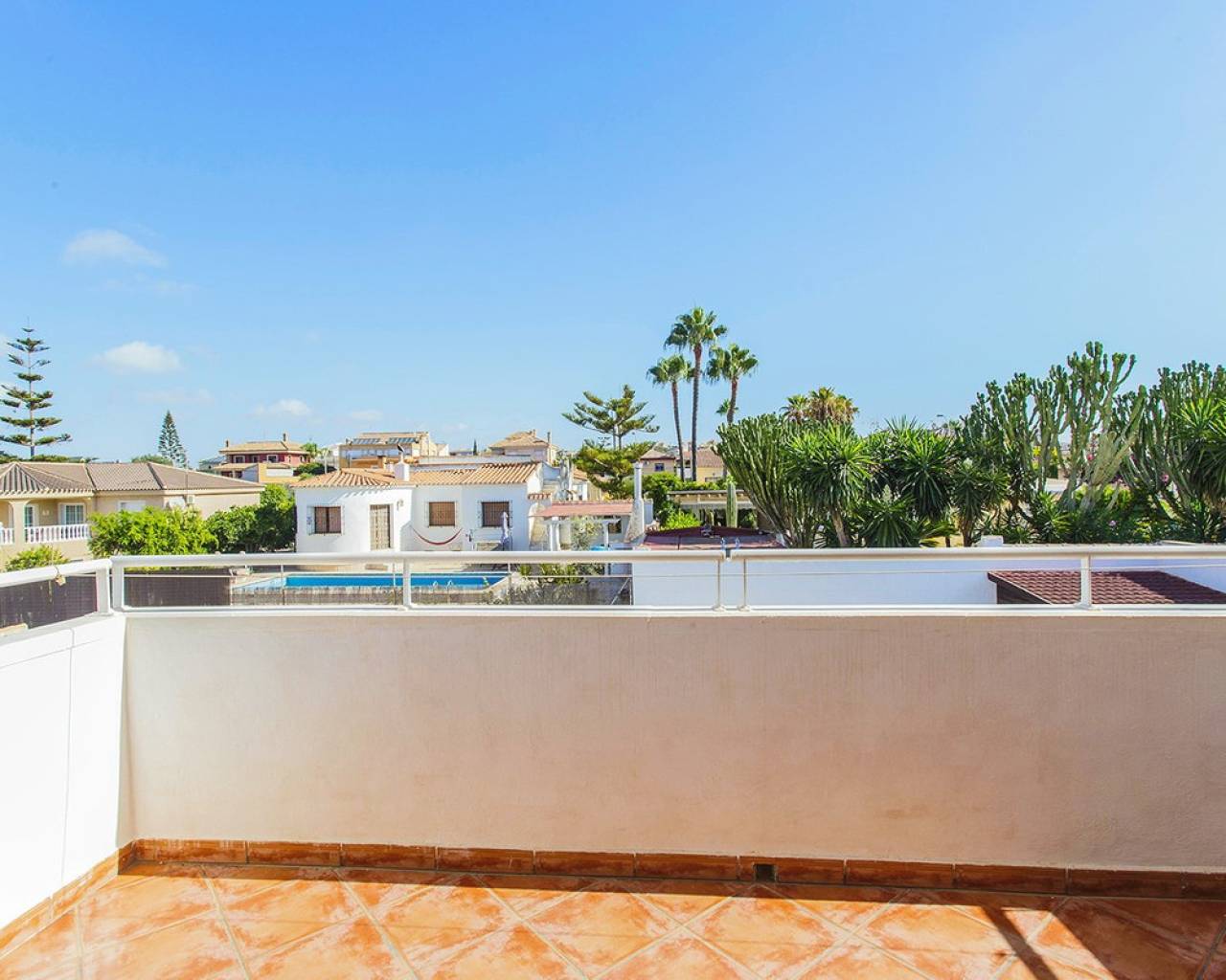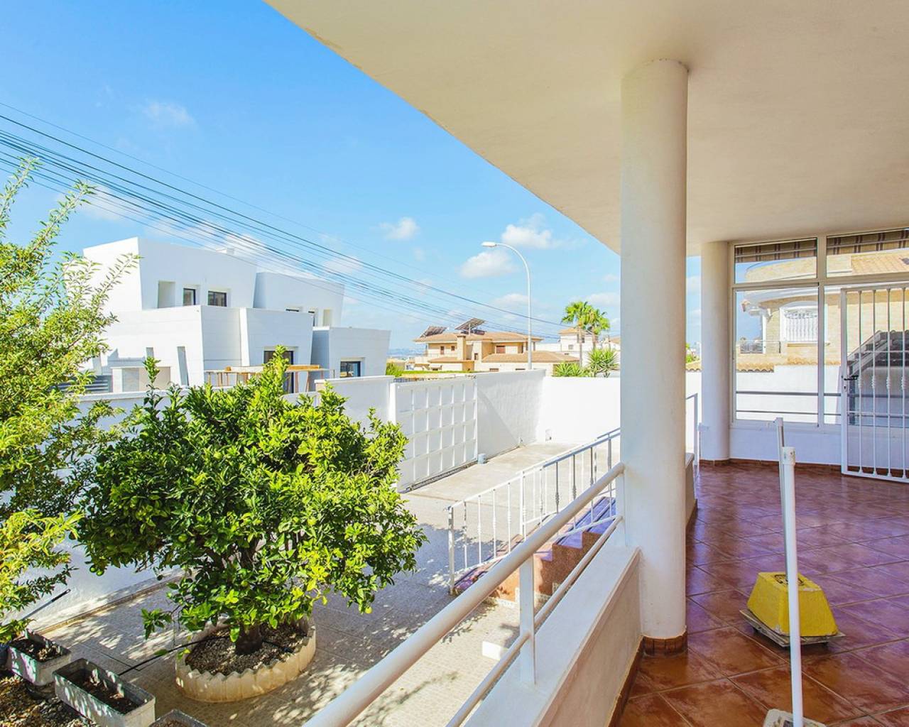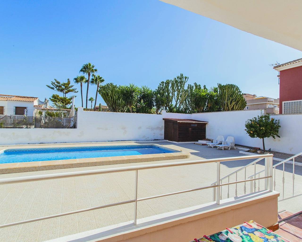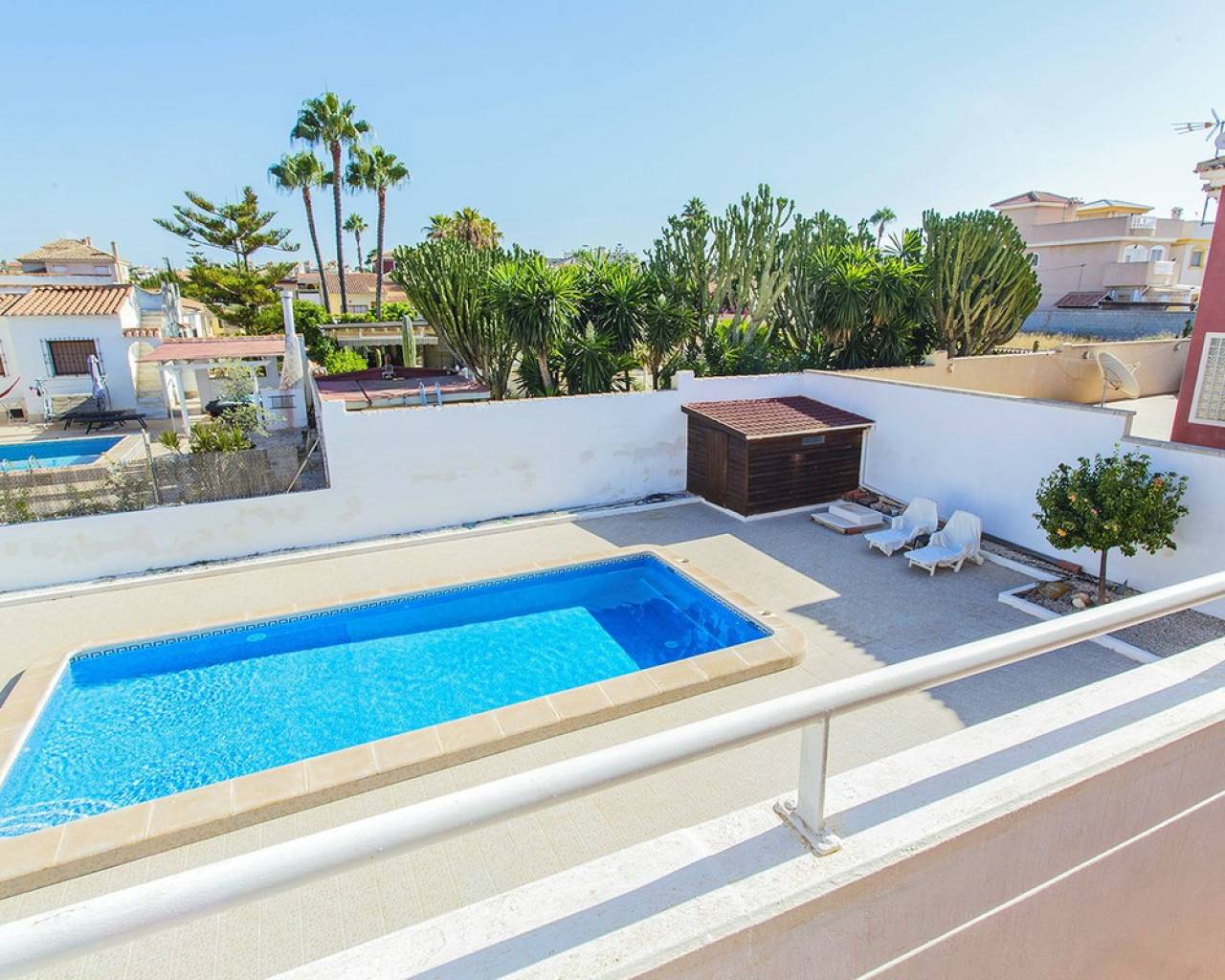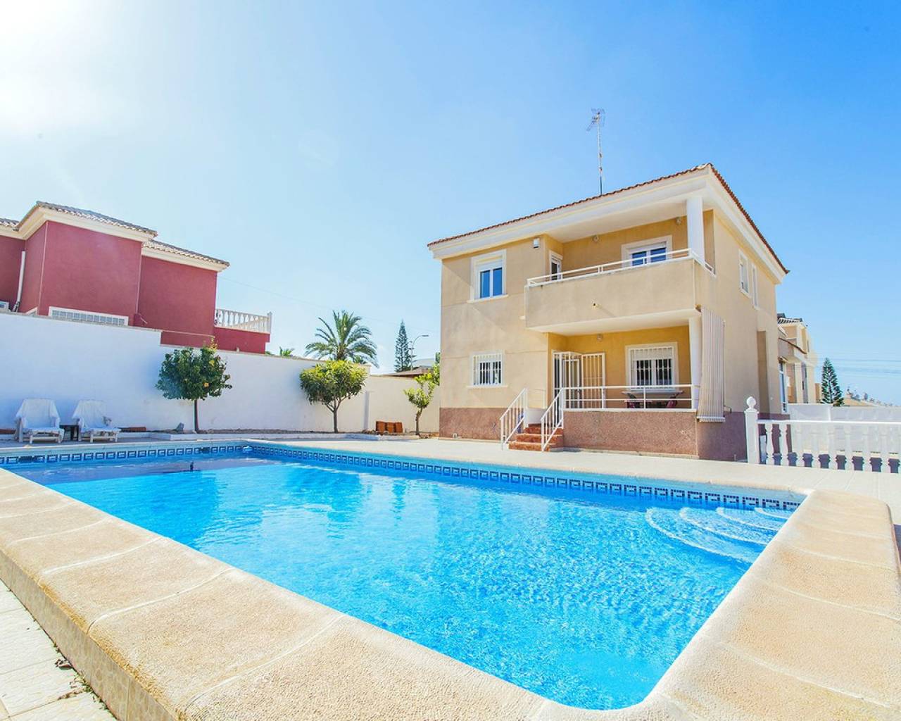 Sunny villa with pool and parking for 5 cars for sale in Aguas Nuevas, Torrevieja. The 220 m2 villa is distributed as follows: on the first floor there is a spacious living-dining room with a 20 m2 porch, an independent equipped kitchen with a gallery and access to an open terrace with views of the pool, a bedroom with built-in wardrobe, a complete bathroom with a shower tray. On the second floor there are four bedrooms with fitted wardrobes. All bedrooms have a balcony with different orientations. Also one of the rooms has a suite bathroom. Surface of the plot about 816 m2. On the plot around the house there is a private pool with barbecue area and planted trees. Chalet is located next to all services such as shops, cafes, restaurants, pharmacy and supermarkets. If you want a virtual tour or a plan of the house, do not hesitate to contact us. It will also be a very good investment and we advise you with our successful seasonal rental service.