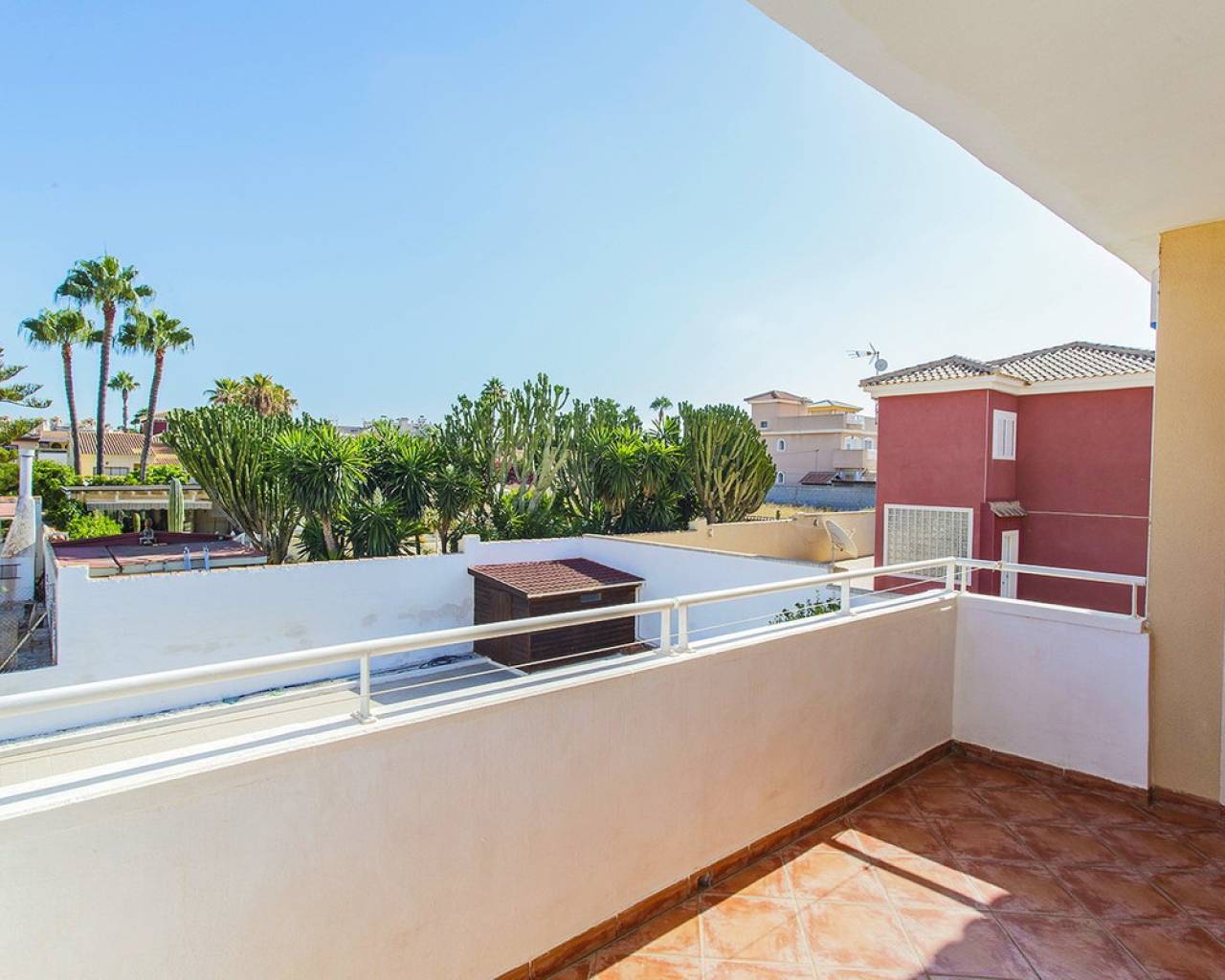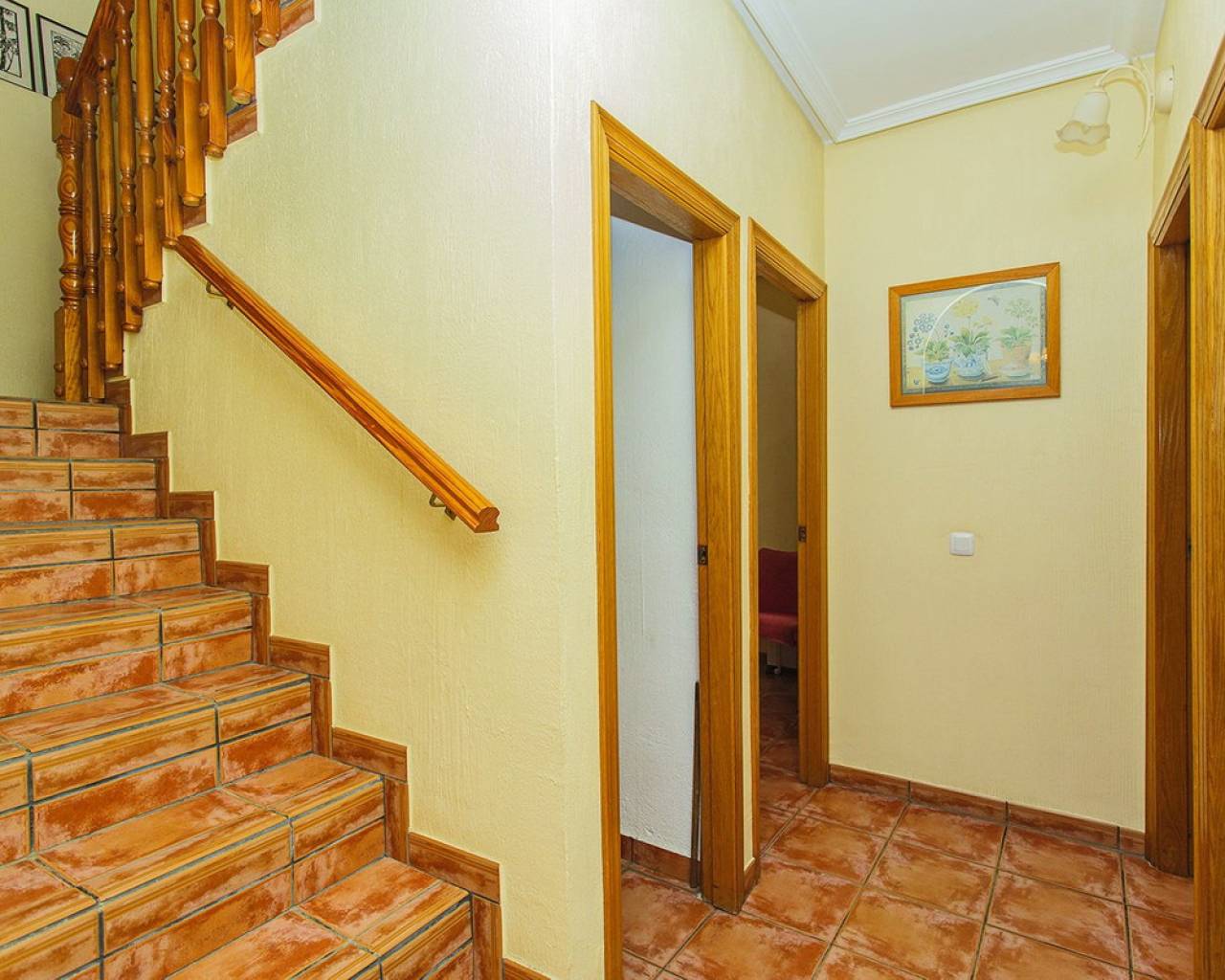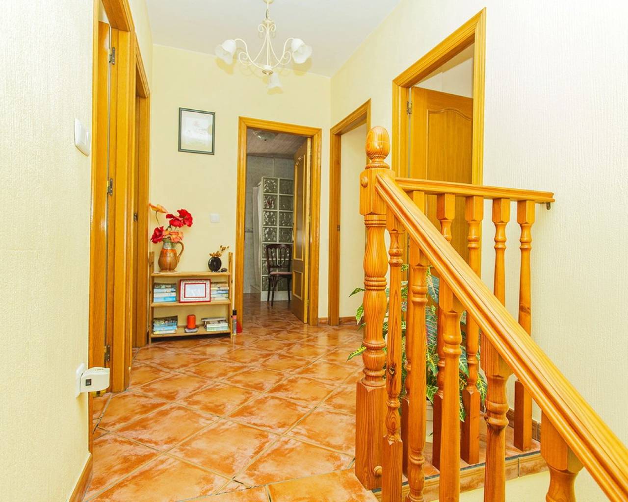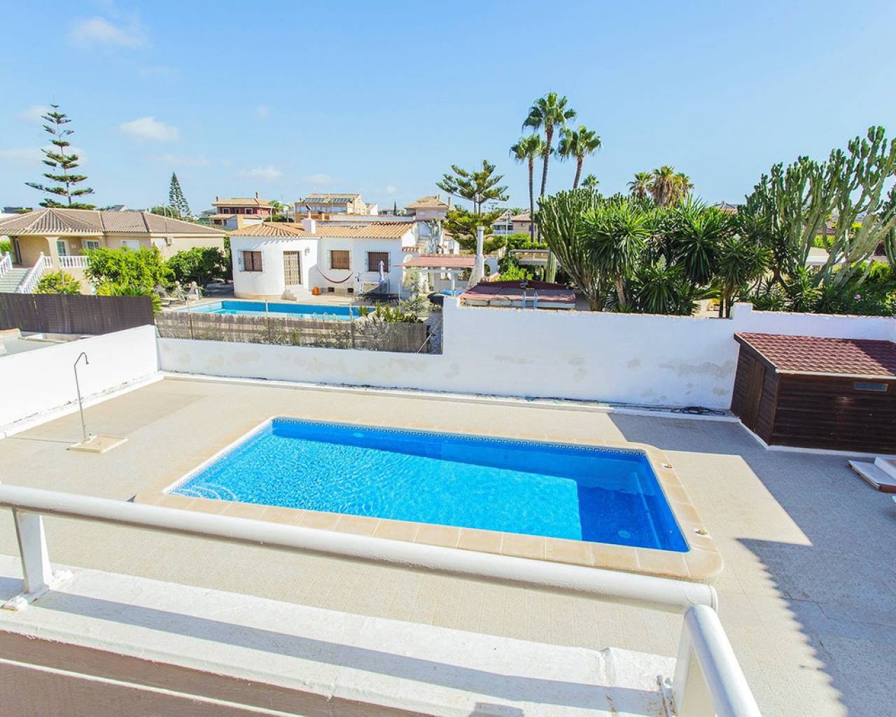 Sunny villa with pool and parking for 5 cars for sale in Aguas Nuevas, Torrevieja. The 220 m2 villa is distributed as follows: on the first floor there is a spacious living-dining room with a 20 m2 porch, an independent equipped kitchen with a gallery and access to an open terrace with views of the pool, a bedroom with built-in wardrobe, a complete bathroom with a shower tray. On the second floor there are four bedrooms with fitted wardrobes. All bedrooms have a balcony with different orientations. Also one of the rooms has a suite bathroom. Surface of the plot about 816 m2. On the plot around the house there is a private pool with barbecue area and planted trees. Chalet is located next to all services such as shops, cafes, restaurants, pharmacy and supermarkets. If you want a virtual tour or a plan of the house, do not hesitate to contact us. It will also be a very good investment and we advise you with our successful seasonal rental service.
