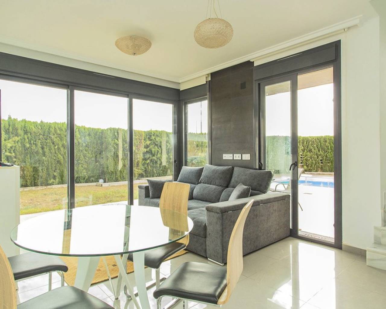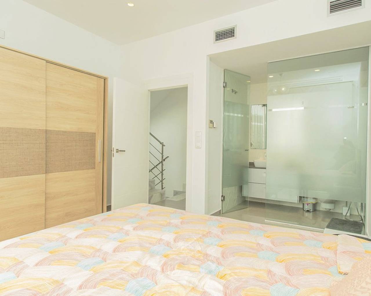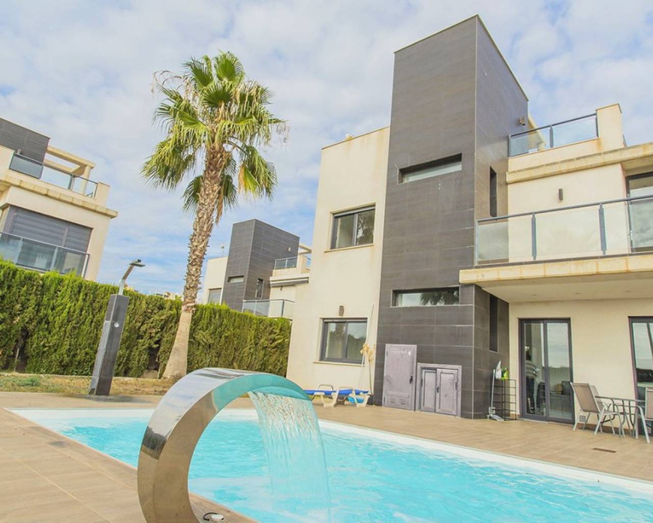 Impressive luxury villa located in the exclusive area of Lomas de Cabo Roig in Orihuela Costa in the province of Alicante Unique villa with 3 bedrooms and 3 bathrooms, distributed on two levels. On the first floor you will find an open kitchen and living room, dining room and en-suite bedroom with built-in wardrobe. It has direct access to the gardens from the living room with large polished sliding doors. On the second floor you will find two en-suite bedrooms with built-in wardrobes. The entire interior of the house is designed and made by interior designers. You will find perfectly matching LED lights, lamps and furniture throughout the villa. The house is also equipped with a video intercom alarm system that can be controlled by app. Outdoor area The villa is located on a 500 m2 plot. In the beautiful garden you can find a swimming pool with plenty of space for sun loungers. The pool comes with LED lights. In the garden you will also find a barbecue area. The villa is part of a private, gated community that offers a high degree of security to its residents. There is parking for one car on the plot. Surroundings The villa is located in the exclusive area of Lomas de Cabo Roig in Orihuela Costa. You will find bars, restaurants and grocery stores just around the corner. You will also find the popular golf courses of Campoamor, Villamartín and the award-winning Las Colinas golf course just a few minutes drive away. La Zenia Boulevard, the largest open-air shopping center in the province of Alicante, is just a 15-minute walk away. Here you will find stores such as Zara, AlCampo, H&M, Decathlon, Primark, Medimarkt among many others. You'll also find a variety of beautiful beaches just a few minutes' drive away.