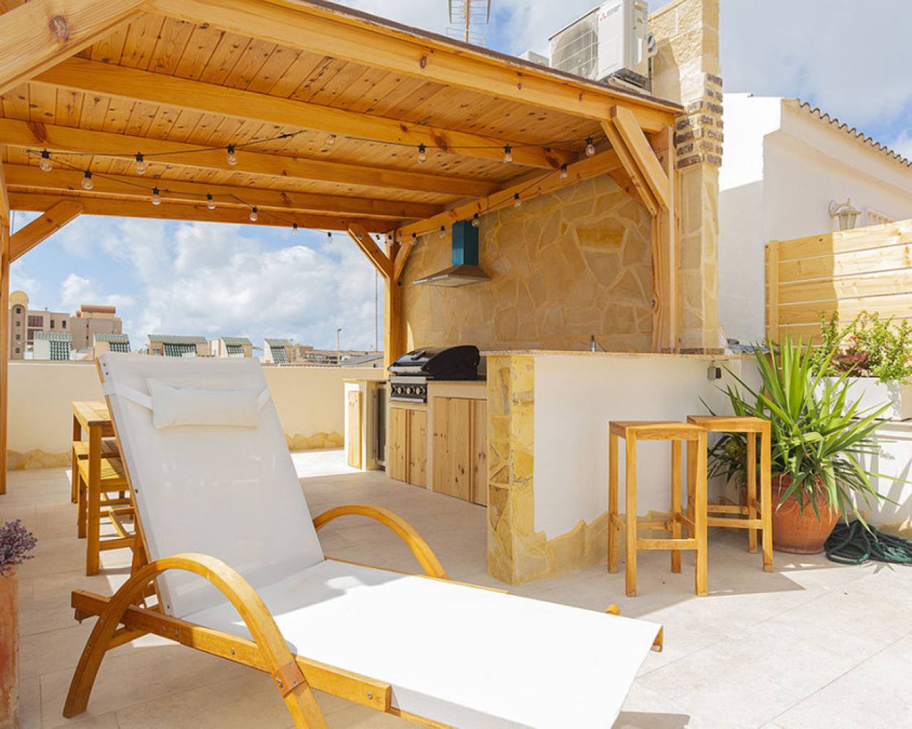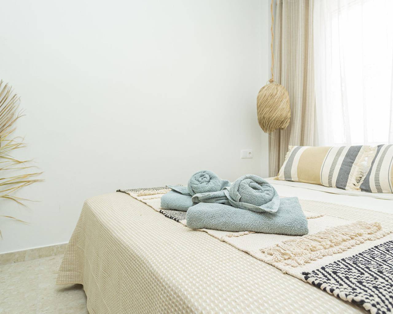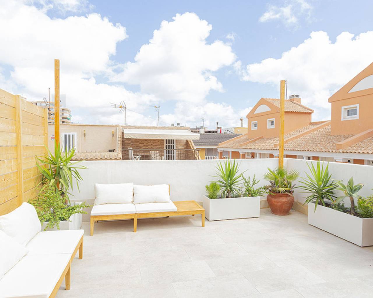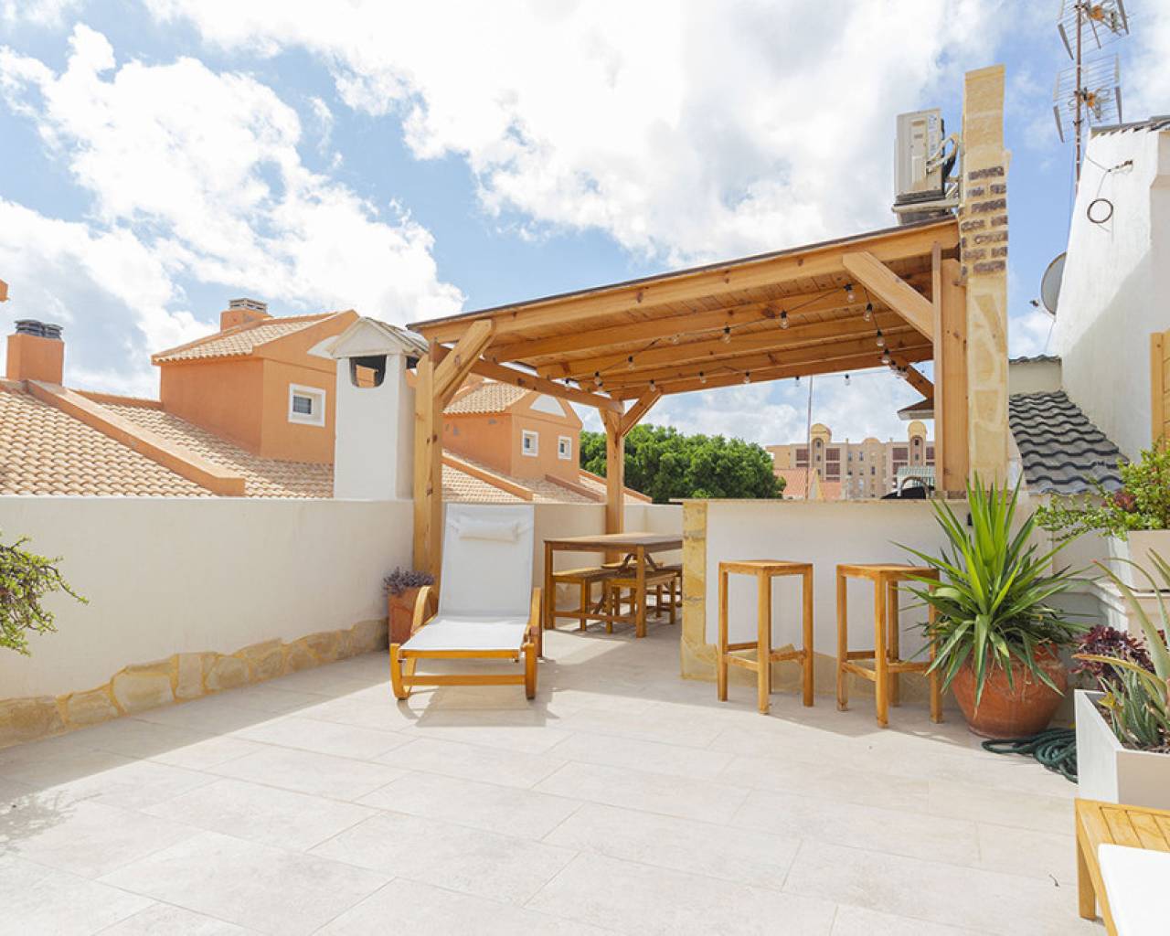 Welcome to your new home by the sea! This spectacular top floor bungalow is located in the European area in La Mata, just 30 meters from the beach. With a luxury renovation and the best materials, this property offers comfort, style and an unbeatable location. This home offers you a premium location: second line from the sea, just 30 meters from La Mata beach and very close to the center, with access to all essential services such as supermarkets, pharmacies, restaurants, cafes and bus stations. The size of the house is also impressive: 109 useful square meters and a further 45 square meters of solarium, apart from the spacious entrance terrace. The very spacious solarium is divided into a covered barbecue area, with solid wood pillars and roof, and a lounge area perfect for enjoying the sun. Distribution and details of the house: The entrance is through a charming terrace. This gives access to the living room: Spacious and bright living room, with large windows that provide plenty of natural light. It includes a dining area and a cozy lounge with a high-quality comfortable sofa and television for relaxing with the family. It has several practical pieces of furniture for storage that also add unique style to the room. Open kitchen: uniquely designed and fully equipped with rock countertops and oak furniture. High-end equipment from the Balay brand, with plenty of storage space and a functional layout. Bedrooms: Three bedrooms, all with air conditioning, wardrobes and large windows with electric shutters. It should be noted that all rooms are equipped with mattresses from an exclusive international brand, used by the best hotels around the world, which offer maximum quality and comfort with adjustable hardness. Modern bathroom: Bathroom with a shower tray from one of the best brands on the market, spacious and comfortable, with underfloor heating and a storage closet, all designed in a bohemian style. The renovation carried out with luxury materials and finishes, adding many extras that provide unmatched comfort in the bungalow. It was completely renovated with eco-friendly and luxury materials, including solid wood and stone. The equipment is also high-end: Kitchen equipped with Balay brand appliances and the bathroom with high-end products from the Villeroy & Boch brand. Air conditioning in all rooms and underfloor heating throughout the house, and in the bathroom. The bungalow is a unique experience, but it is also located in one of the most sought-after areas of La Mata, because in addition to the wonderful beach it has nearby services such as supermarkets, pharmacies, restaurants and cafes just a few minutes away, providing comfort and ease in the day to day. In addition to easy access public transportation. On the other hand, just two minutes away are the nearby parks and recreational areas to enjoy outdoor activities. Don't miss the unique opportunity to live in this spectacular top-floor bungalow with private solarium in La Mata. Contact us today for more information and to arrange a visit. We are here to help you find your ideal home by the sea!