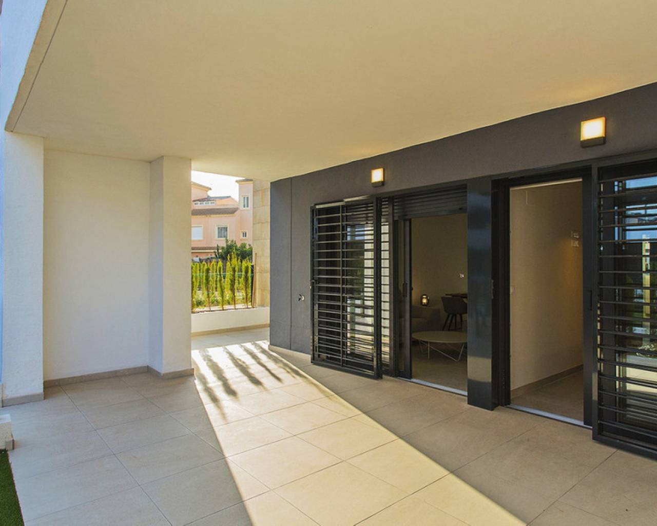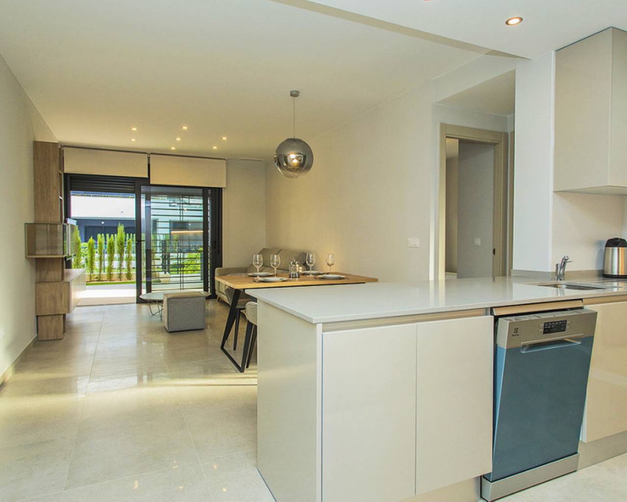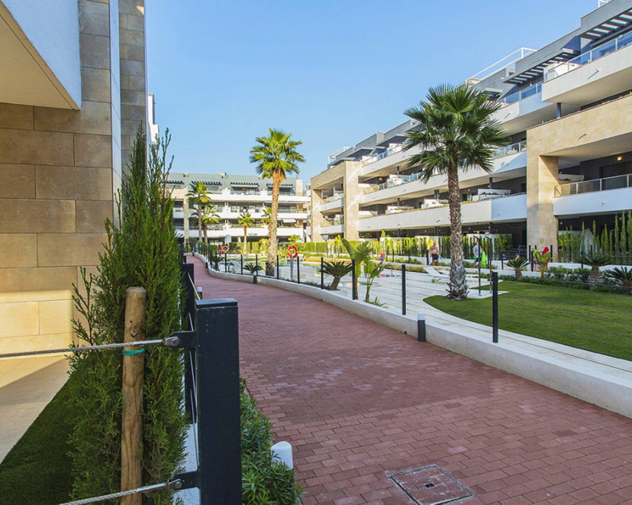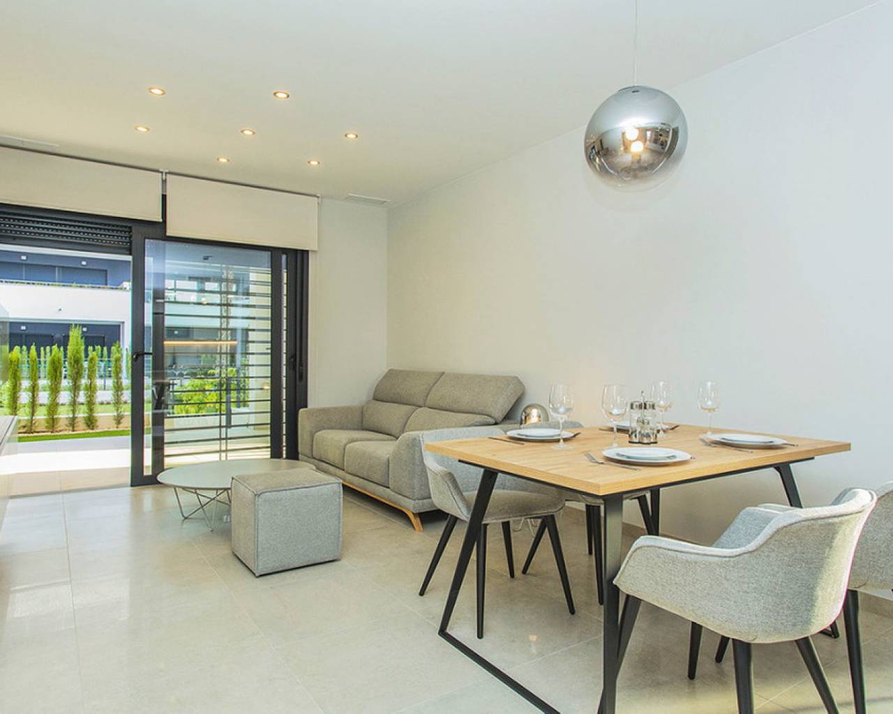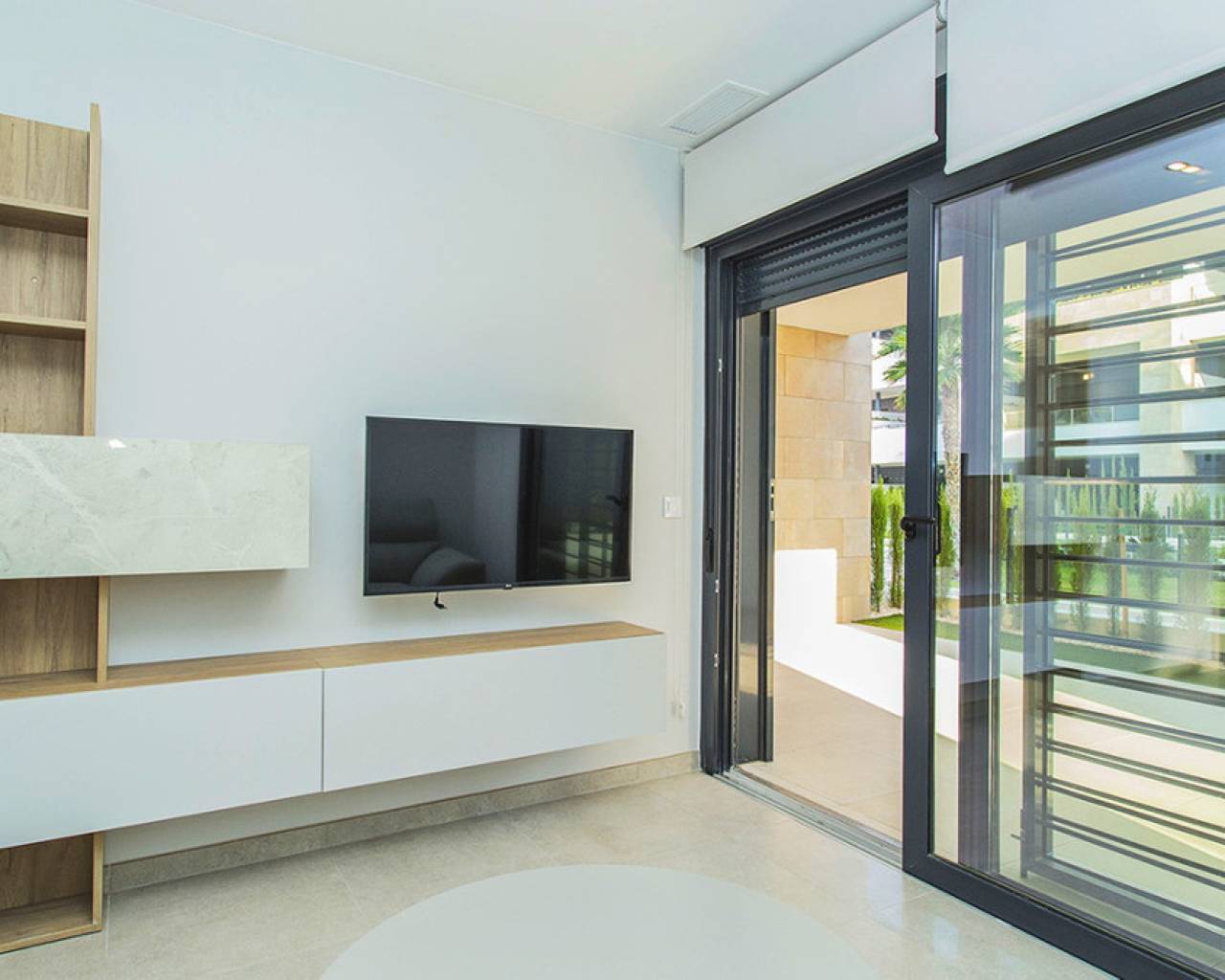 Spacious ground floor apartment with a large terrace in the exclusive Flamenca Village development. It consists of two bedrooms and two bathrooms, a living-dining room with an open kitchen. It is sold furnished and the apartment includes an underground parking space plus 1 parking space for guests within the complex. Phase 3 was built in 2023 and the property has never been used, meaning it is practically considered a new build. Central air conditioning, modern kitchen with all top brand appliances, designer furniture, large terrace to enjoy the Mediterranean climate. The Flamenca Village residential complex offers several swimming pools, one of which is heated. Spa and gym, a poolside snack bar in the central pool area with a good atmosphere, 24-hour concierge area. Security patrolling within the complex, etc. The proximity of the Playa Flamenca shopping centre offers you all services on foot. Mercadona, restaurants, shops, cafes etc. and just 5 minutes from the famous La Zenia Boulevard shopping centre. You can walk to the beautiful Playa Flamenca beach, the distance to the sea is 500 meters. Don't hesitate to arrange a viewing! It's a unique opportunity to get an attractive home in one of the most sought-after residential areas on the coast.