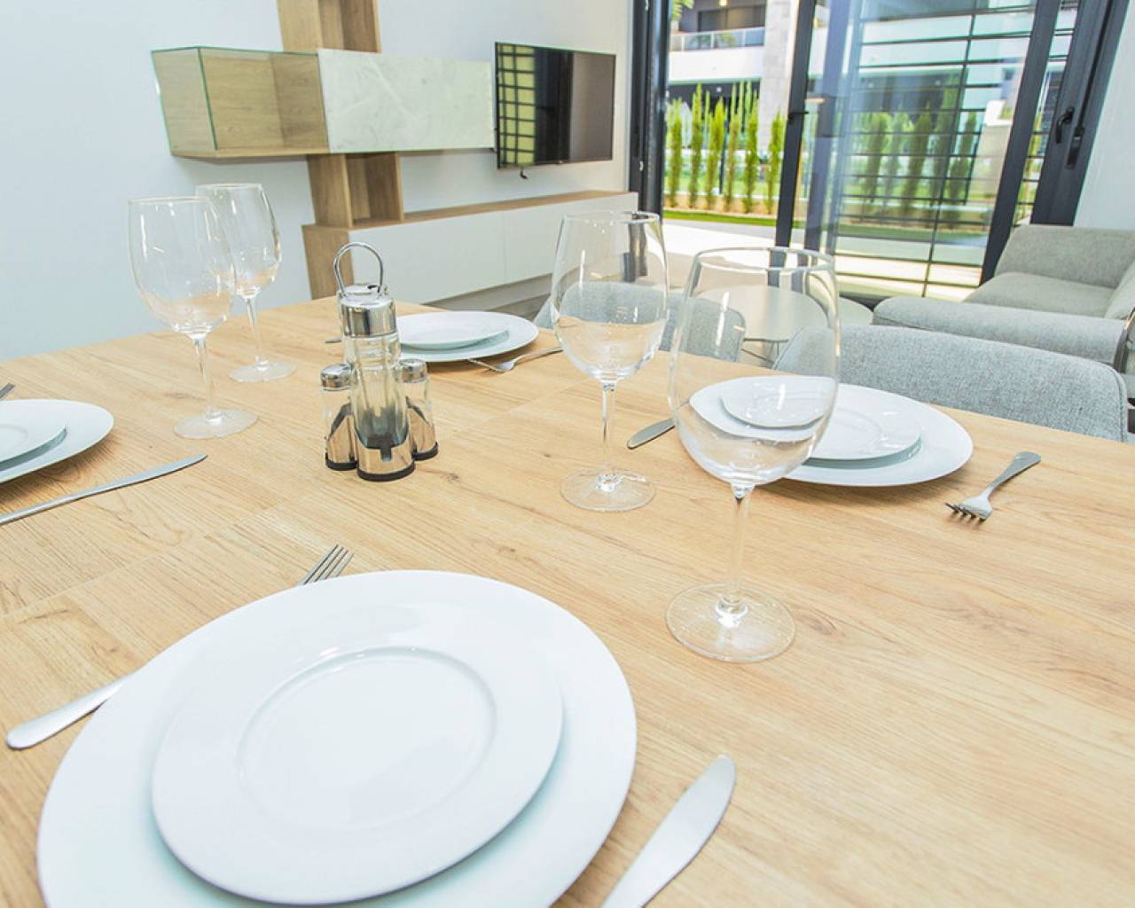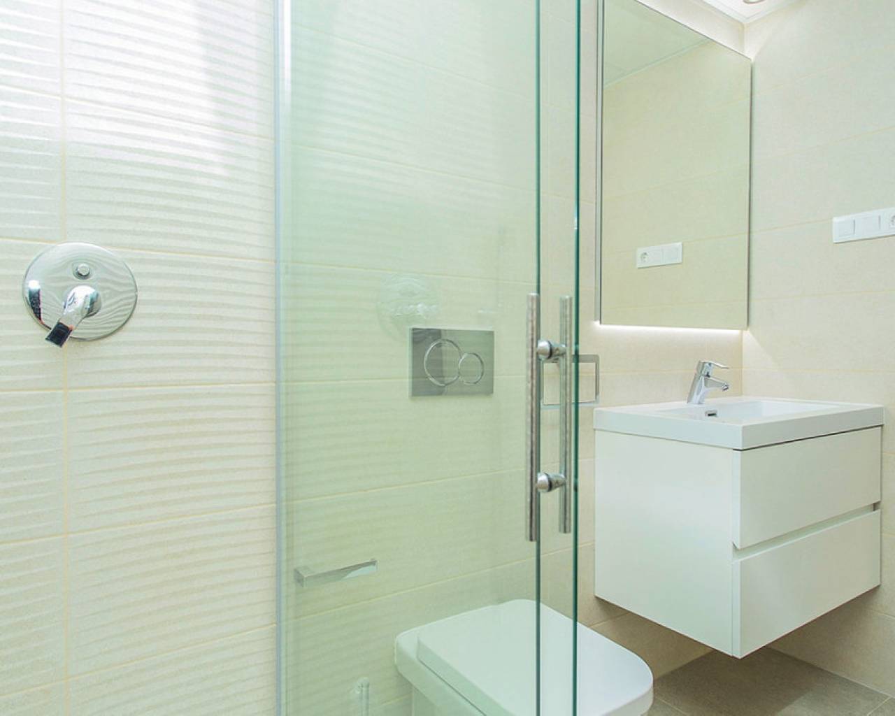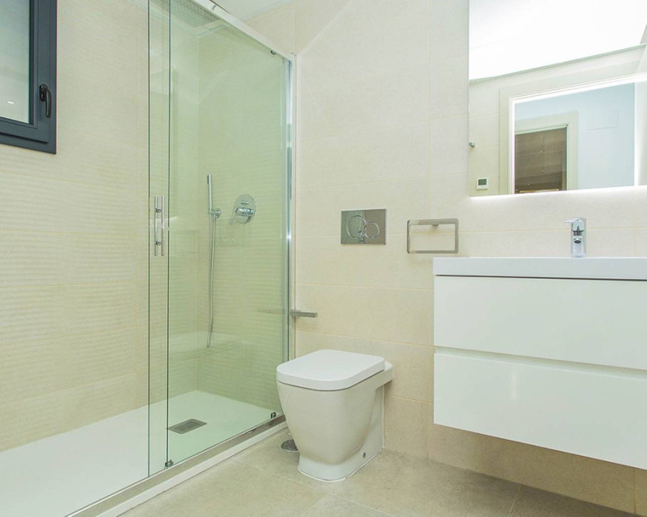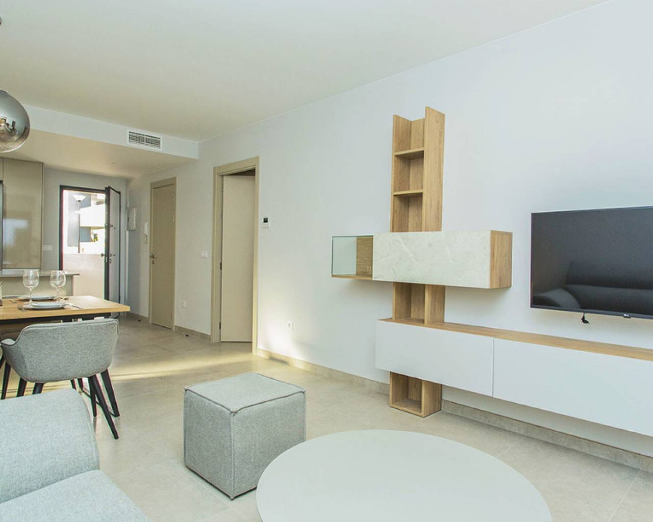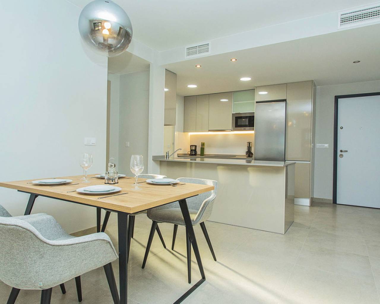Spacious ground floor apartment with a large terrace in the exclusive Flamenca Village development. It consists of two bedrooms and two bathrooms, a living-dining room with an open kitchen. It is sold furnished and the apartment includes an underground parking space plus 1 parking space for guests within the complex. Phase 3 was built in 2023 and the property has never been used, meaning it is practically considered a new build. Central air conditioning, modern kitchen with all top brand appliances, designer furniture, large terrace to enjoy the Mediterranean climate. The Flamenca Village residential complex offers several swimming pools, one of which is heated. Spa and gym, a poolside snack bar in the central pool area with a good atmosphere, 24-hour concierge area. Security patrolling within the complex, etc. The proximity of the Playa Flamenca shopping centre offers you all services on foot. Mercadona, restaurants, shops, cafes etc. and just 5 minutes from the famous La Zenia Boulevard shopping centre. You can walk to the beautiful Playa Flamenca beach, the distance to the sea is 500 meters. Don't hesitate to arrange a viewing! It's a unique opportunity to get an attractive home in one of the most sought-after residential areas on the coast.
