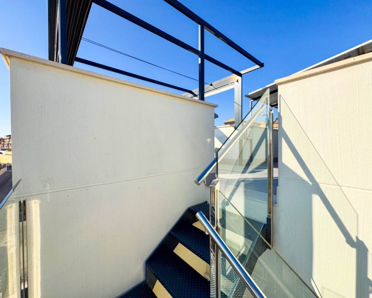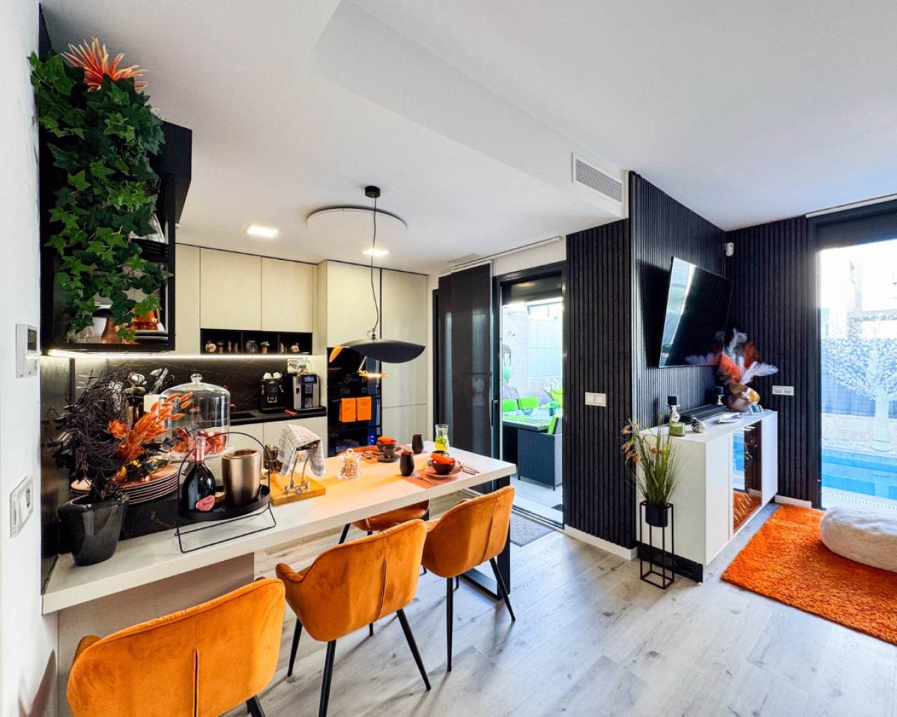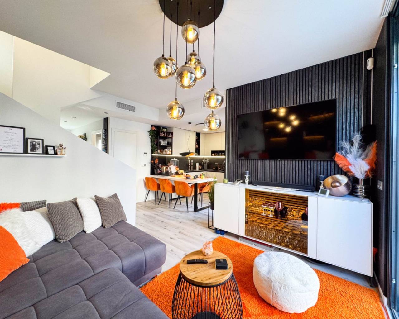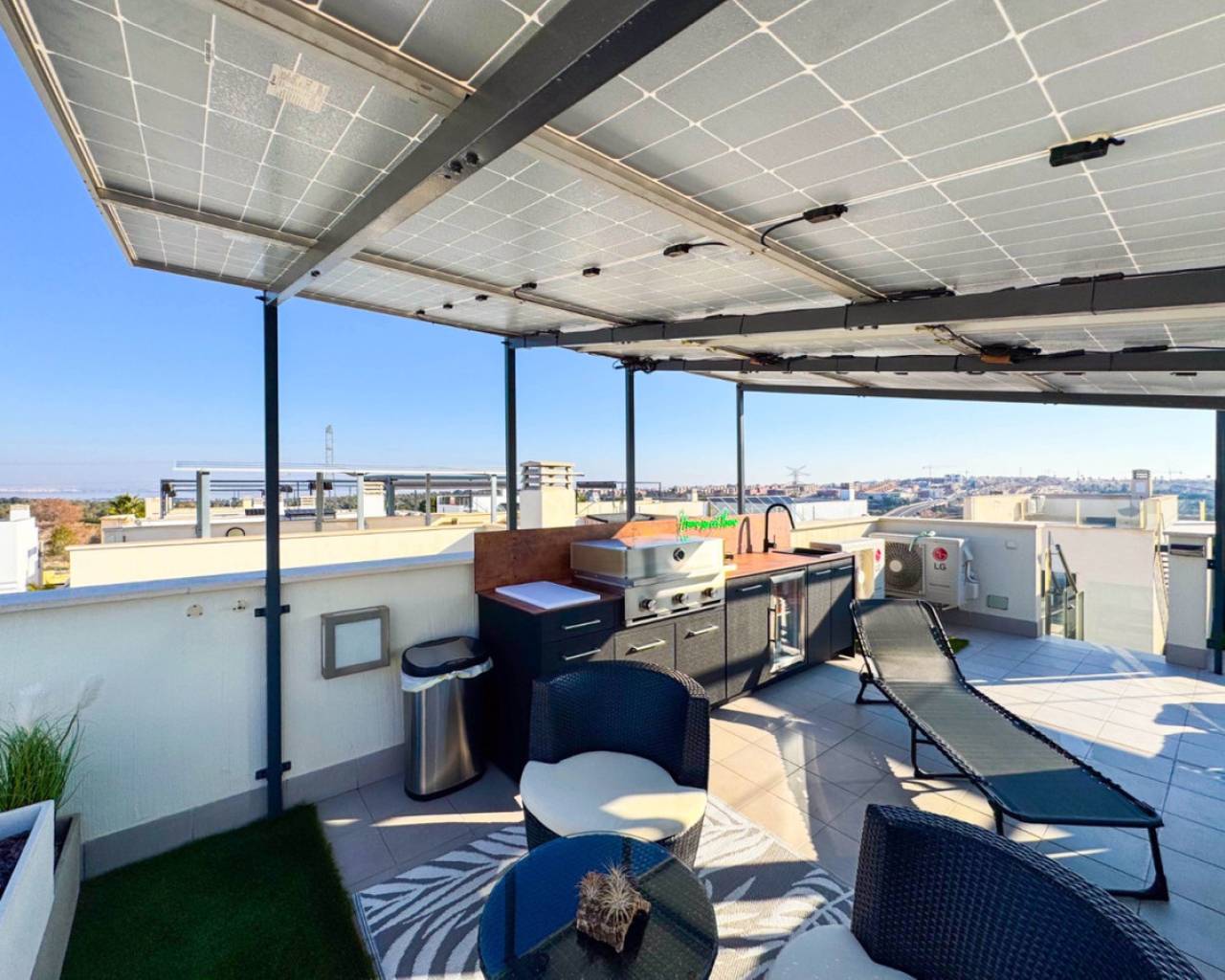 We present this spectacular 2-storey independent house with a private solarium, located in the exclusive and quiet PAU 26 area of Orihuela Costa, in the Residencial Entregolf urbanization. A modern and recently built home (2020), ideal for those seeking comfort, quality and proximity to all services. With 103 m² built on a 142 m² plot, this property stands out for its top quality finishes and its spacious spaces, designed for your comfort. On the ground floor, you will enjoy a spacious living room that connects to a charming terrace with a private 12 m² pool, accessible directly from the living room, creating a perfect environment to relax or enjoy social gatherings. The kitchen is modern and sophisticated, with a recent renovation that gives it functionality and style. In addition, it has a full bathroom, a bedroom and a pantry equipped with a washing machine and a water heater, offering convenience in everyday life. At the back of the plot, you will find an additional storage room, built by the owners, ideal for storing tools and other items. There is also a parking space at the front of the plot, with capacity for a small car. Going up to the first floor, there are 2 large bedrooms, with built-in wardrobes and pleasant views of the outdoor area. The floor is completed with another full bathroom with a modern and functional design. From this floor, you access a spectacular private solarium of 37 m², with a dining area, a pergola that will provide shade and a recently installed summer kitchen, perfect for enjoying sunny days and evenings outdoors. Additional features: Underfloor heating in the bathrooms, ensuring optimal comfort all year round. Large windows that bring light to each space and provide excellent ventilation. Electric blinds, for greater comfort and control of natural light. Infrared heating, an efficient and modern system to keep your home pleasant during the colder months. The house has 2.8 kW solar panels, which provide greater energy efficiency and reduce electricity consumption. The property is sold furnished and with high-quality appliances, ready to move into without the need for renovations or improvements. The property is located within the quiet and well-kept Residencial Entregolf development, which has a communal pool to enjoy refreshing swims in summer and communal parking for residents. Its location is unbeatable, with quick access to the motorway and just 1 km from the Lidl supermarket and 2 km from the Zenia Boulevard shopping centre, where you will find a wide variety of shops, restaurants and entertainment. In addition, the beach is only 2 km away, allowing you to enjoy the Mediterranean coast in just a few minutes. Take advantage of the opportunity to live in a modern house, in a quiet area, surrounded by nature and close to all services. This is your chance to live the way you've always dreamed!