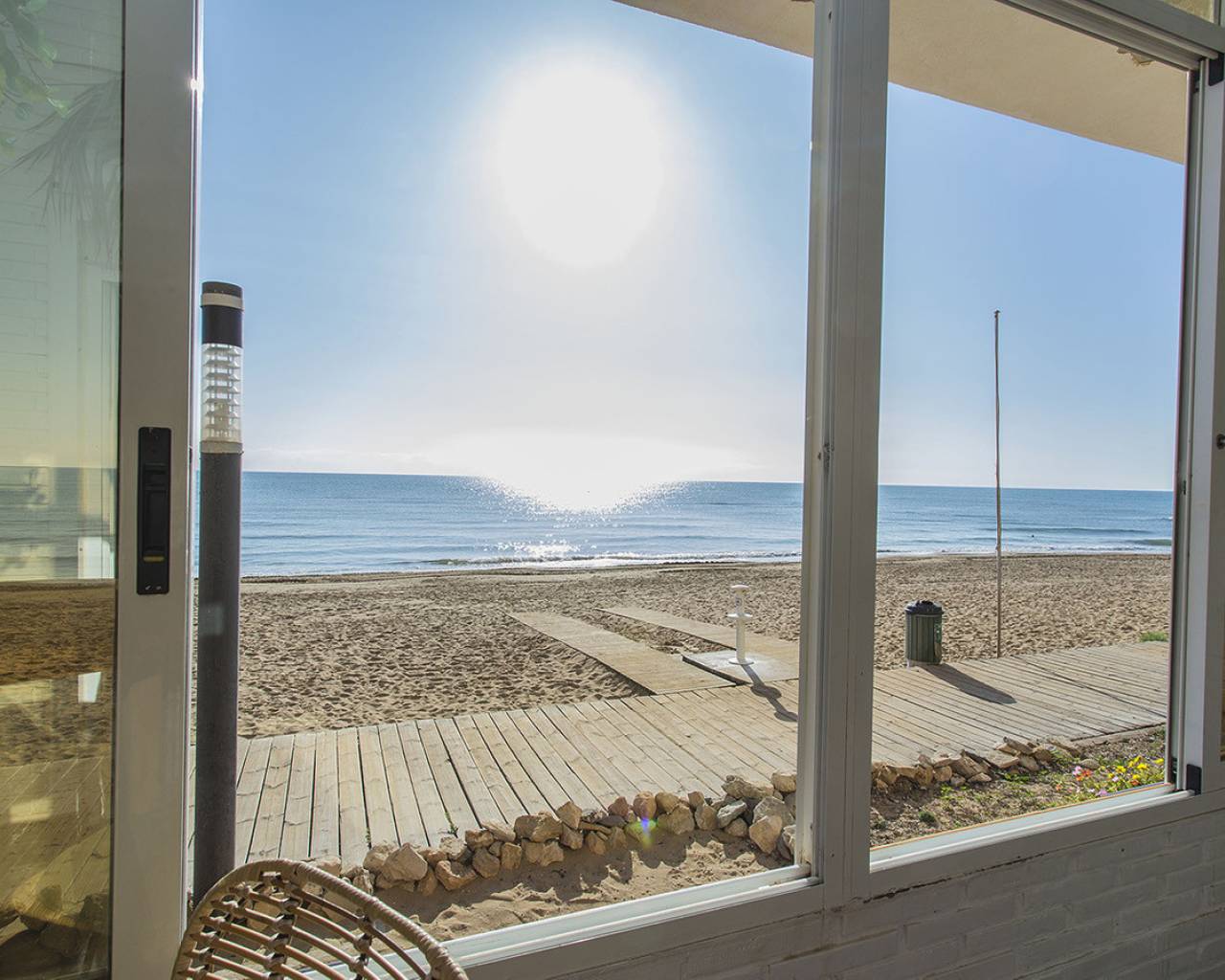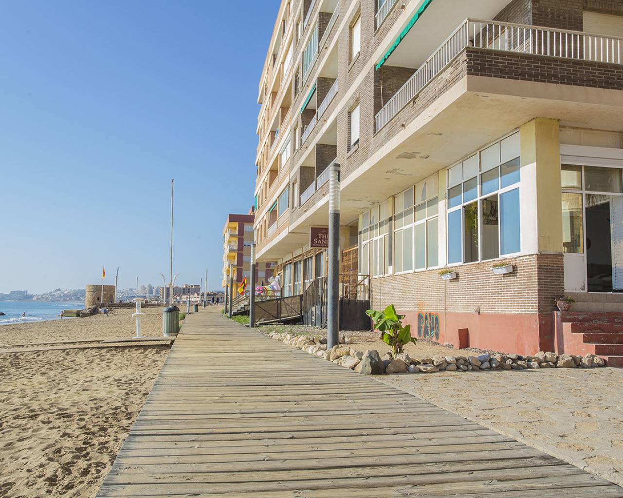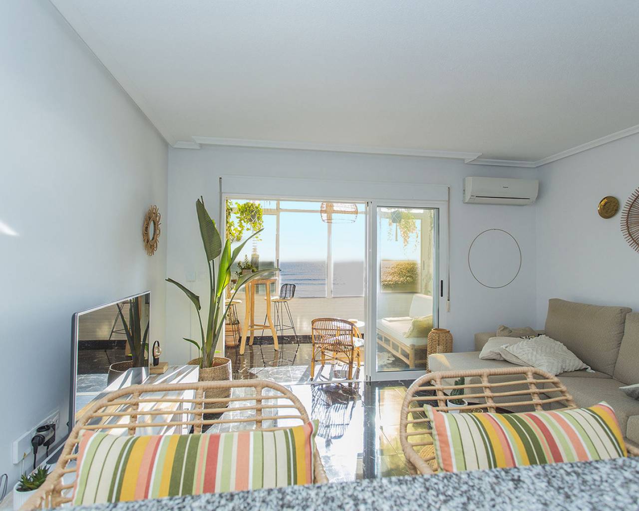 In the most exclusive location of La Mata in Torrevieja you will find this 2 bedroom apartment with fantastic sea views! Practically above the beach with direct access to the sand from the balcony. It is a ground floor, recently renovated. You just have to open the windows and you can hear the sound of the waves. Tastefully renovated and ready to move in! It consists of two bedrooms, a bathroom and a large living room with an open kitchen. Quality appliances and inverter type air conditioning. It is being sold fully furnished and is already being rented out through our successful holiday rental service. It generates good income. It has beautiful marble floors and the apartment is on a corner which allows for lots of light. I invite you to visit this apartment that has views and qualities that are very rare. Call us to arrange a visit!