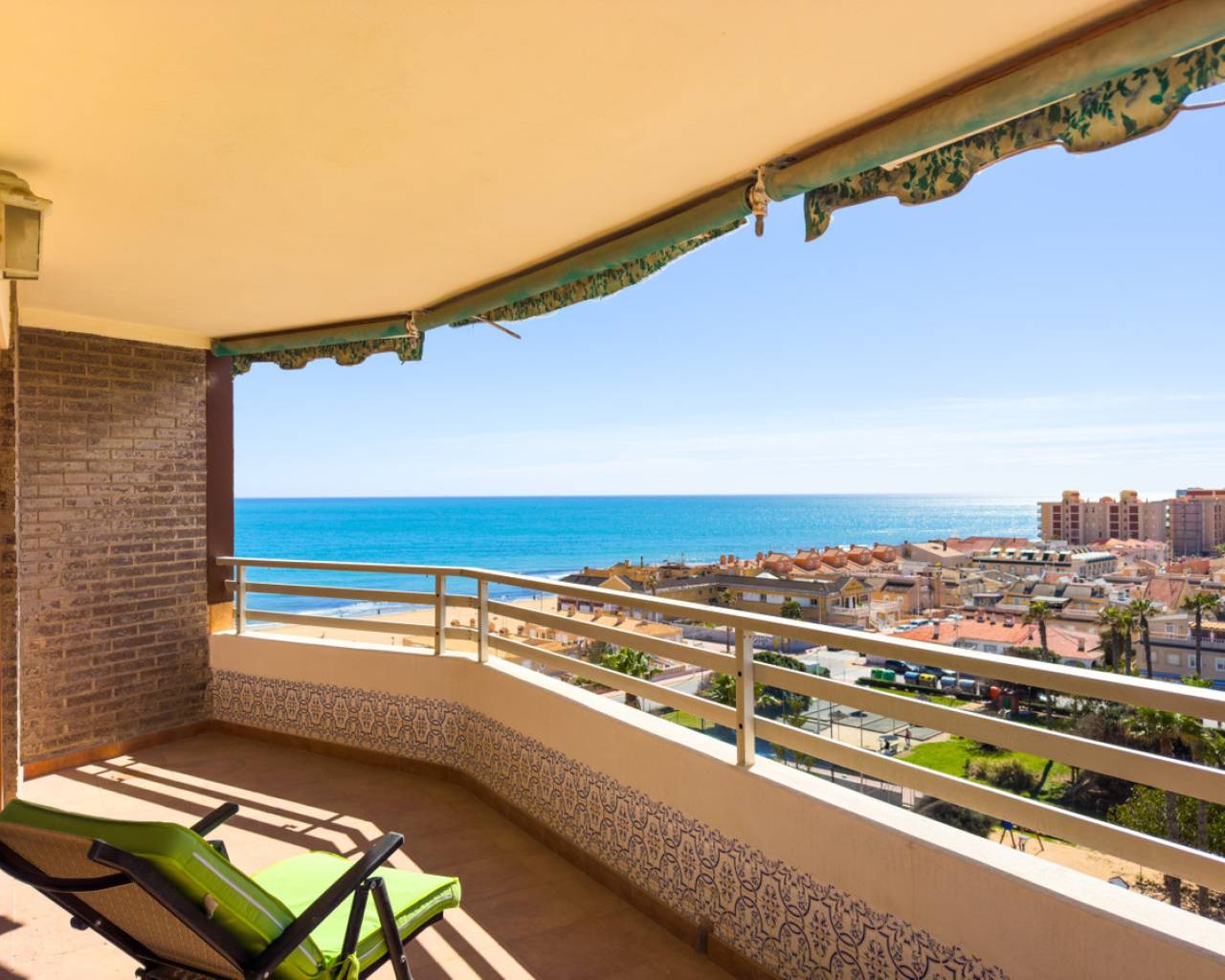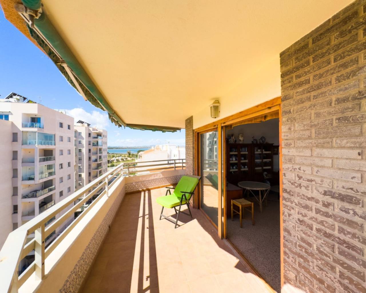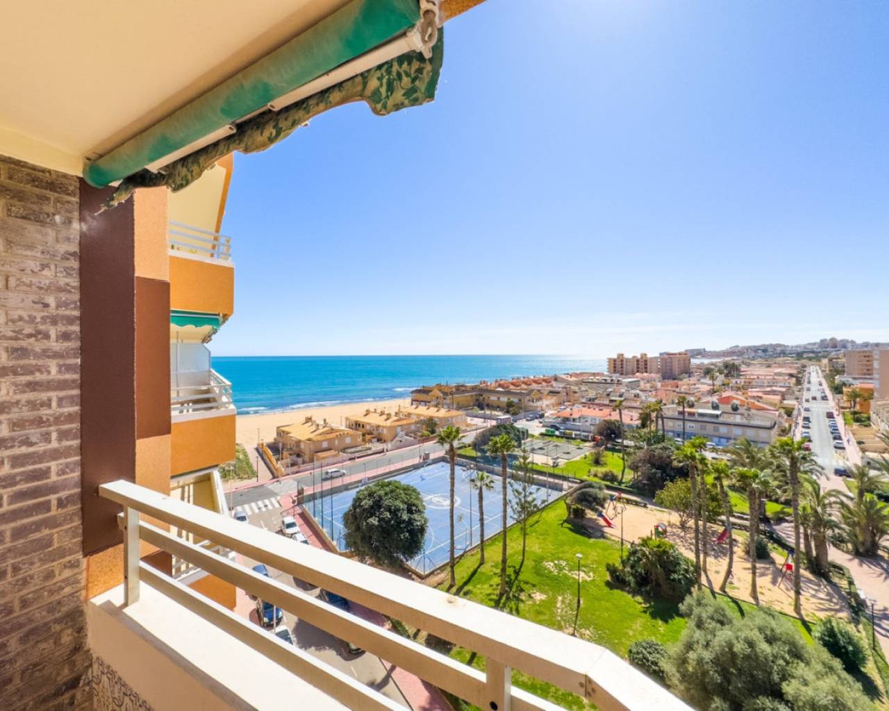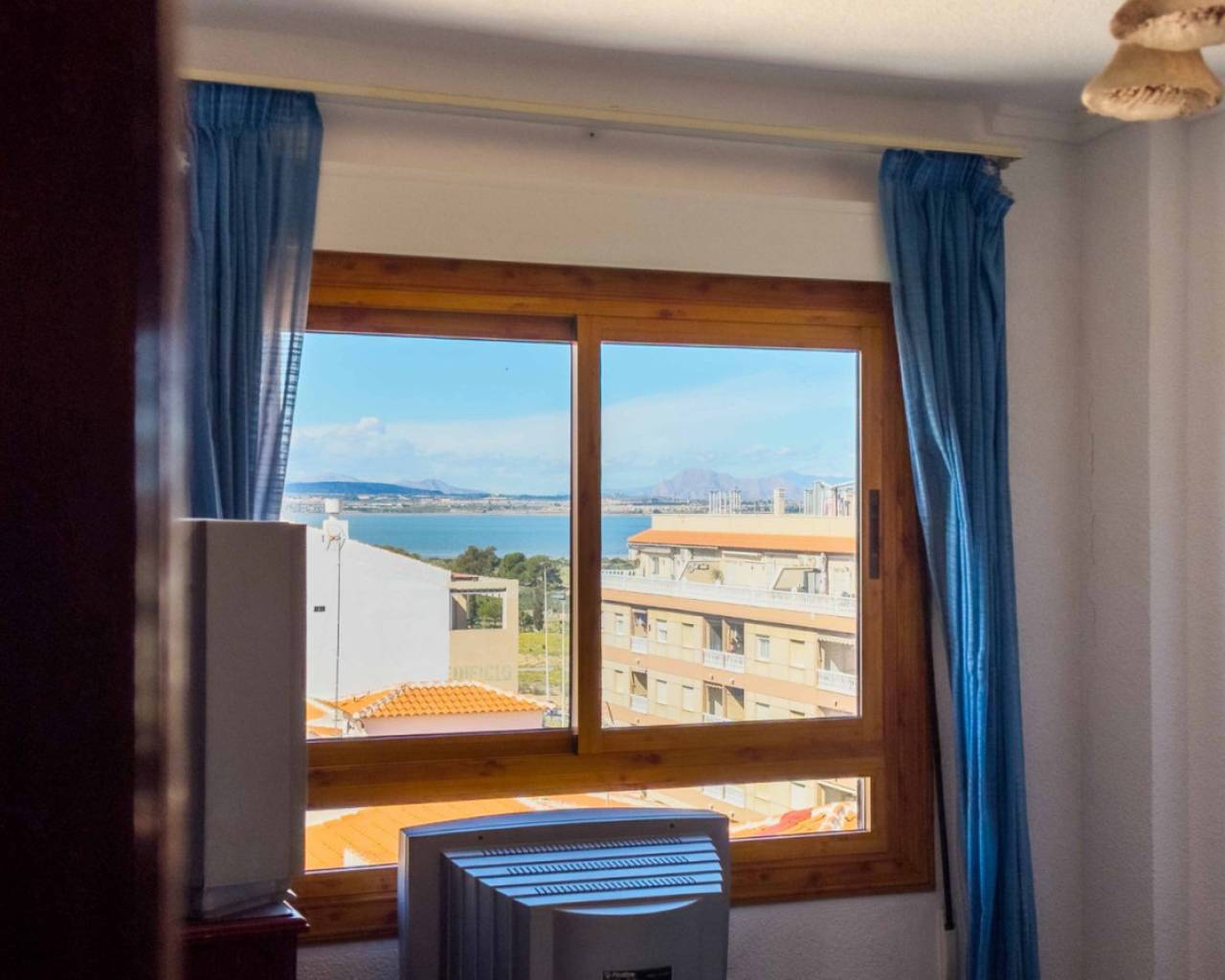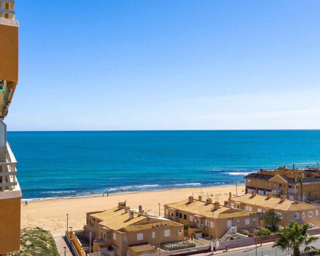 A very spacious beachfront apartment is for sale in the center of La Mata, Torrevieja. The apartment is located in the heart of the town and boasts beautiful lateral sea views from the exterior. It is located on the seventh floor of a building with two elevators and a ramp for people with reduced mobility. The apartment is distributed as follows: a spacious living-dining room with access to the terrace, which is approximately 23 m2 southeast-facing and offers beautiful sea views, three bedrooms with all exterior windows and built-in wardrobes, a separate kitchen with all appliances and access to the utility room, and two full bathrooms with showers. In the basement of the same building, there is a parking space, which is included in the price. The property has an excellent location, a stone's throw from the beach and just 2 minutes from the center of La Mata, with all amenities nearby, such as supermarkets, local shops (food and other services), and restaurants. Call us to arrange a viewing! If you'd like a virtual tour or a floor plan of the property, please don't hesitate to contact us. This property could also be an excellent investment, and we offer our successful seasonal rental service. Contact us for more information.