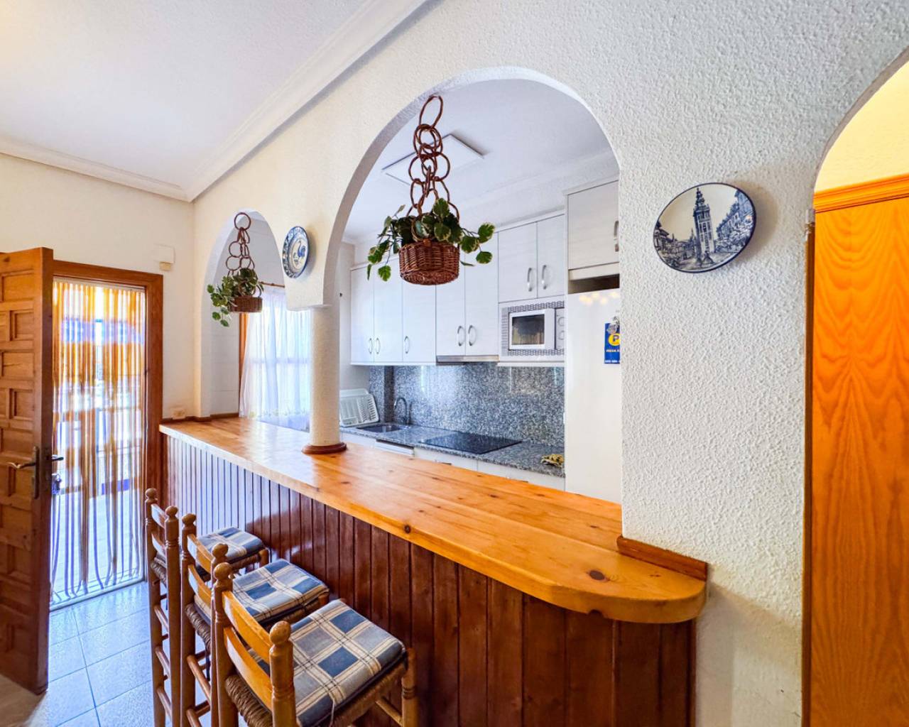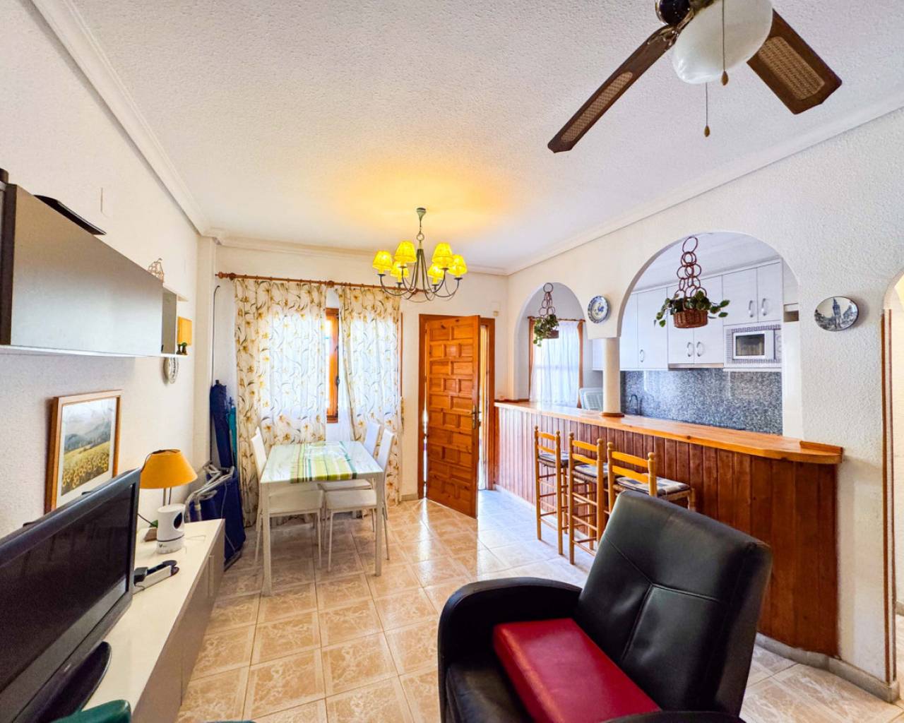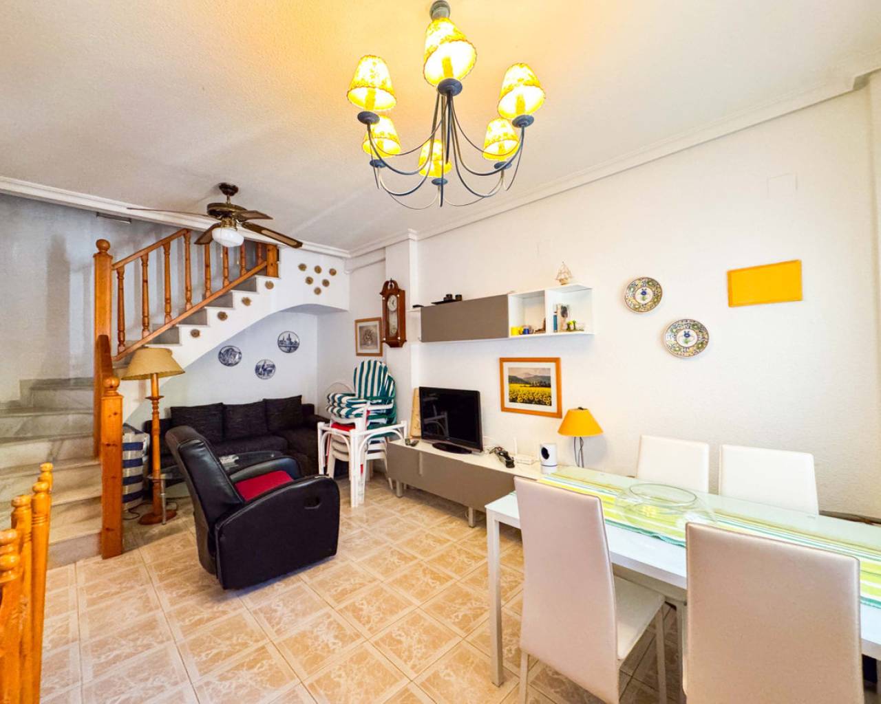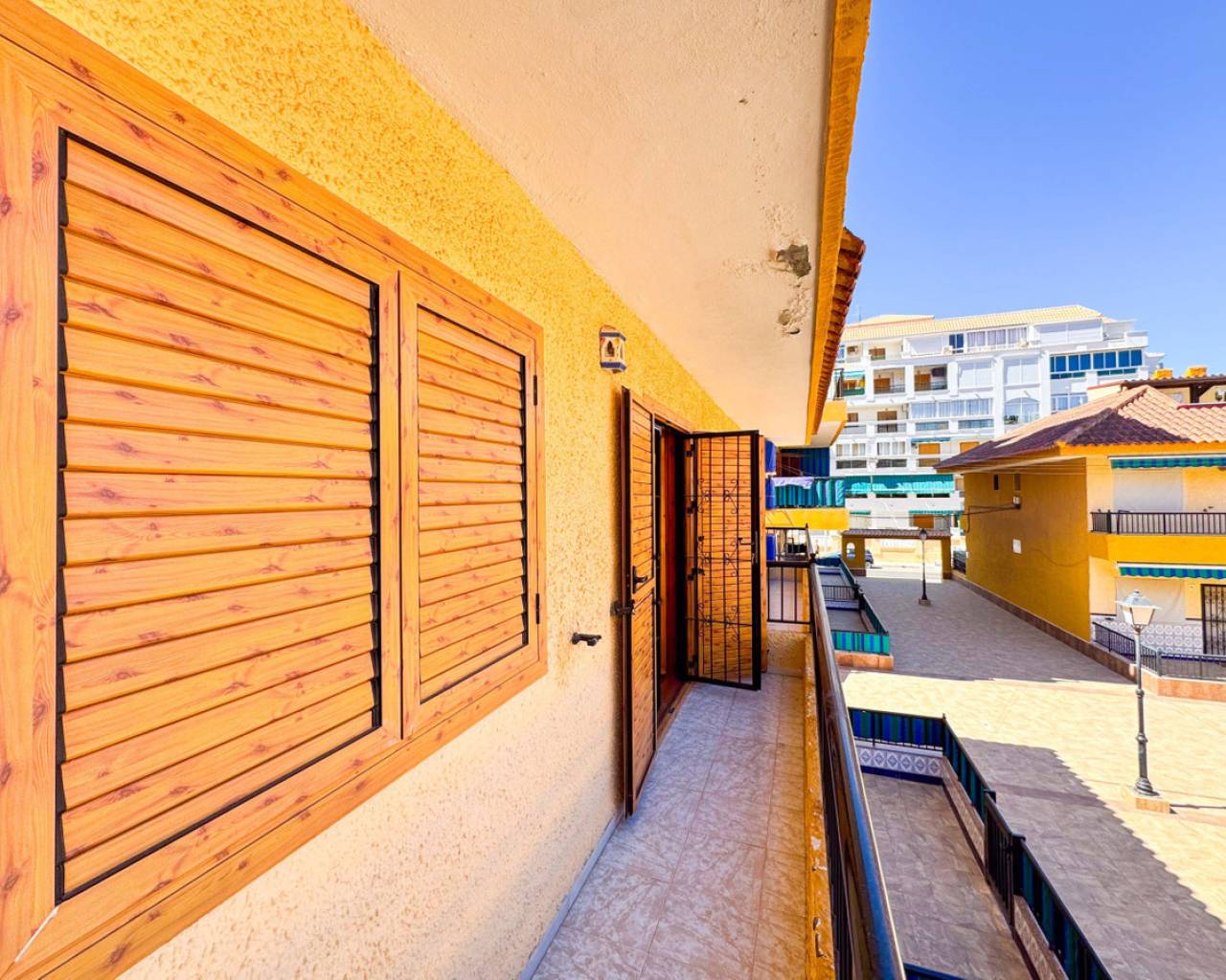 Townhouse in Viñamar 1, La Mata, Torrevieja featuring a community pool and a 15 m2 terrace. This property offers a comfortable layout perfect for coastal living. The ground floor has a spacious living-dining room, open kitchen, and a guest toilet. Upstairs there are two bedrooms with built-in wardrobes, one with a balcony, and a full bathroom. Located only 250 meters from La Mata beach, it is close to restaurants, supermarkets, and bus stops, providing easy access to amenities and leisure. The community pool offers a relaxing outdoor space for the family. This townhouse is ideal for those seeking a home in a quiet area with all conveniences nearby. We recommend a physical visit or virtual tour and floor plan request. It is also an attractive investment opportunity with seasonal rental service. Contact us for more information and to arrange a visit.