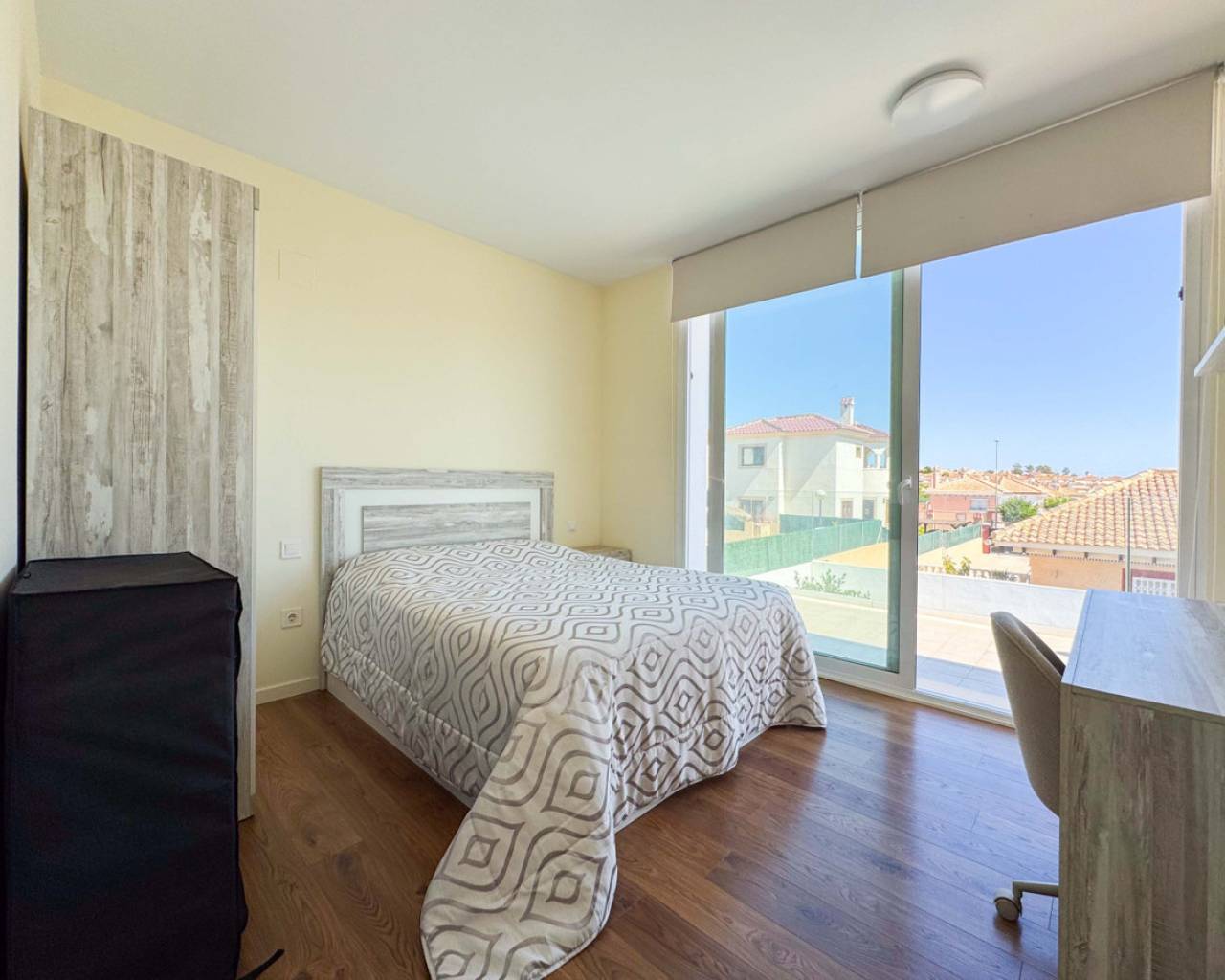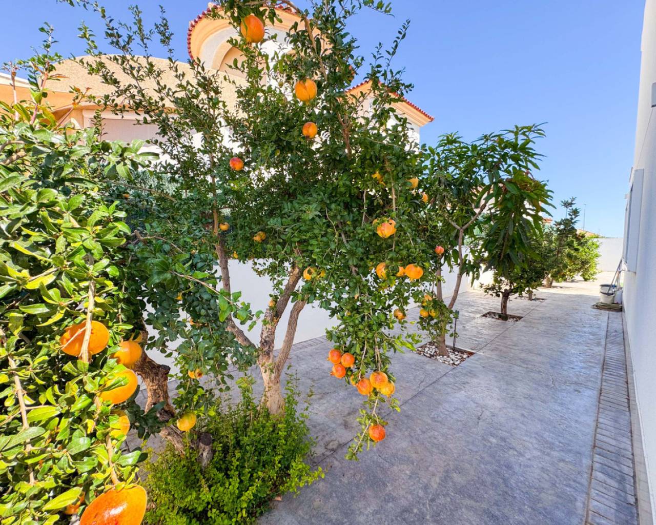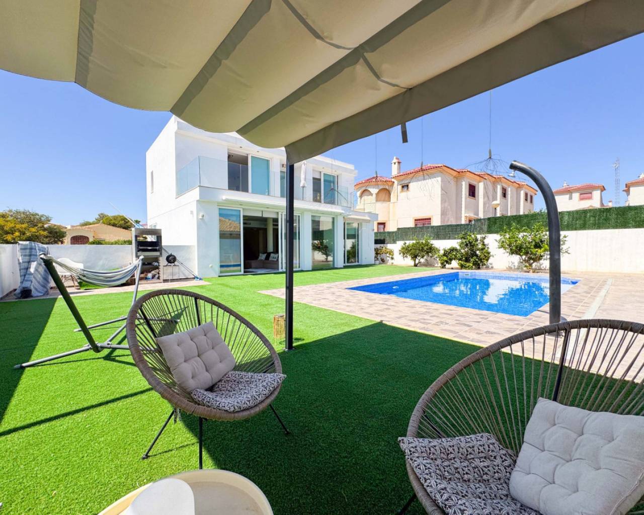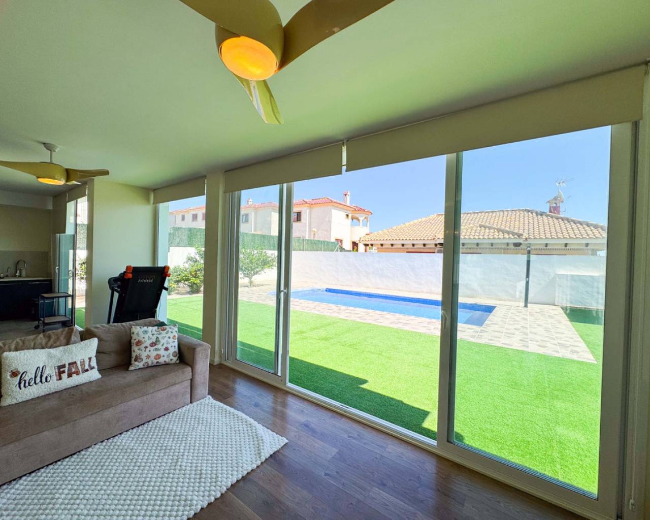 Modern villa located in San Fulgencio, La Marina Oasis area, featuring a sun-oriented pool, sauna, and double garage. This renovated and well-maintained property includes solar panels and two pergolas providing shade and elegance outdoors.The layout is spacious and practical: the upper floor has three bedrooms, two bathrooms, and a walk-in closet, plus a large balcony connecting the bedrooms, perfect for enjoying views and fresh air. The main floor offers one bedroom, a large open-plan kitchen, living room and dining area with views of the mountains and pool, creating a bright and welcoming space.The lower floor contains a laundry room, shower, sauna, two additional bedrooms, a large storage room fitted as a home cinema, a pool motor room, and a leisure room. This villa combines comfort, space, and amenities perfectly.La Marina Oasis in San Fulgencio is a quiet area with nearby services and easy access to beaches and shopping centers. It is an excellent option for permanent residence or investment with seasonal rental potential. Schedule a physical visit, virtual tour, or request floor plans. Contact us for more details and to arrange your visit.---