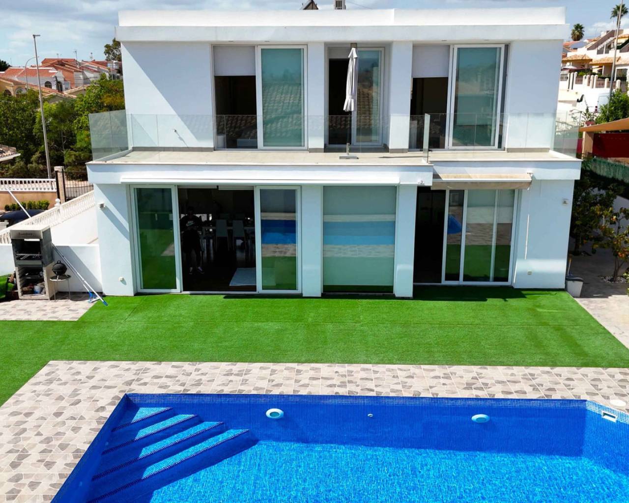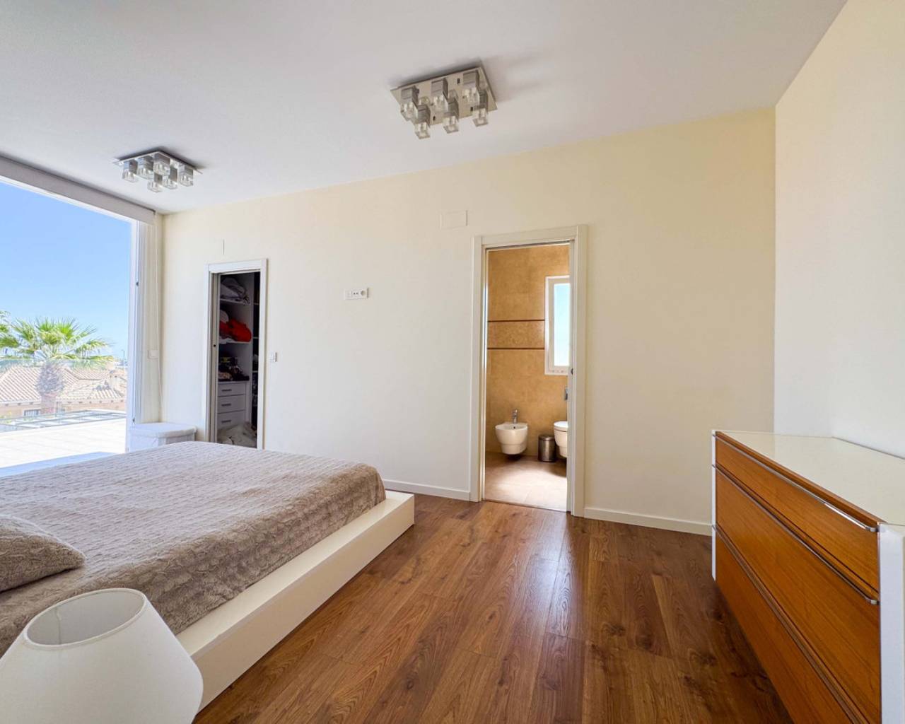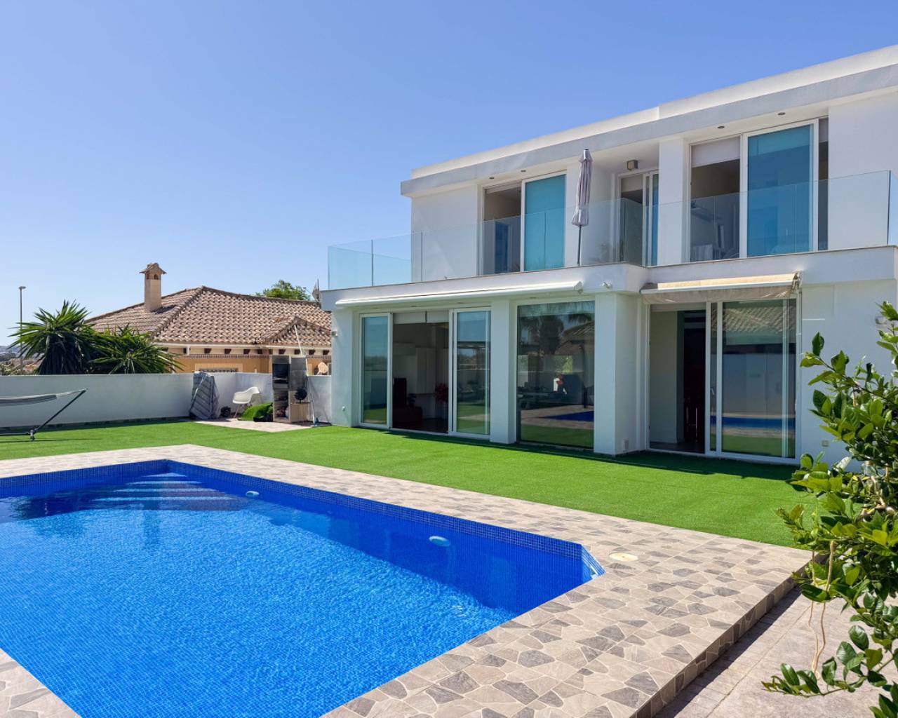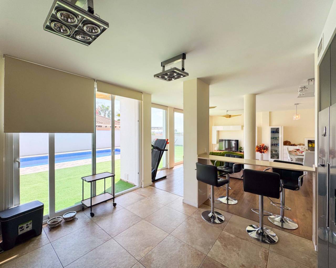 Modern villa located in San Fulgencio, La Marina Oasis area, featuring a sun-oriented pool, sauna, and double garage. This renovated and well-maintained property includes solar panels and two pergolas providing shade and elegance outdoors.The layout is spacious and practical: the upper floor has three bedrooms, two bathrooms, and a walk-in closet, plus a large balcony connecting the bedrooms, perfect for enjoying views and fresh air. The main floor offers one bedroom, a large open-plan kitchen, living room and dining area with views of the mountains and pool, creating a bright and welcoming space.The lower floor contains a laundry room, shower, sauna, two additional bedrooms, a large storage room fitted as a home cinema, a pool motor room, and a leisure room. This villa combines comfort, space, and amenities perfectly.La Marina Oasis in San Fulgencio is a quiet area with nearby services and easy access to beaches and shopping centers. It is an excellent option for permanent residence or investment with seasonal rental potential. Schedule a physical visit, virtual tour, or request floor plans. Contact us for more details and to arrange your visit.---