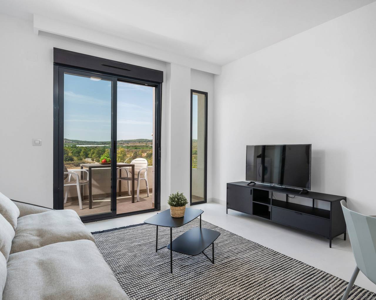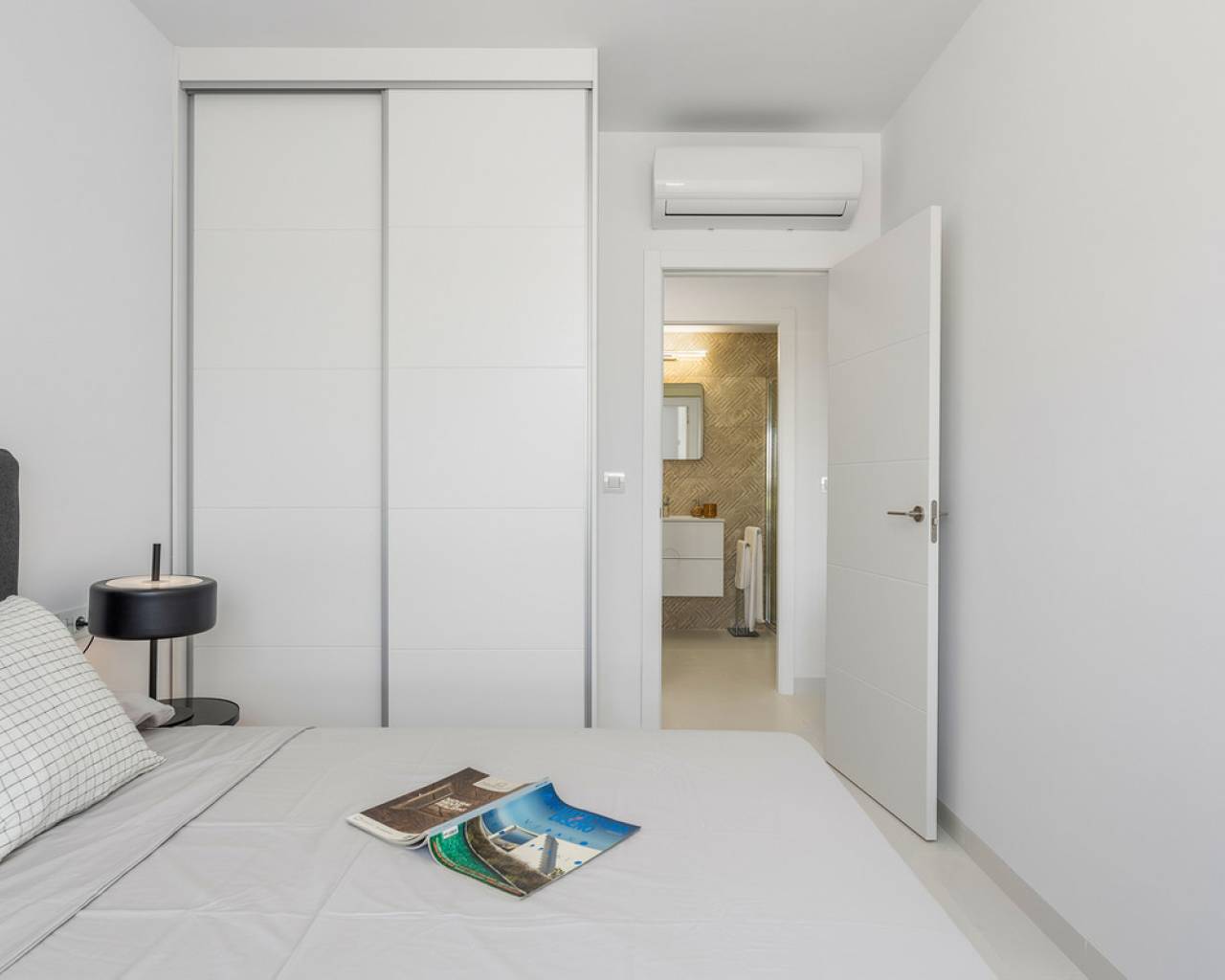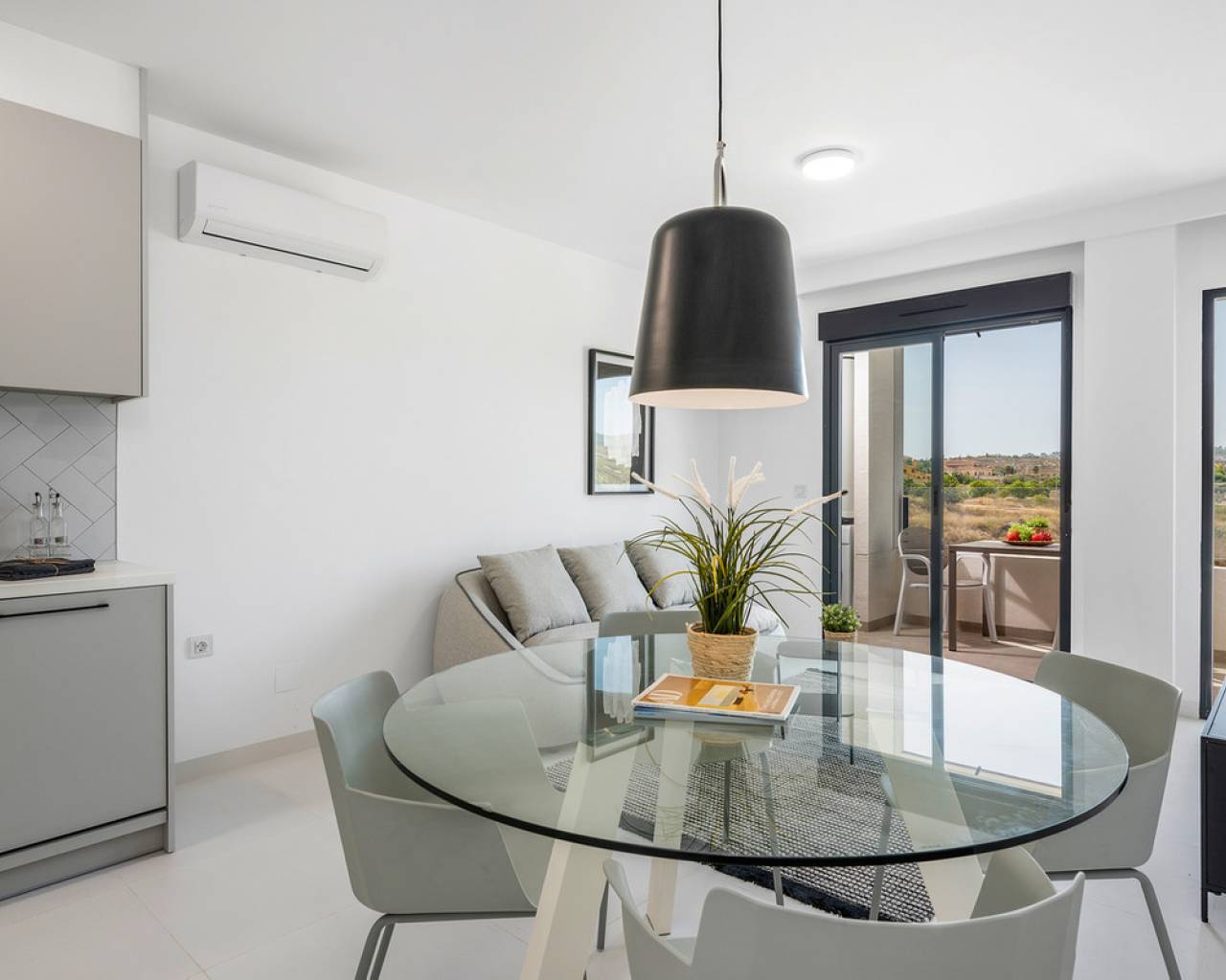 This beautiful 2-bedroom second floor apartment with terrace is situated in the sought after area of San Miguel de Salinas, within walking distance to all local bars, supermarkets and restaurants. The property will be sold fully furnished and consists of a bright living/dining room, a fully equipped open plan kitchen, two bedrooms with fitted wardrobes, two bathrooms with underfloor heating, and a sunny terrace. Storage room and parking space in the underground garage is also included in the price. There is a beautiful communal garden with swimming pool to enjoy the Spanish weather all year long! Close to all amenities and several leisure areas nearby such as beautiful golf courses, many shopping centres, and only 10 minutes from the pristine white sandy Orihuela Costa/Torrevieja beaches and La Zenia Boulevard shopping centre.