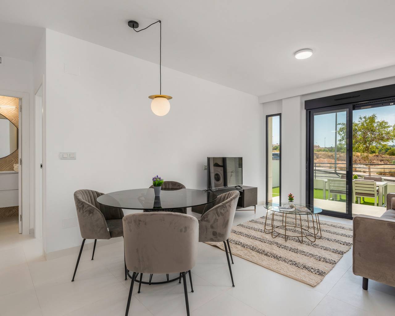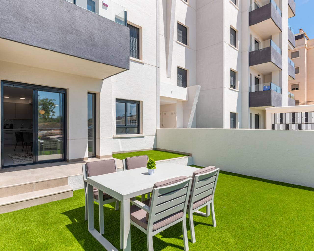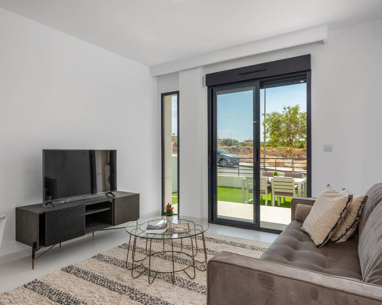 This beautiful 1-bedroom ground floor apartment with large private garden is situated in the sought after area of San Miguel de Salinas, within walking distance to all local bars, supermarkets and restaurants. The property will be sold fully furnished and consists of a bright living/dining room, a fully equipped open plan kitchen, one bedroom, one bathroom with underfloor heating, and a sunny terrace/garden (37sqm) with a handy utility room. There is a beautiful communal garden with swimming pool to enjoy the Spanish weather all year long! Close to all amenities and several leisure areas nearby such as beautiful golf courses, many shopping centres, and only 10 minutes from the pristine white sandy Orihuela Costa/Torrevieja beaches and La Zenia Boulevard shopping centre.