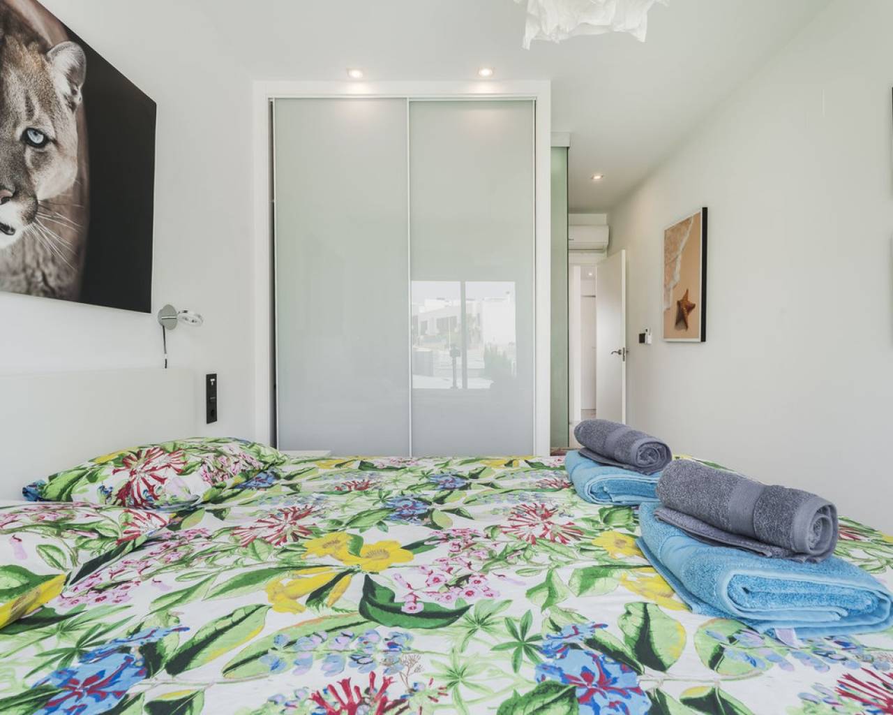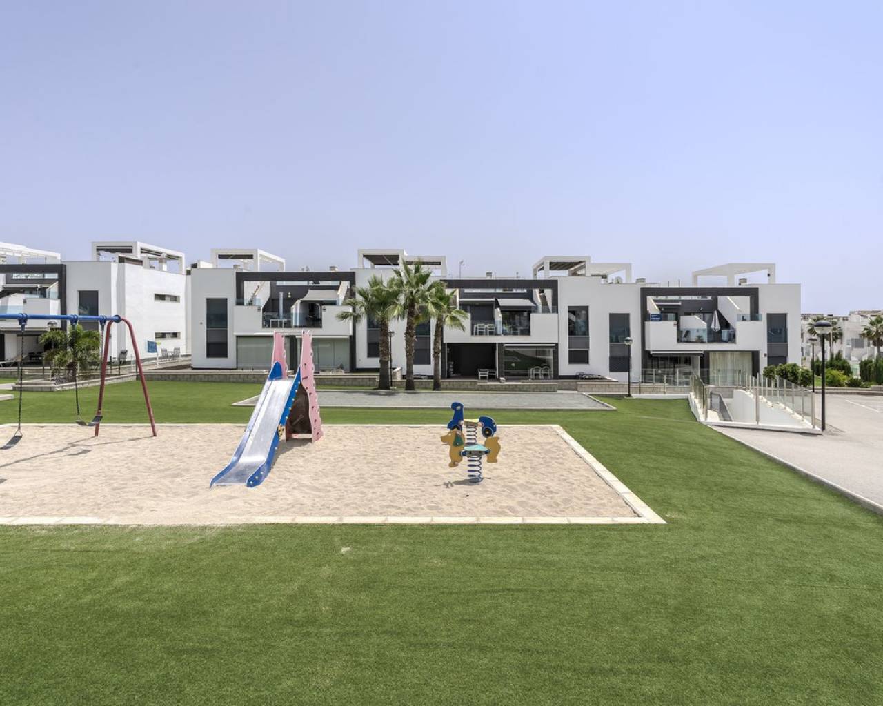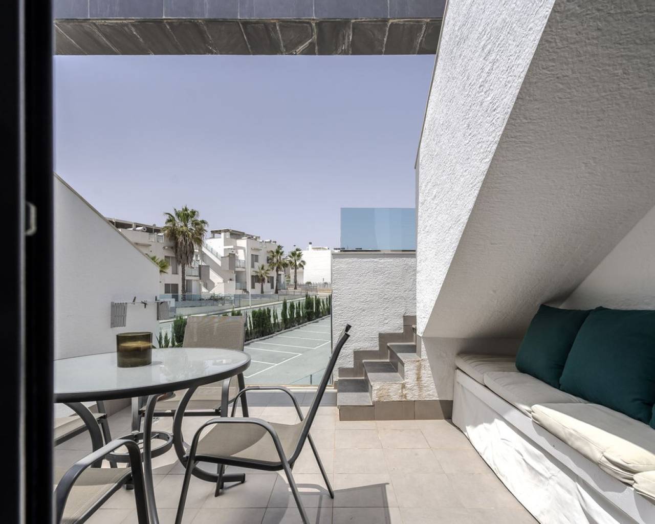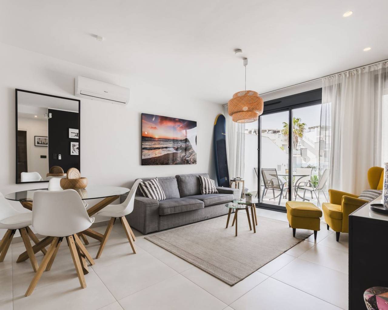 Welcome to this contemporary and stylish apartment, built in 2016, located in the sought-after area of Punta Prima on the Costa Blanca. Set within an exclusive, well-maintained residential community, this property is ideal as a holiday home, a permanent residence, or an investment with excellent rental potential. The apartment features two spacious bedrooms with fitted wardrobes and two fully tiled bathrooms, including one ensuite. The open-plan kitchen and living area create a bright, airy atmosphere and open directly onto a charming balcony. Upstairs, you will find a private roof terrace of approximately 58 m², complete with an outdoor kitchen, pergola, and ample space for sun loungers, dining, and relaxing under the Spanish sun. From the terrace, enjoy views of the surrounding area and glimpses of the Mediterranean Sea. Additional amenities include air conditioning throughout the apartment, a private garage space, and access to a communal pool area surrounded by sunbathing spots and greenery – perfect for both adults and children. The location is unbeatable, within walking distance to the sea, restaurants, shops, and all necessary services.