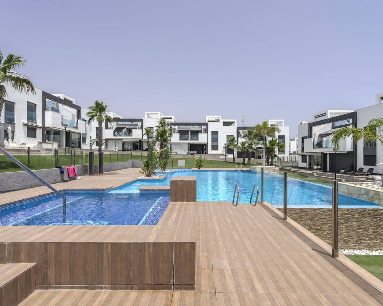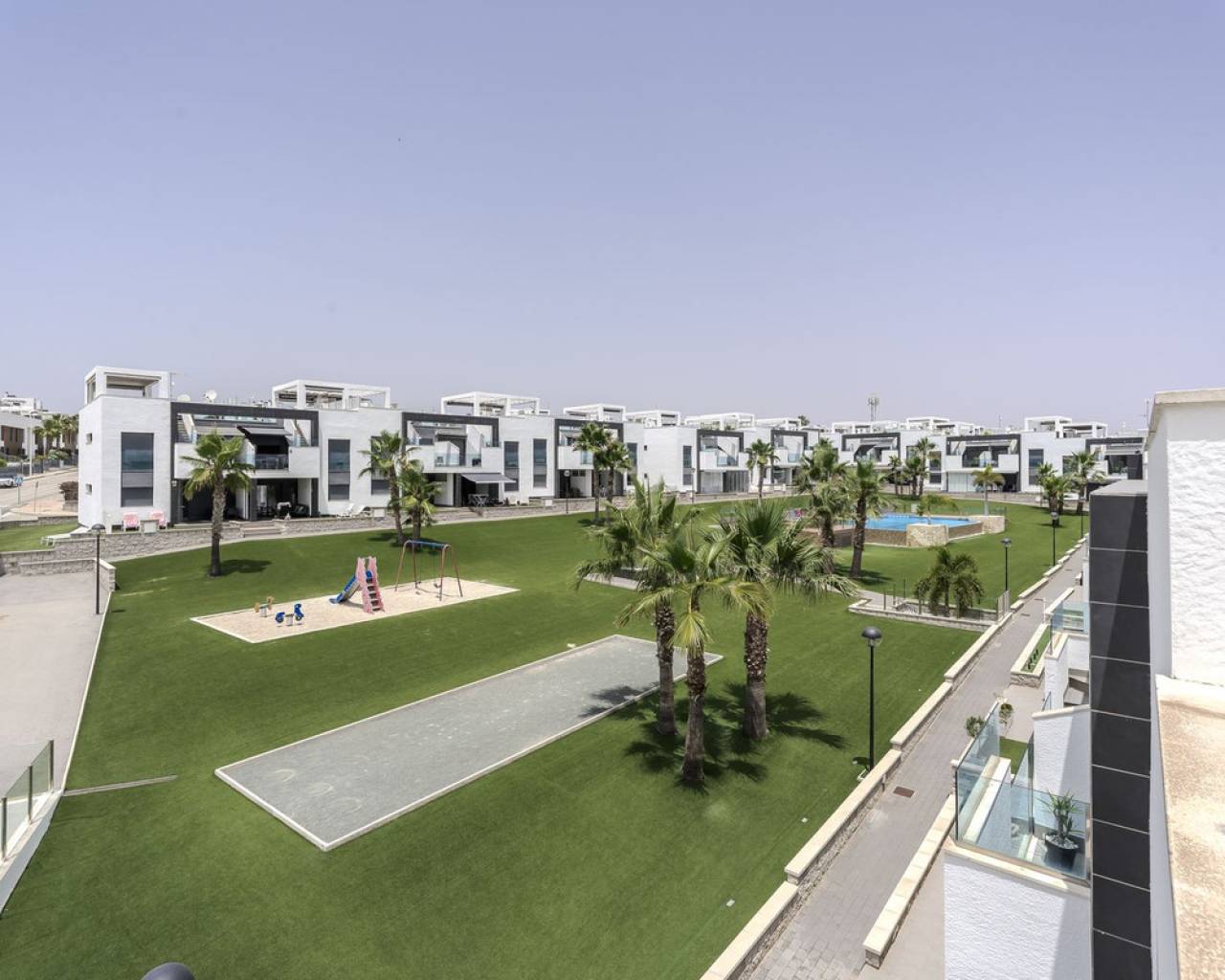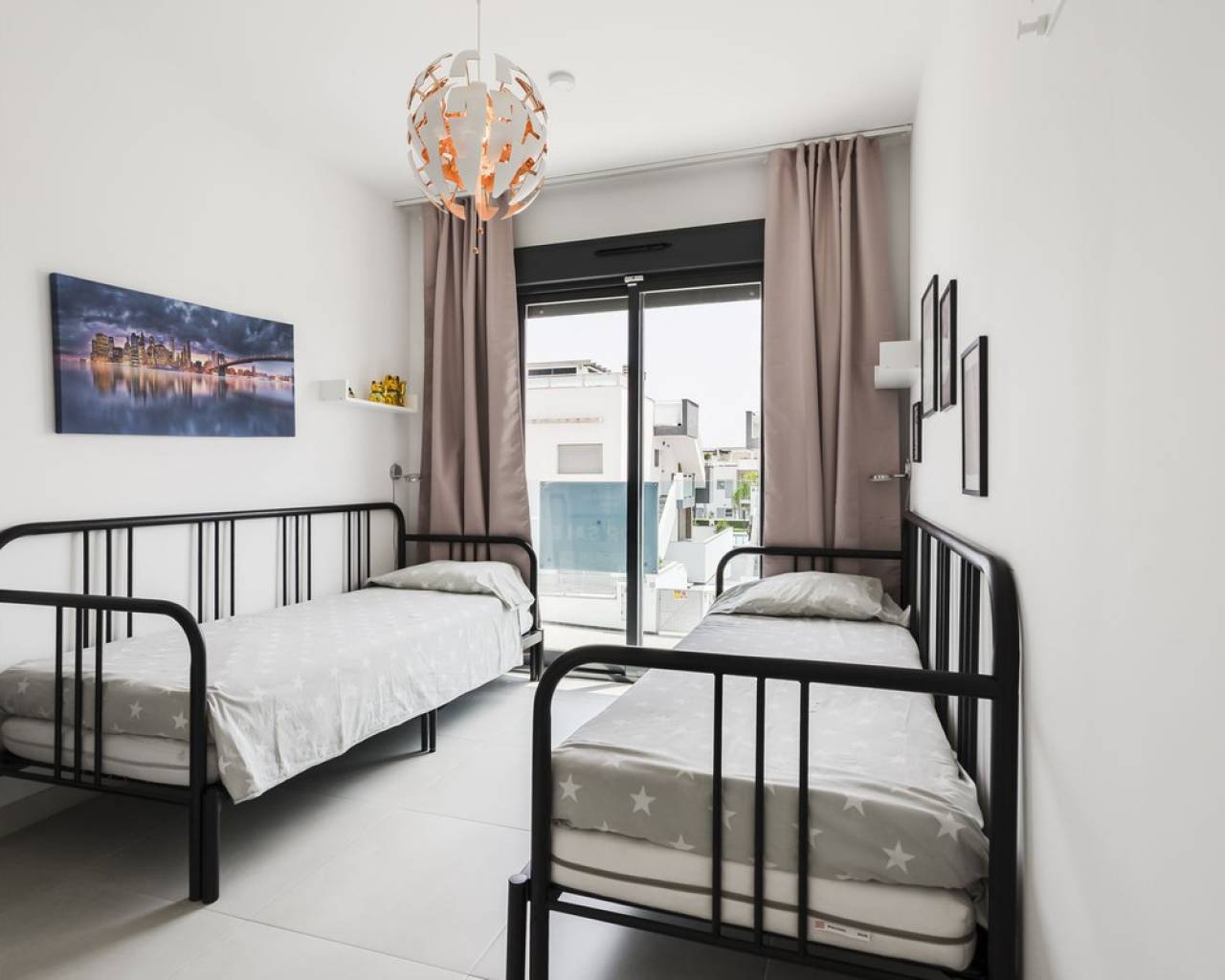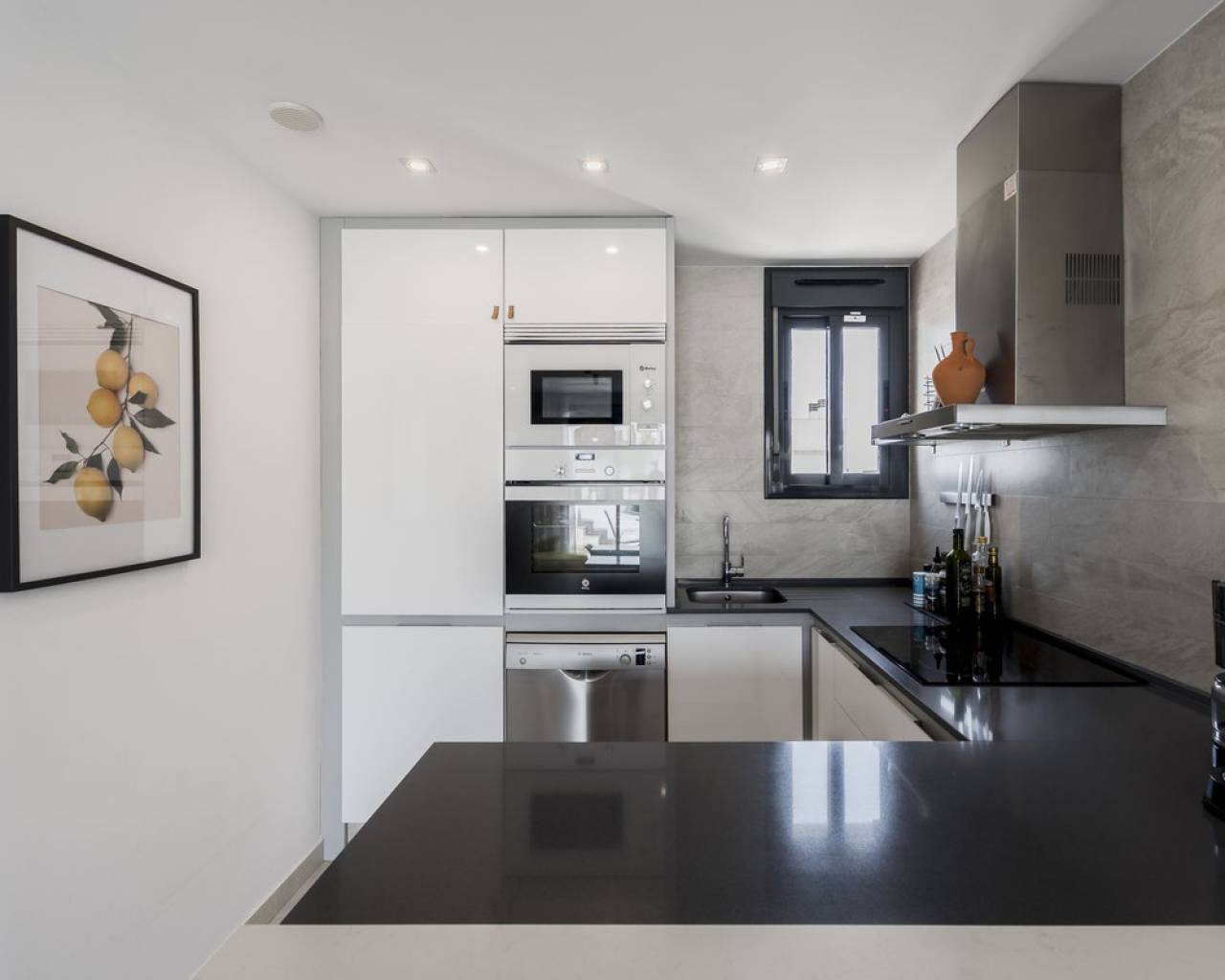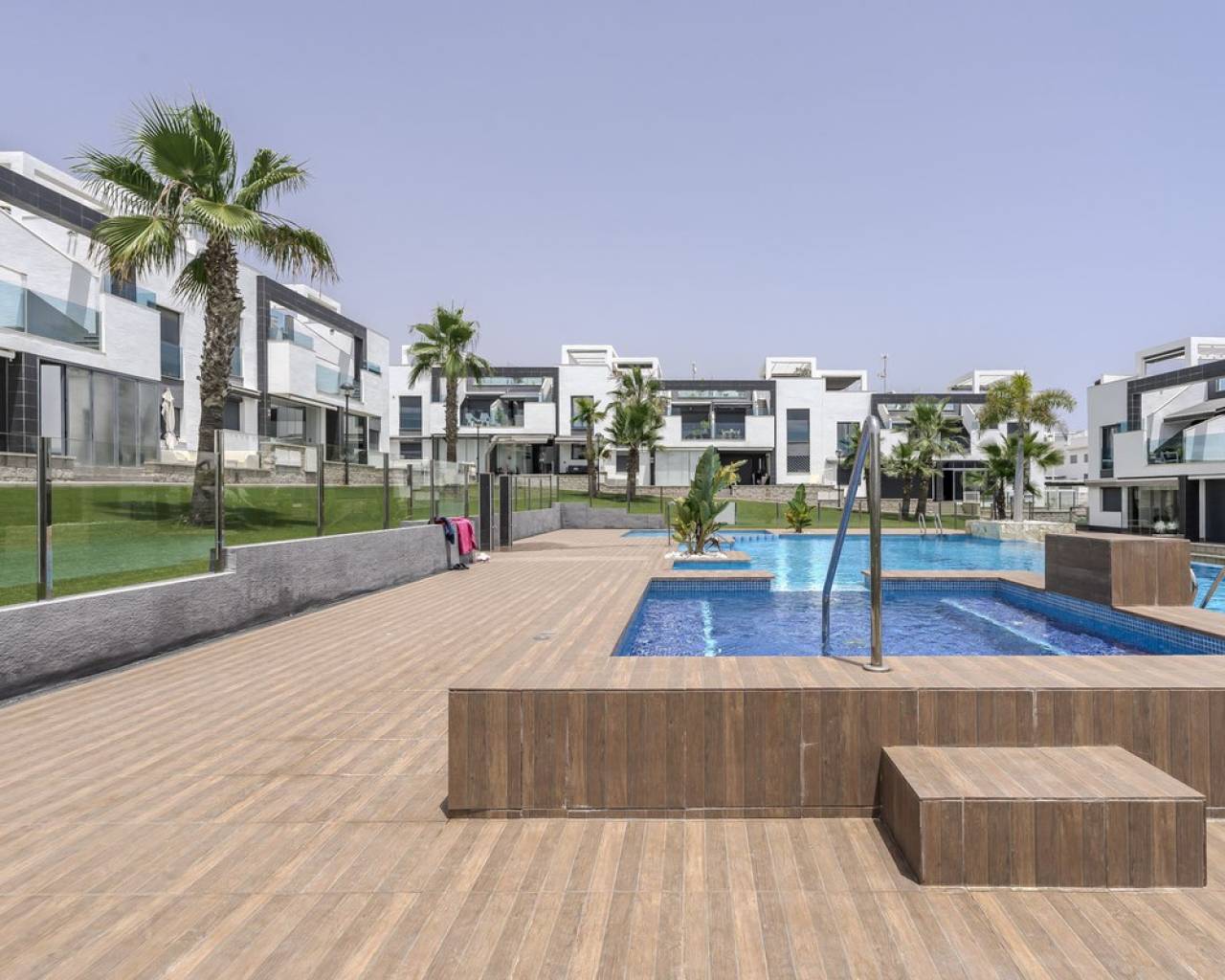 Welcome to this contemporary and stylish apartment, built in 2016, located in the sought-after area of Punta Prima on the Costa Blanca. Set within an exclusive, well-maintained residential community, this property is ideal as a holiday home, a permanent residence, or an investment with excellent rental potential. The apartment features two spacious bedrooms with fitted wardrobes and two fully tiled bathrooms, including one ensuite. The open-plan kitchen and living area create a bright, airy atmosphere and open directly onto a charming balcony. Upstairs, you will find a private roof terrace of approximately 58 m², complete with an outdoor kitchen, pergola, and ample space for sun loungers, dining, and relaxing under the Spanish sun. From the terrace, enjoy views of the surrounding area and glimpses of the Mediterranean Sea. Additional amenities include air conditioning throughout the apartment, a private garage space, and access to a communal pool area surrounded by sunbathing spots and greenery – perfect for both adults and children. The location is unbeatable, within walking distance to the sea, restaurants, shops, and all necessary services.