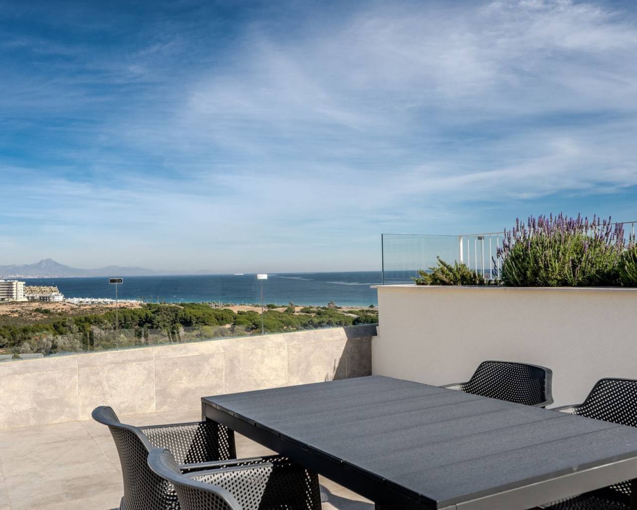 Welcome to this contemporary property in Gran Alacant, completed in 2023 and set in an elevated position with breathtaking, unobstructed sea views. The home features three generous bedrooms and two elegant bathrooms, thoughtfully designed to balance comfort and practicality. The bright, open-plan living areas are seamlessly connected through large windows that flood the interior with natural light and enhance the sense of space. At the top, a stunning rooftop terrace awaits, offering sunshine throughout the day and an ideal setting for relaxation, outdoor dining, or social gatherings with spectacular views. The property also benefits from a private storage room and garage, providing convenient parking and extra storage. Residents can enjoy a well-designed communal pool area, perfect for both leisure and peaceful days by the water. This is a modern home that perfectly blends stylish design with one of the most desirable locations in Gran Alacant—ready for immediate enjoyment.