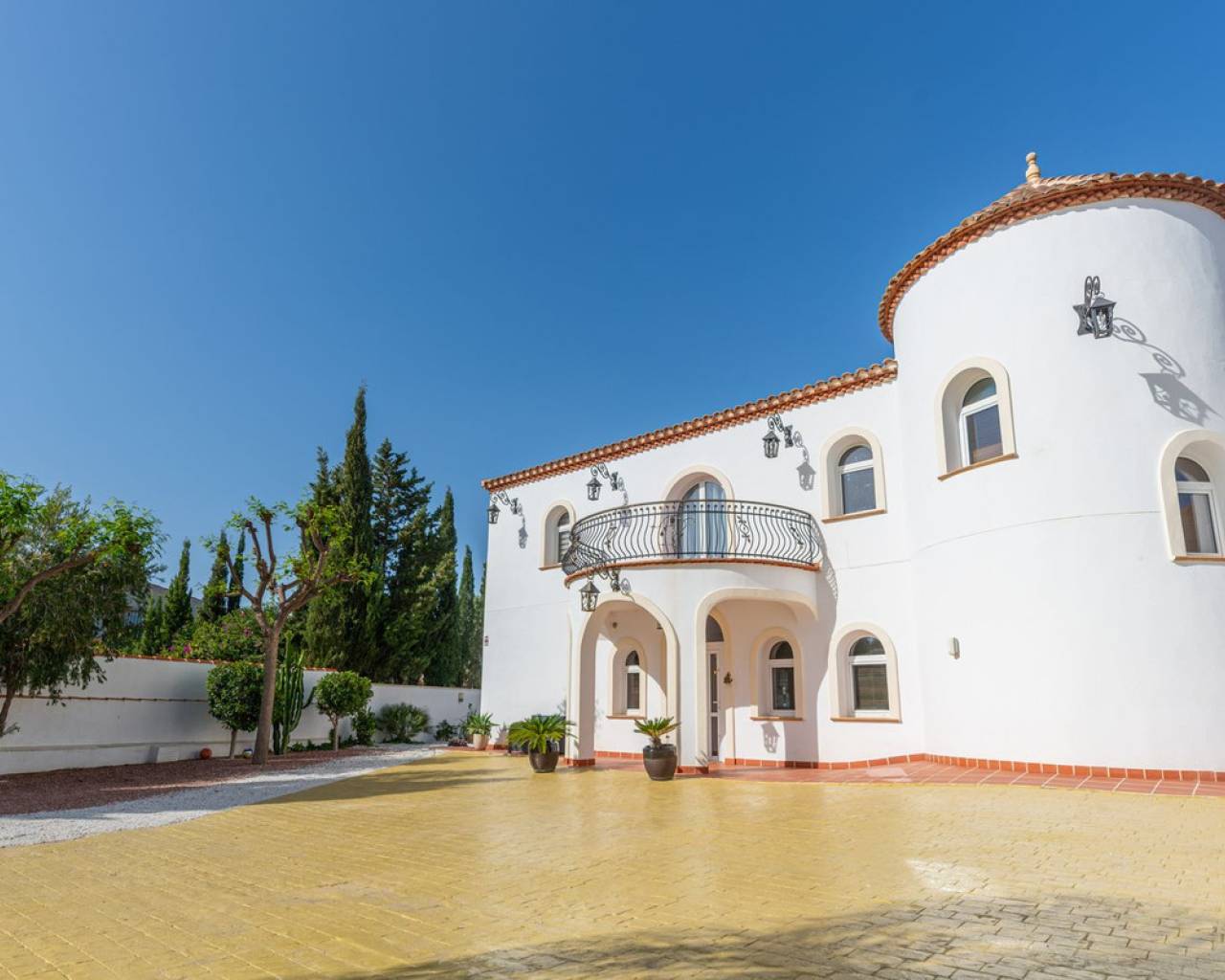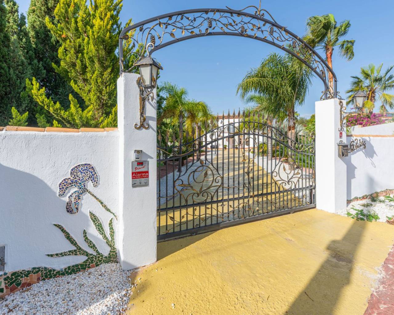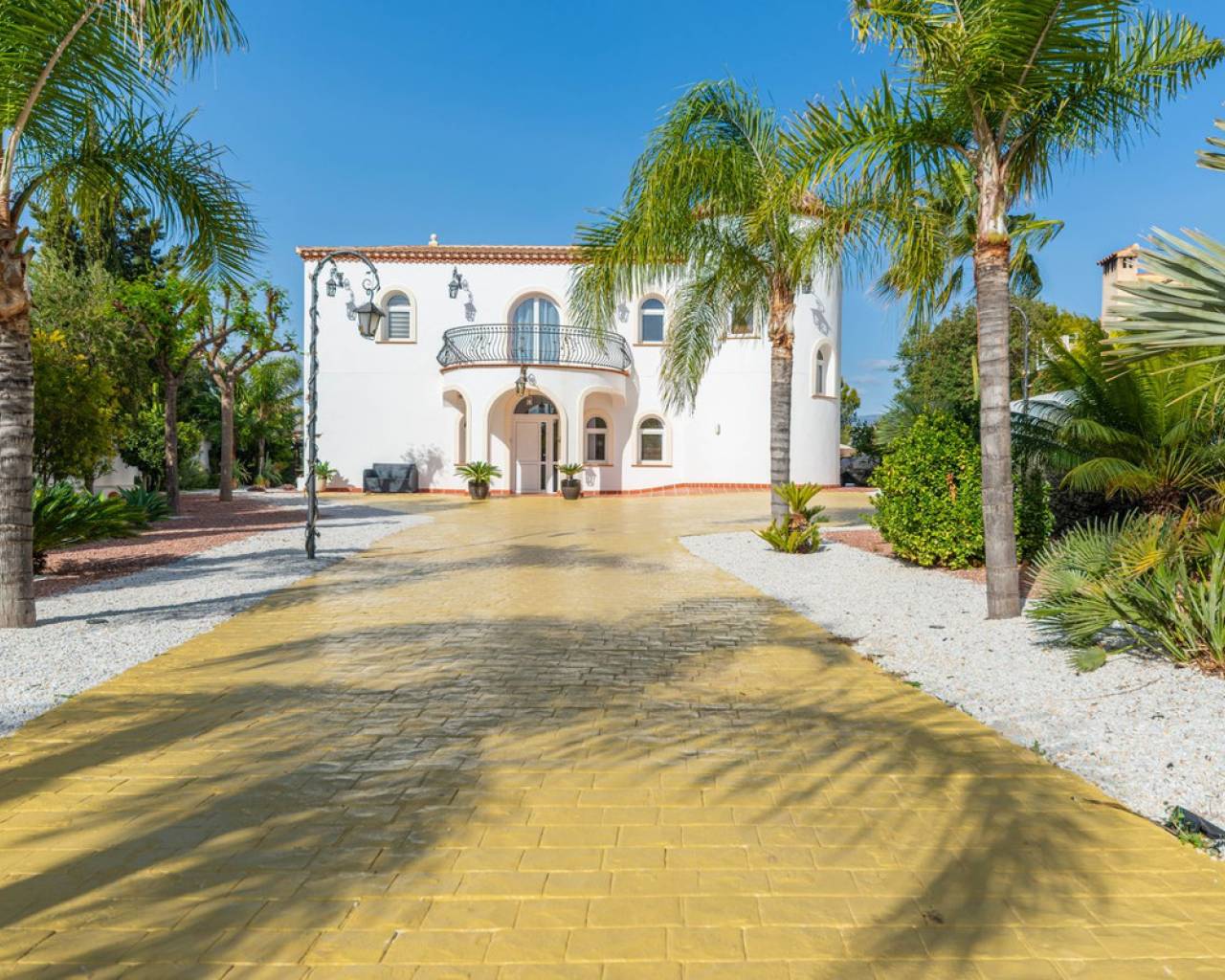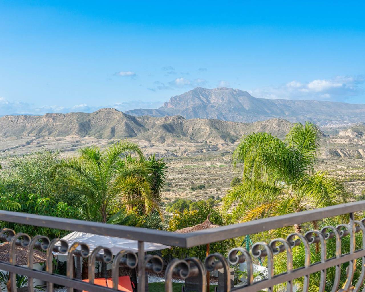 Located in the sought-after Pla Lloma area of Busot, near the charming village of Busot, lies this remarkable residence. Villa "Laura Luiza" is constructed with high-quality noble materials and spans over 350 m². Situated on an exceptionally private plot that exceeds three times its size, this villa enjoys a convenient location just a 10-minute drive from Busot village, 20 minutes from the pristine beaches of El Campello-San Juan, and only 30-35 minutes from Alicante and its international airport. Access to the stunning villa is via a residential road to the ornate hand crafted, automated entrance gates which open up to a long, tree lined drive way leading to the entrance of Villa "Laura Luiza". Villa Laura Luiza combines spacious accommodations, robust construction, stunning exteriors and interiors, breathtaking views, exceptional privacy, and a unique blend of character and charm—qualities rarely found together on the market. Ground Floor: Spacious open-plan lounge, dining, and kitchen area. The kitchen comes fully equipped with white goods. There are two double bedrooms on the ground floor. The master bedroom, generously sized at approximately [23] m², includes an en-suite shower room. A guest toilet is conveniently located next to the second bedroom, near the charming circular turret, which provides access to the second floor. Direct access to the ground floor terraces around the swimming pool area. Upper floor: 4 double suites with en-suite shower rooms on this level. The master bedroom also offers a dressing area and large bathroom with his and hers was basins, shower and bathtub. The 2 larger bedrooms enjoy direct access to a large terrace affording breathtaking views of the mountain range, the swimming pool and gardens. Bedrooms 3 and 4 benefit from their own private balconies. Exteriors: 220m2 swimming pool terrace, very private with open long distance views to the rear. Free-form swimming pool and covered terrace areas and day bed and BBQ. Manicured, landscaped gardens with mature trees terraced, laid to gravel and impressive driveway and impressive exterior lighting. Villa Laura Luiza is ideal for families looking for a permanent residence or investors seeking a high-end property for the luxury holiday rental market.