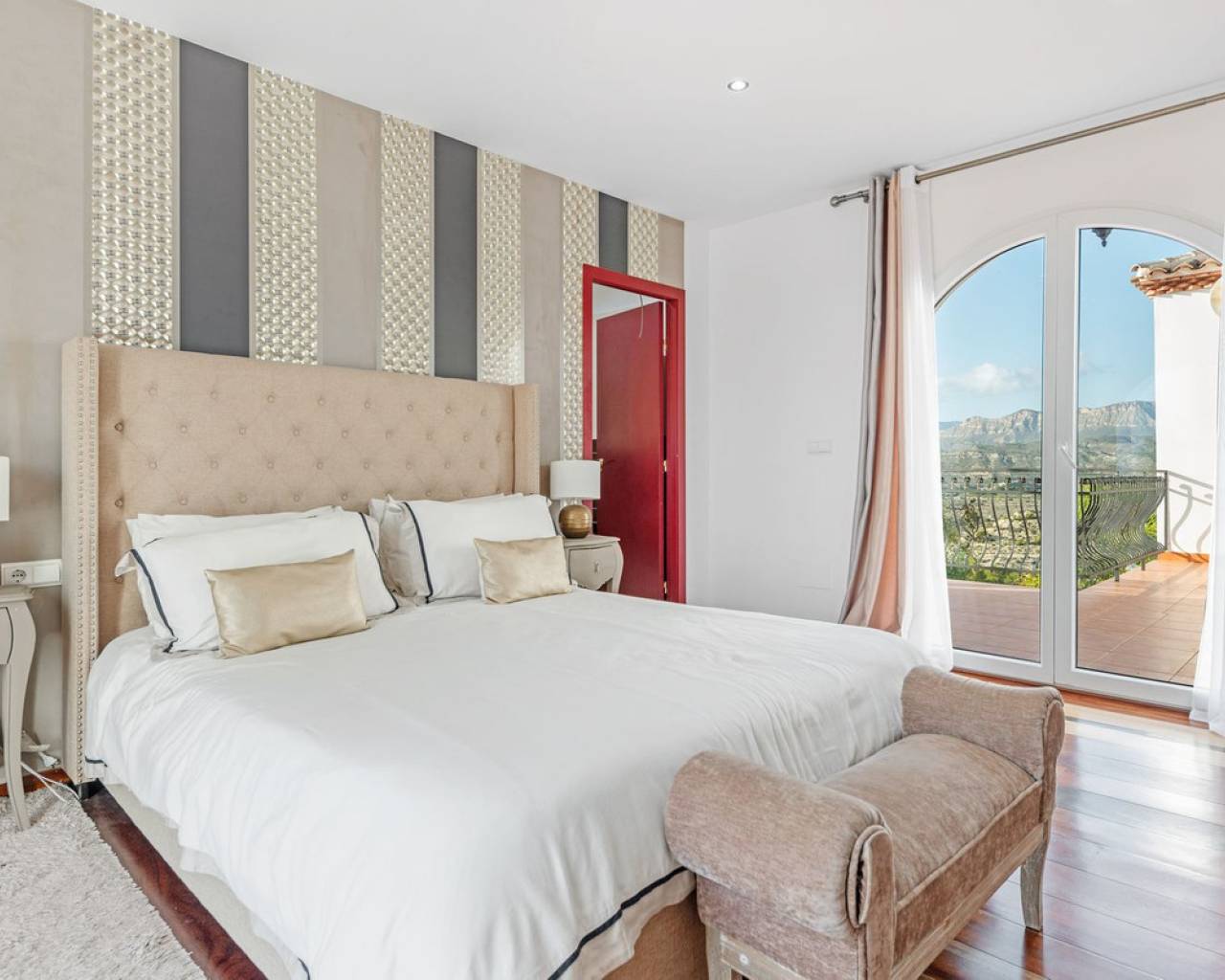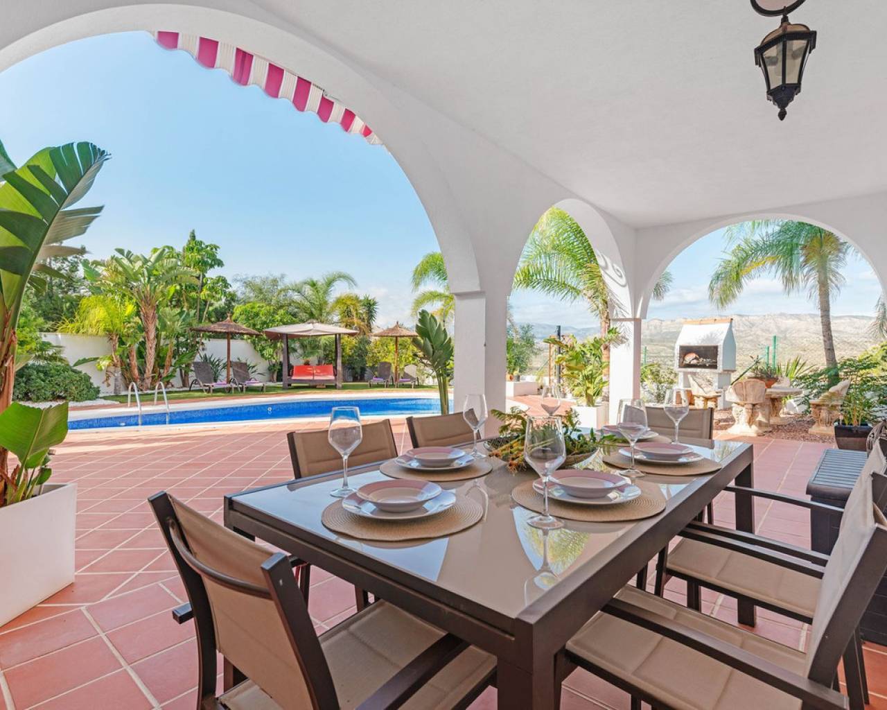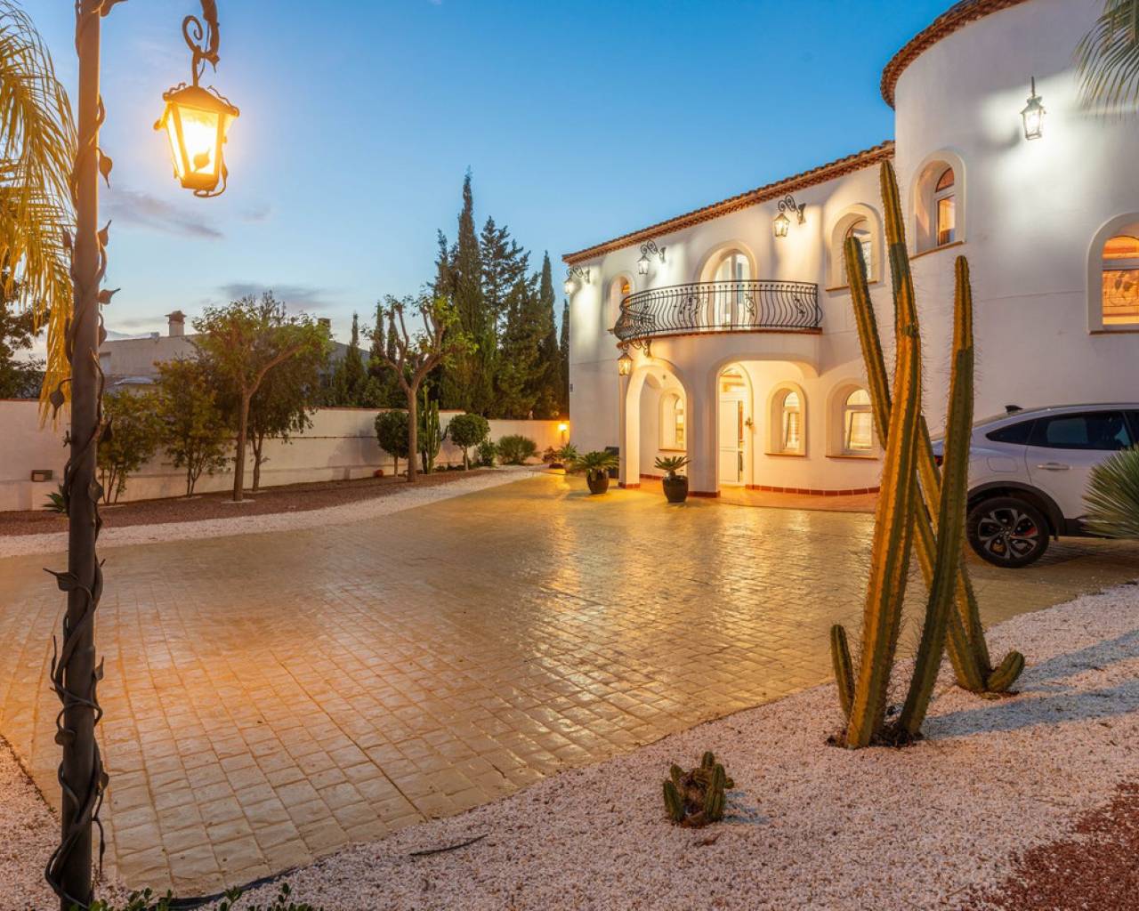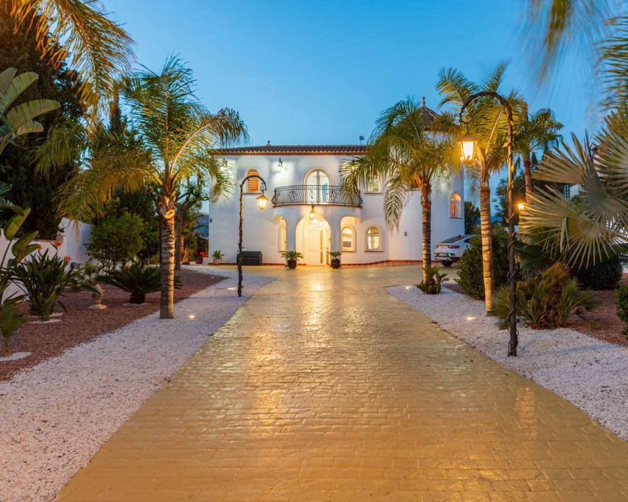 Located in the sought-after Pla Lloma area of Busot, near the charming village of Busot, lies this remarkable residence. Villa "Laura Luiza" is constructed with high-quality noble materials and spans over 350 m². Situated on an exceptionally private plot that exceeds three times its size, this villa enjoys a convenient location just a 10-minute drive from Busot village, 20 minutes from the pristine beaches of El Campello-San Juan, and only 30-35 minutes from Alicante and its international airport. Access to the stunning villa is via a residential road to the ornate hand crafted, automated entrance gates which open up to a long, tree lined drive way leading to the entrance of Villa "Laura Luiza". Villa Laura Luiza combines spacious accommodations, robust construction, stunning exteriors and interiors, breathtaking views, exceptional privacy, and a unique blend of character and charm—qualities rarely found together on the market. Ground Floor: Spacious open-plan lounge, dining, and kitchen area. The kitchen comes fully equipped with white goods. There are two double bedrooms on the ground floor. The master bedroom, generously sized at approximately [23] m², includes an en-suite shower room. A guest toilet is conveniently located next to the second bedroom, near the charming circular turret, which provides access to the second floor. Direct access to the ground floor terraces around the swimming pool area. Upper floor: 4 double suites with en-suite shower rooms on this level. The master bedroom also offers a dressing area and large bathroom with his and hers was basins, shower and bathtub. The 2 larger bedrooms enjoy direct access to a large terrace affording breathtaking views of the mountain range, the swimming pool and gardens. Bedrooms 3 and 4 benefit from their own private balconies. Exteriors: 220m2 swimming pool terrace, very private with open long distance views to the rear. Free-form swimming pool and covered terrace areas and day bed and BBQ. Manicured, landscaped gardens with mature trees terraced, laid to gravel and impressive driveway and impressive exterior lighting. Villa Laura Luiza is ideal for families looking for a permanent residence or investors seeking a high-end property for the luxury holiday rental market.