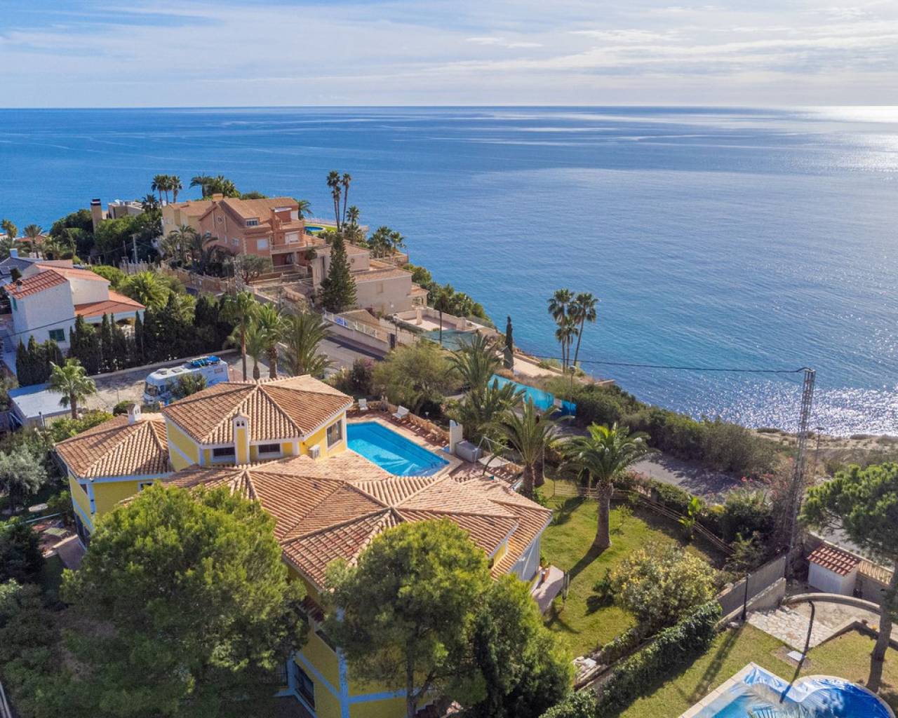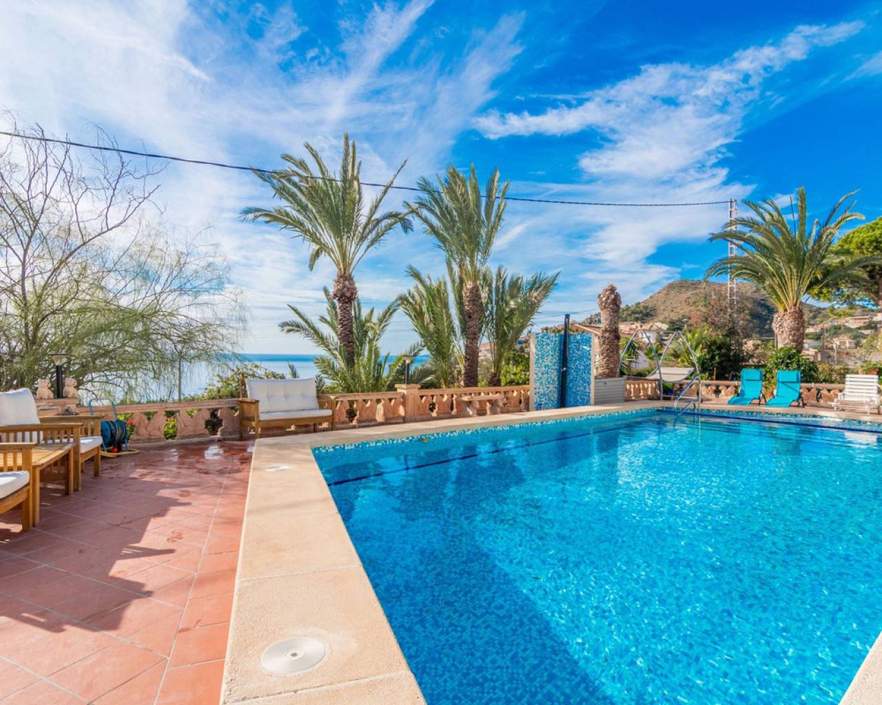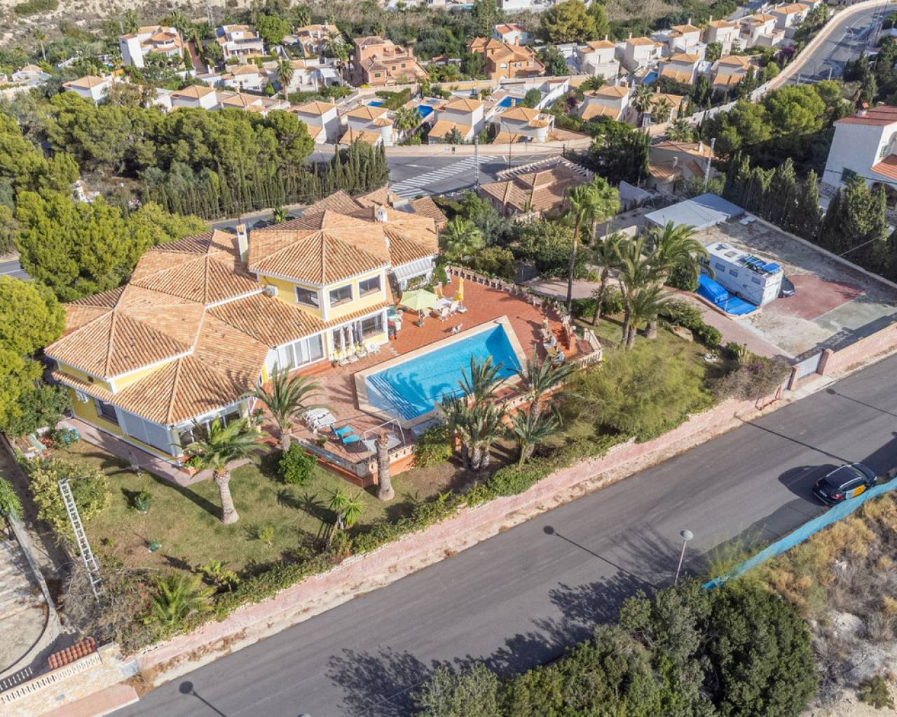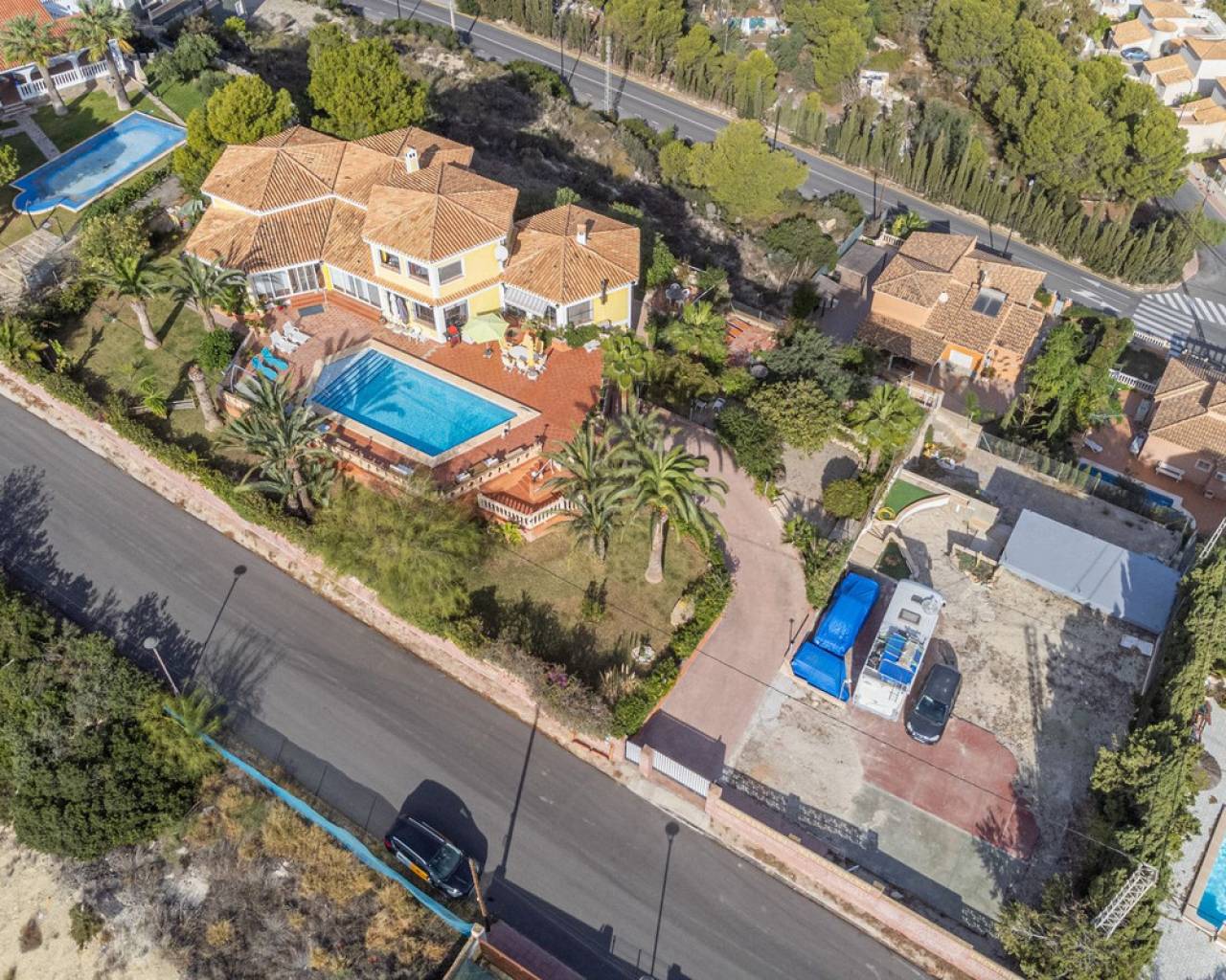 In Virgen de la Merced, Campello North, lies this espectacular hilltop estate with commanding views of the mediterranean and coastline to both the north an to the South. Villa Passiflora is 20km from Alicante to the north, 20 km from Finestrat and just 27 minutes away from Alicante international airport. The villa is just 1 km away from a sandy cove "Cala baeza" and only 9 minutes from El Campello Marina and Playa Carrer la Mar, 15 km to nearest golf course. Villa Passiflora is unique in its wonderful design, its hilltop location and setting, the 2300m2 of flat land with room for a tennis court or another villa and the complete privacy that it offers its owners. The property is accessed from a one way residencial road easily accessed from the N332 and entry to the property and parking is via an automated gate. The property is built on 3 levels: Entry level is comprised of 5 areas. The lounge, dining area, kitchen and main bedroom all are generous areas with high ceilings and the lounge and the dining area are separated by a fireplace. The master bedroom has an inset bath and there is an en-suite shower room. Separate toilet also on this level. Large open and glazed-in terraced areas accessed from the lounge. Views of the swimming pool and the sea from this level. Upper level: Hall, 2 bedrooms and a good-sized bathroom with his and her's wash basin. Breathtaking views from this level. Bottom floor: Open plan lounge-kitchen-dining area, double bedroom, good-sized bedroom and leisure room. 2 bathrooms on this level one with a shower and the other with a bath and shower. Garage and store room. Exteriors: Large plot with gardens, terraces and 56m2 swimming pool. Space for a tenis court or further construction posibilites. The property boasts all orientations, but the lounge terraces and pool are south-facing. Ideal for a large familly or those who require or enjoy interior and exterior space and wonderful panoramic sea views. Exclusively available with López and Henderson