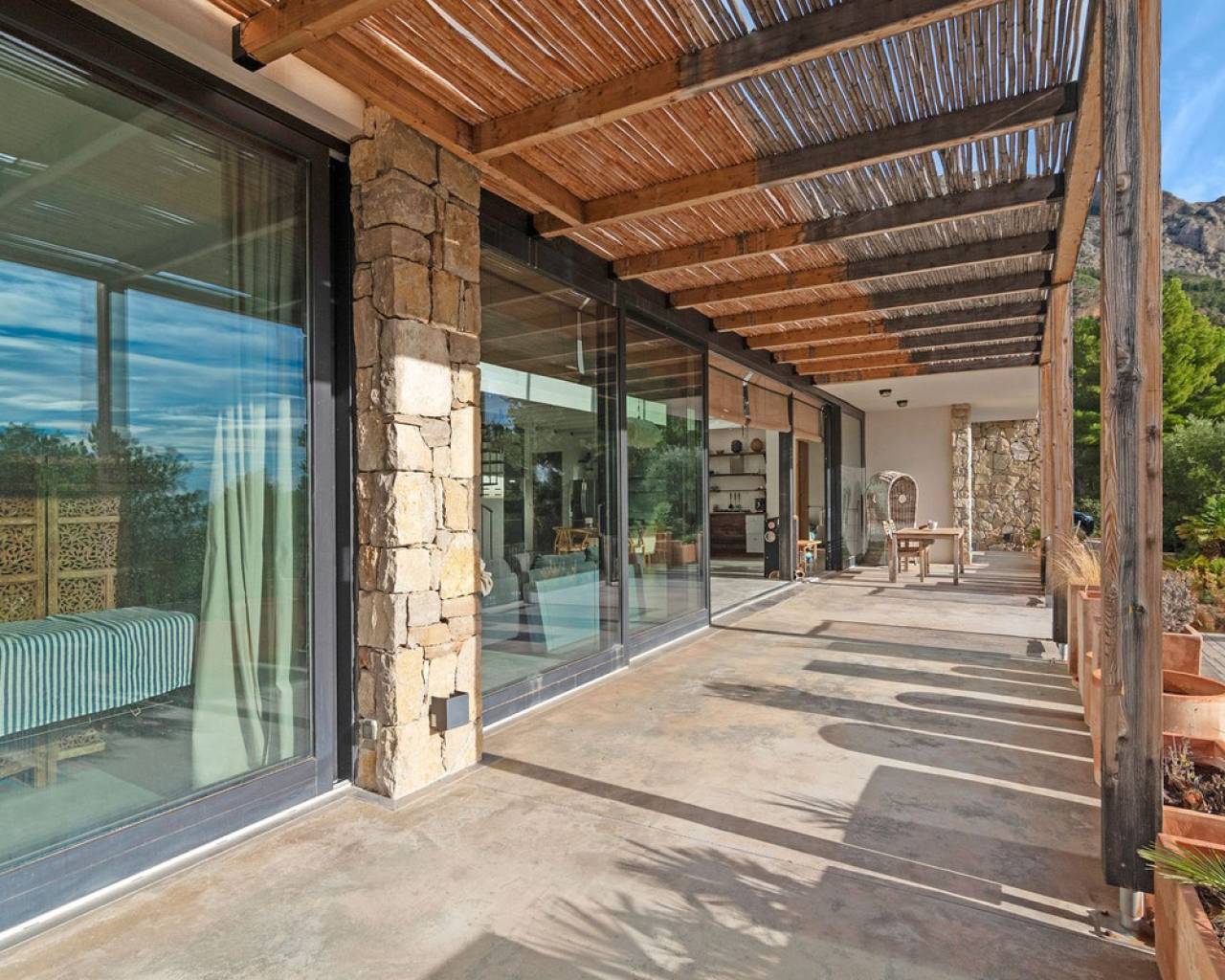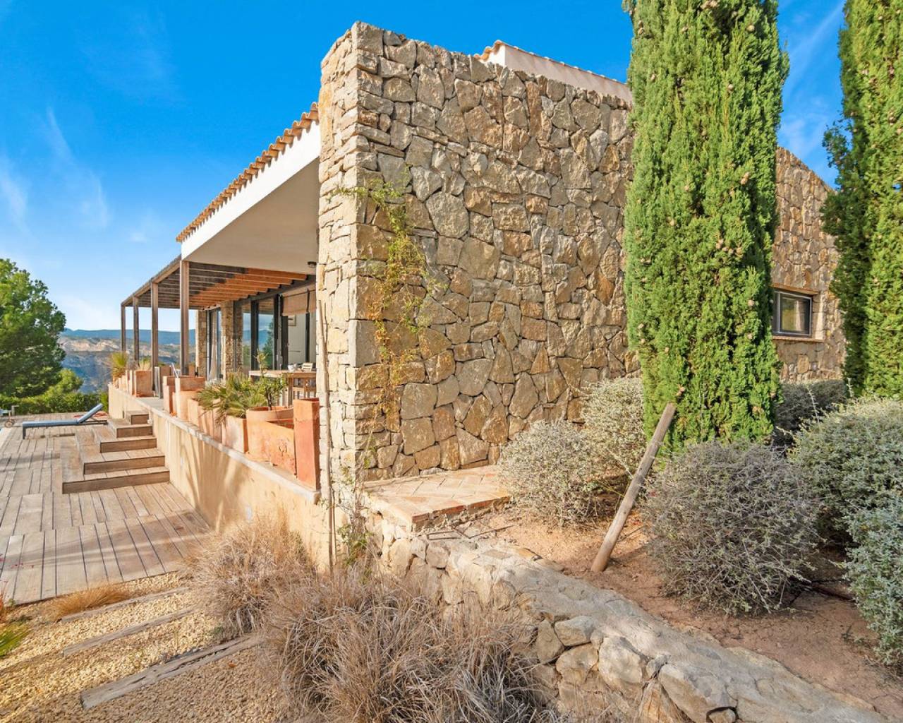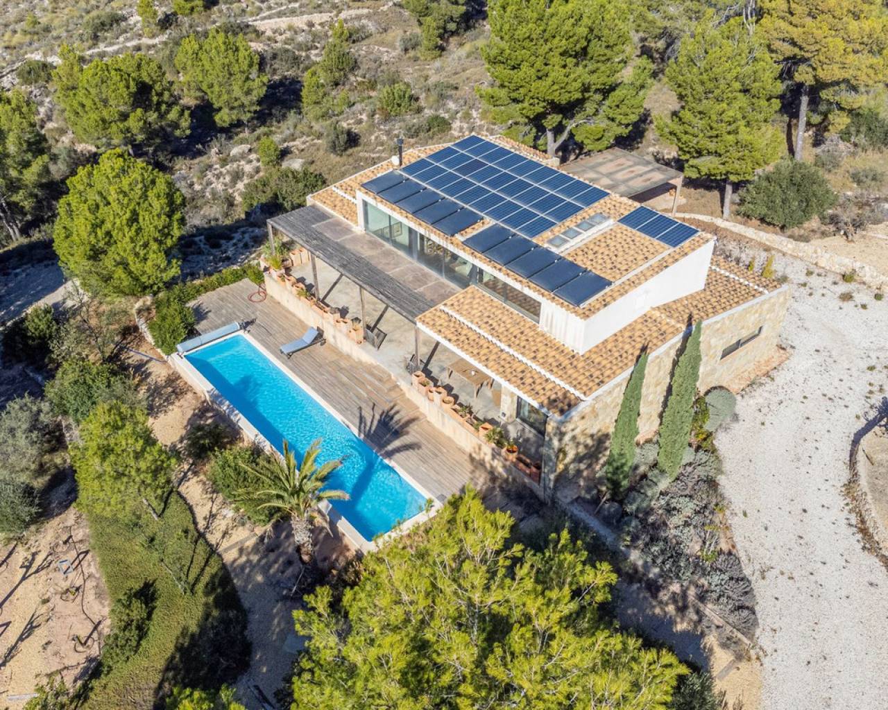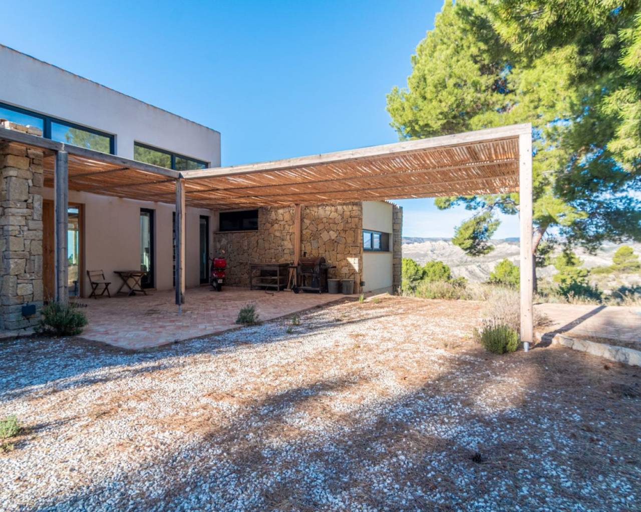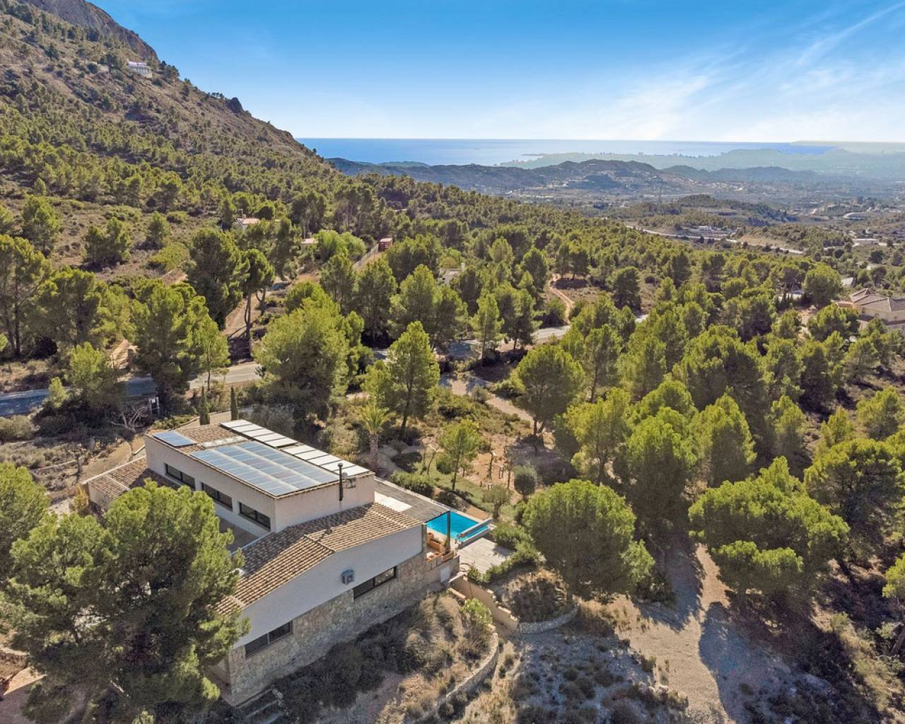 Now fully legalized and ready for sale, this remarkable property in the sought-after area of Cuevas de Canelobre in Busot offers complete peace of mind and an exceptional lifestyle. Located at the foot of the Cabeza D'or mountain, this impressive, contemporary residence spans over 250 m² on a private plot of more than 21,000 m². In an enviable natural setting, Villa Natura is just five minutes from the village of Busot, 15 minutes from the beaches of El Campello-San Juan, and 25–30 minutes from Alicante and its international airport. Inspired by New York architectural trends, the interior exudes modernity through its bright, open-plan design. With panoramic mountain views and the Mediterranean Sea in the distance, the villa offers absolute privacy and harmony with its natural surroundings. The open-plan, loft-style layout features high double ceilings, glass walls, and carefully curated décor. The lounge–kitchen–dining area opens onto a landscaped garden with a saltwater swimming pool and pine-filled horizon. Accessed via a country road with an automated gate, the estate includes a gravel drive bordered by Mediterranean flora and parking for several cars. The ground floor comprises a spacious living area, master bedroom with en-suite and dressing room, two additional bedrooms with shared "Jack and Jill" bathroom, while the upper floor offers a lounge-workspace, bedroom, and bathroom with panoramic views. Outdoors, a covered terrace for al-fresco dining adjoins the main living area, leading to a 100 m² loft lounge with a 46 m² solar-heated, saltwater pool. The 21,400 m² of landscaped grounds feature pines, fruit trees, and Mediterranean shrubs, creating a feast for the senses. Technical highlights: solar power with battery storage, underfloor heating, air conditioning (hot/cold), double-glazed windows, gas tank, and backup generator. A unique opportunity to acquire a fully legalized, state-of-the-art residence that perfectly combines avant-garde design, comfort, and natural beauty — an ideal retreat or family home.
