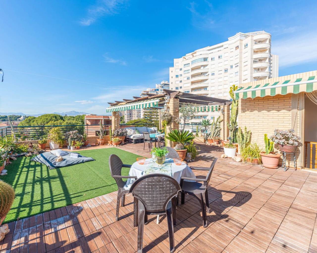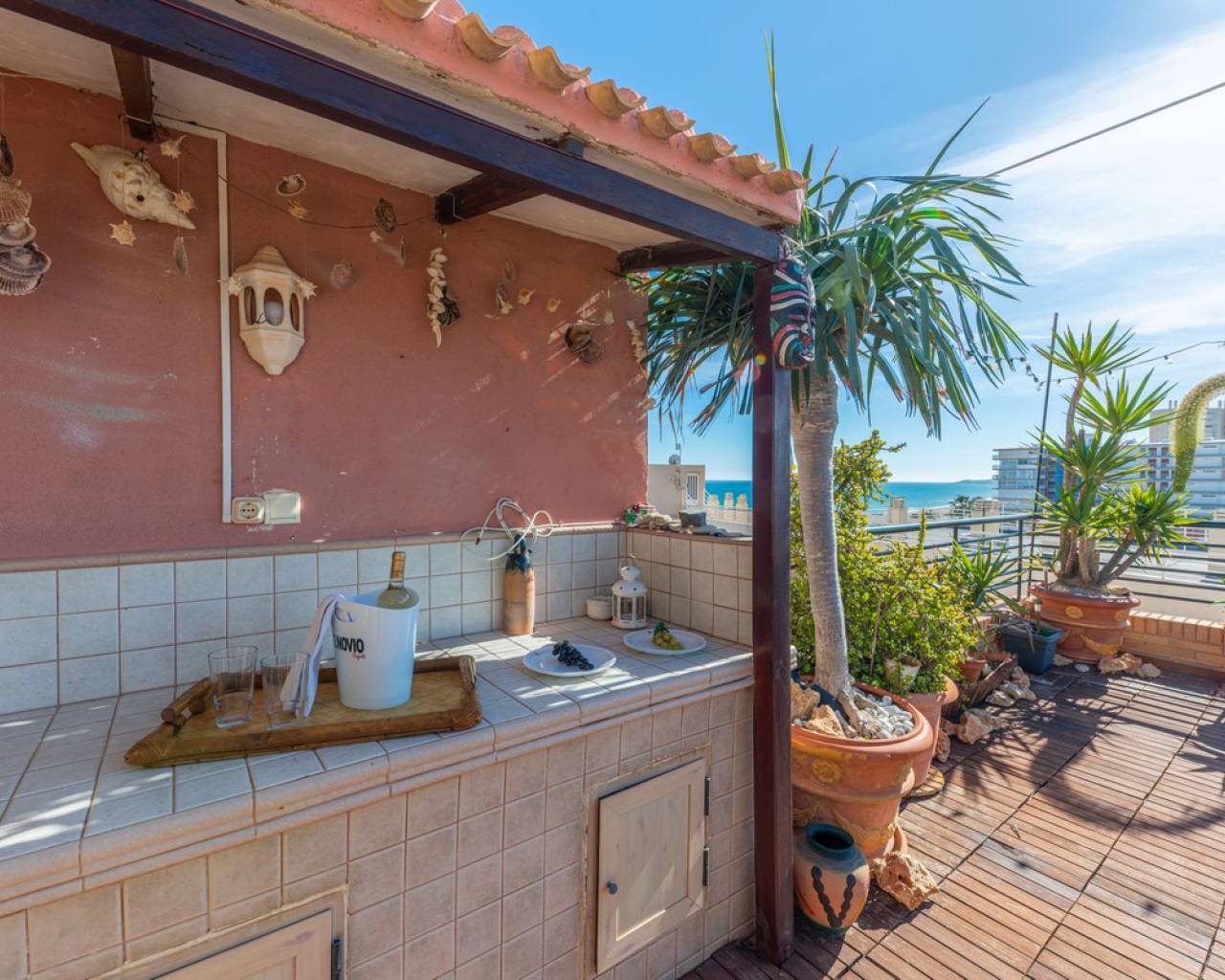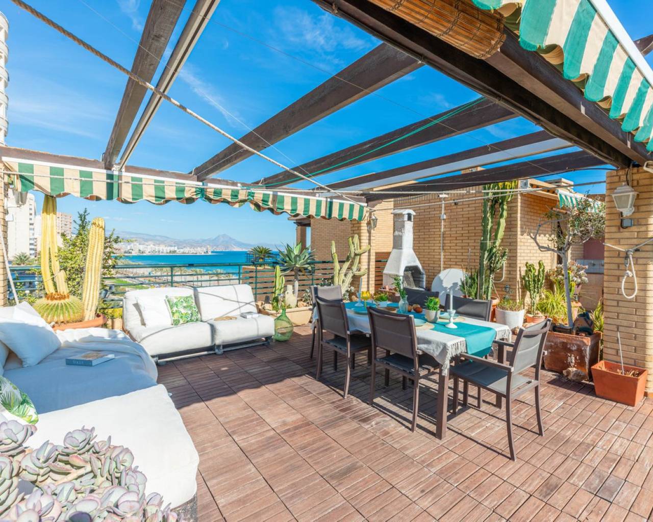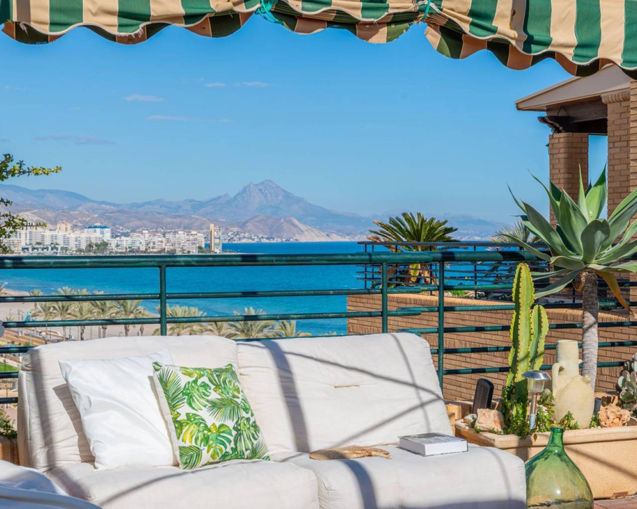 This stunning 3-bedroom penthouse is located on the spectacular Muchavista Beach, just 20 minutes from Alicante city and 5 minutes from the center of El Campello. It is within walking distance of the tram and bus stops, close to all amenities, schools, and motorway connections, and only a 25-minute drive from El Altet International Airport. This south-facing penthouse boasts a prime beachfront location and spacious 3-bedroom accommodation. Its large open-plan design, incredible private outdoor space, breathtaking views, and idyllic sun terrace—accessible from within the apartment—make it a truly unique find. Access to the penthouse is via a residential street leading to an automated gate, which opens to the beachfront complex. The property is situated on an upper floor, accessible by elevator. This exceptional top-floor apartment features 3 bedrooms, an independent family shower room, and a separate toilet near the entrance hallway. The spacious open-plan living, dining, and kitchen area enjoys extraordinary sea views. The lounge benefits from a double aspect, making the entire space bright and airy, yet at the same time, cozy and inviting. The stylish white kitchen is fully equipped and offers stunning views of the northern coastline and the Mediterranean. A staircase from the hallway leads up to the rooftop terrace, which features an outdoor kitchen area and a structure for awnings, providing shade—perfect for relaxing, entertaining, and unwinding with the sea as a constant backdrop. The residence offers a swimming pool and a garden area right in front of the beach, a true luxury. An underground garage within the residence is included in this offer. This penthouse is ideal for a family in search of something truly exceptional.