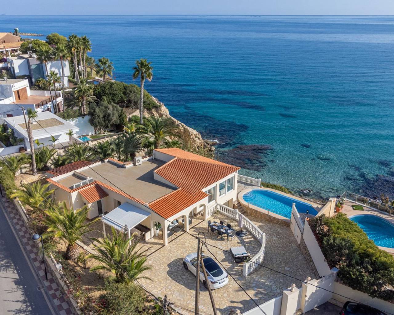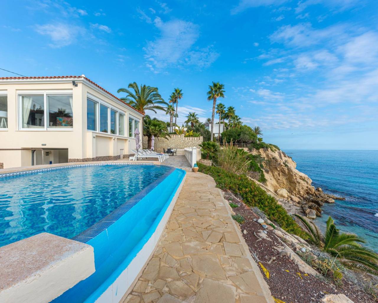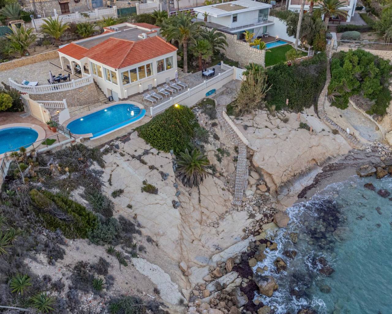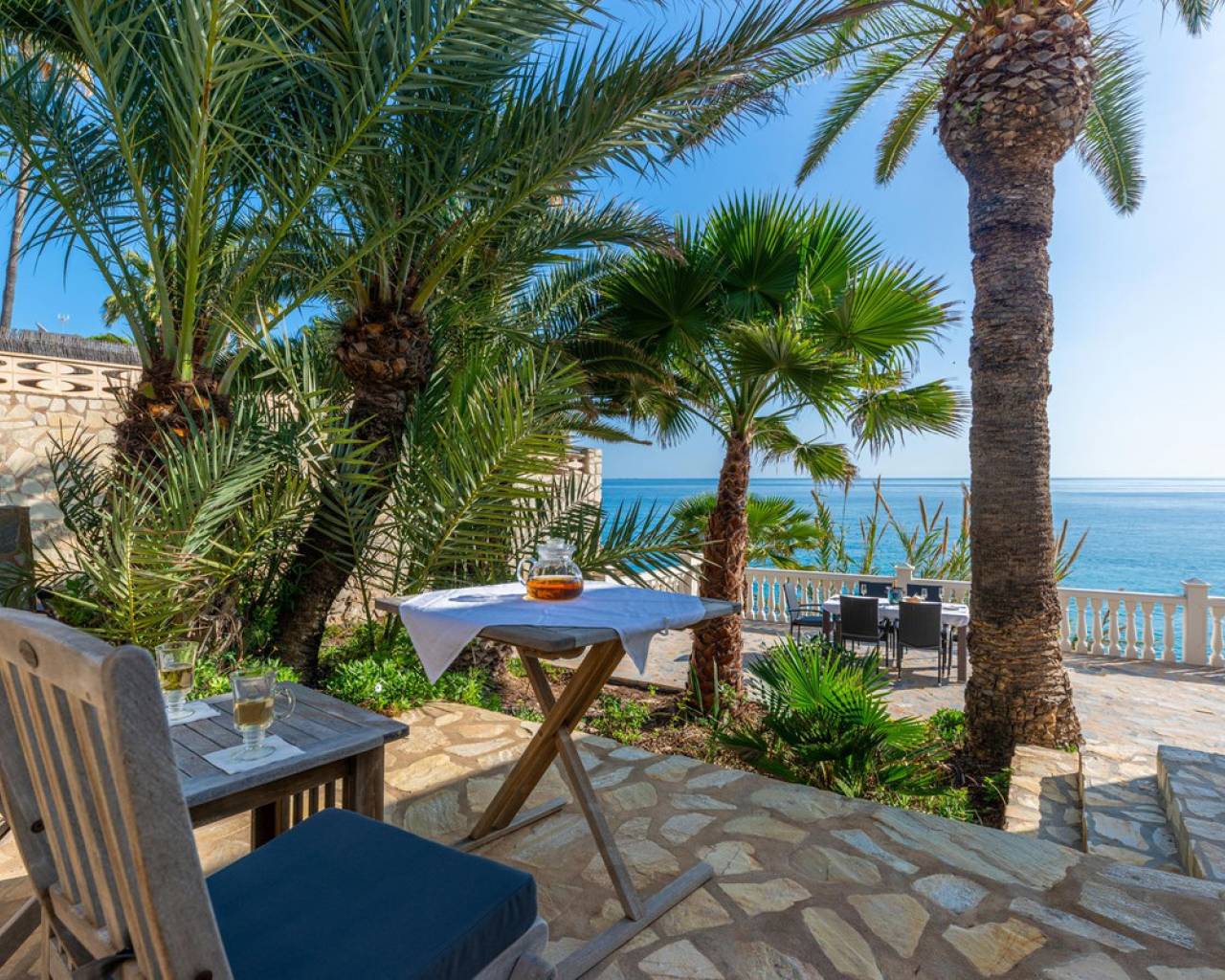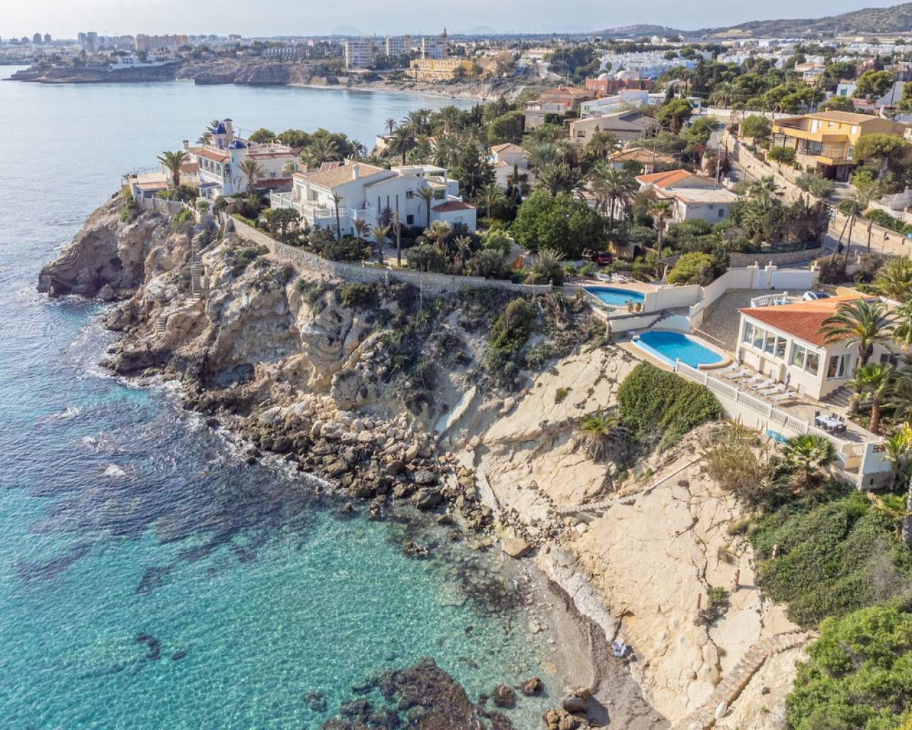 Exceptional Sea Front Villa on the Northern Costa Blanca with Private Staircase to Beach Nestled on the front line of the Northern Costa Blanca, in the highly sought-after residential area of Coveta Fuma, this exceptional villa spans over 220 square meters and sits on a particularly private plot more than five times its size. Positioned between two idyllic coves and on top of a third, it is just a short drive from the charming fishing village of Villajoyosa to the north and the picturesque coastal town of El Campello to the south. This privileged location offers breathtaking sea and mountain views, along with a private staircase leading directly to a secluded beach cove. The tranquil cove is ideal for sunbathing or swimming, away from the crowds. Additionally, Villa Bahía Verdosa is conveniently located near Coveta Fuma's local shopping center. Its proximity to Alicante—just 25 minutes away—ensures easy access to the international airport, two golf courses, and a marina. Access and Privacy The villa is accessed via an automated sliding gate leading to a private driveway from a quiet residential cul-de-sac in Coveta Fuma. Design and Layout Set on a corner plot, this single-story villa (with a garage located on a lower level) seamlessly integrates with the lush Mediterranean landscape. The property was fully renovated in 2019 to the highest standards, with a subsequent upgrade in 2023. During this renovation, the structural framework of the house was retained, but everything else was completely rebuilt. Improvements included: - Wall and roof insulation. - Replacement of all windows, doors, the front gate, and the garage door. - New flooring and roof. - A complete overhaul of the electrical system, plumbing, garden, and terraces. - Entirely reconstructed bathrooms, kitchen, and outdoor kitchen. - Interior design and furnishing with high-quality materials, ensuring both comfort and style. Interior Highlights Ground Floor A spacious, open-plan living area of approximately 76 m² features two lounge/seating areas and a dining zone. Expansive windows flood the space with natural light, showcasing stunning views of the terrace and the Mediterranean sea. Adjacent to the living area is an arched, covered naya-terrace (15 m²) to the west, ideal for enjoying the evening or winter sun. Kitchen A fully equipped, state-of-the-art kitchen is adjacent to the lounge, featuring high-end appliances—perfect for culinary enthusiasts. Bedrooms - Three double bedrooms with built-in wardrobes. - The master bedroom boasts captivating sea views and an en-suite bathroom with dual sinks. Lower Level - An underground garage with space for one car, motorbike, jetski and additional storage. - Private parking for multiple vehicles within the property. Exterior Features** - Covered outdoor BBQ area (11 m²). - Mature, landscaped gardens with numerous palm trees and terraced areas for dining, relaxation, and sunbathing. - A stunning 126 m² pool terrace with a 38 m² infinity pool offering spectacular views. - Private access to a secluded beach cove. Additional Amenities - Alarm system for enhanced security. - Hot and cold air conditioning throughout the property. - Luxury furniture, fixtures, fittings, and appliances included in the price. South-Facing Outlook The villa enjoys a desirable south-facing orientation, ensuring abundant natural light throughout the day. deal for Mediterranean Living This villa is the perfect choice for a family seeking to embrace the best of Mediterranean living, combining luxury, privacy, and a breathtaking coastal setting. It is also well-suited for individuals with reduced mobility and elderly residents.