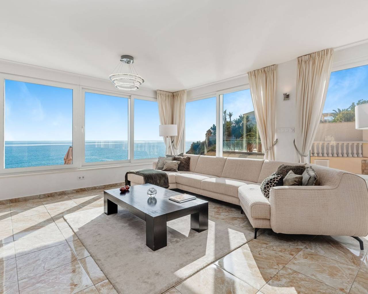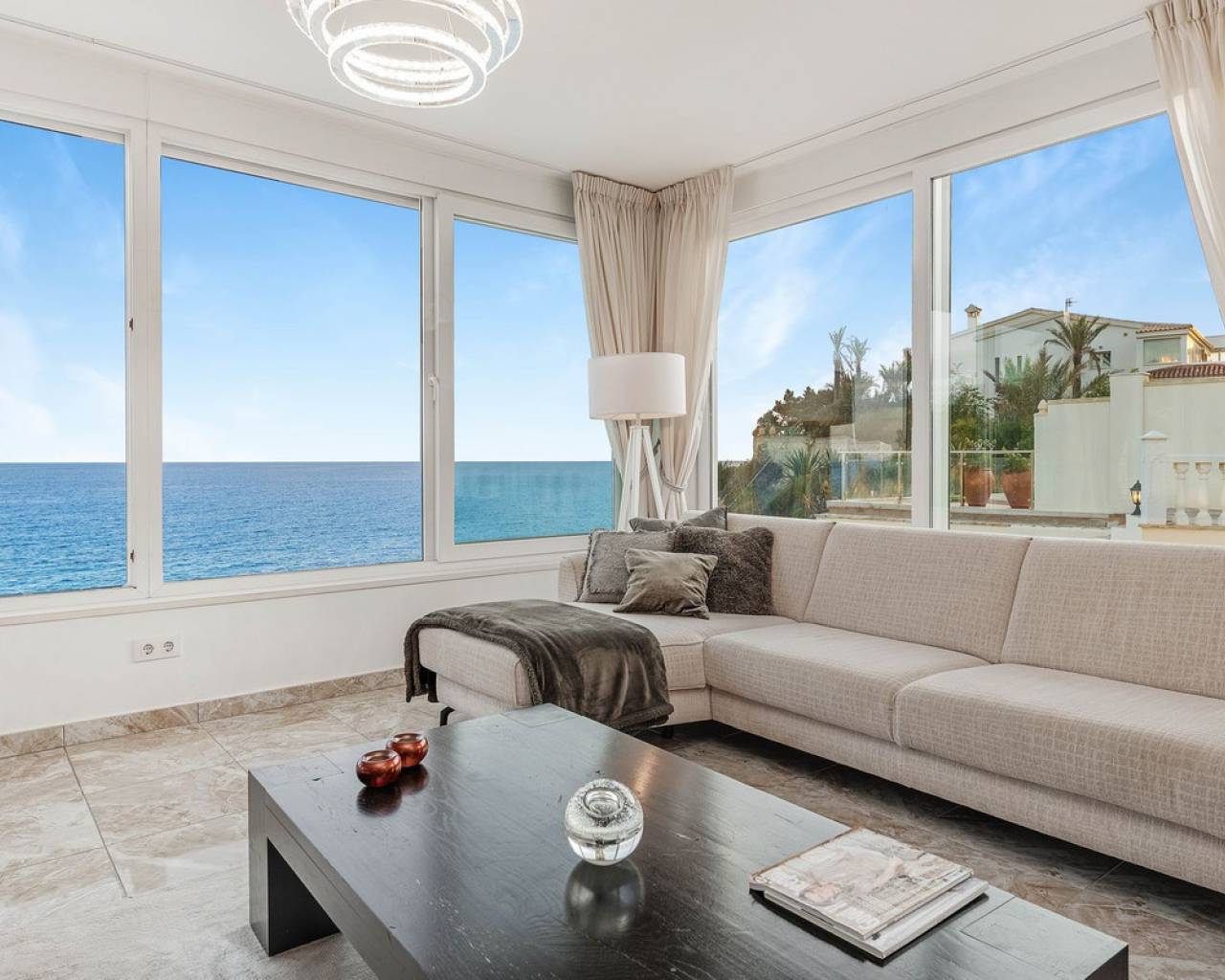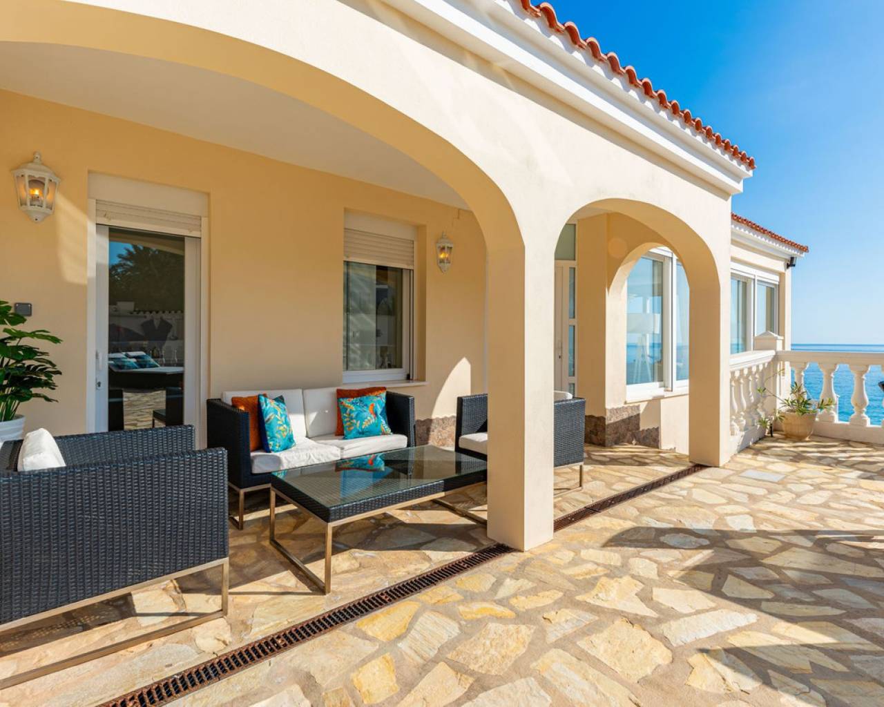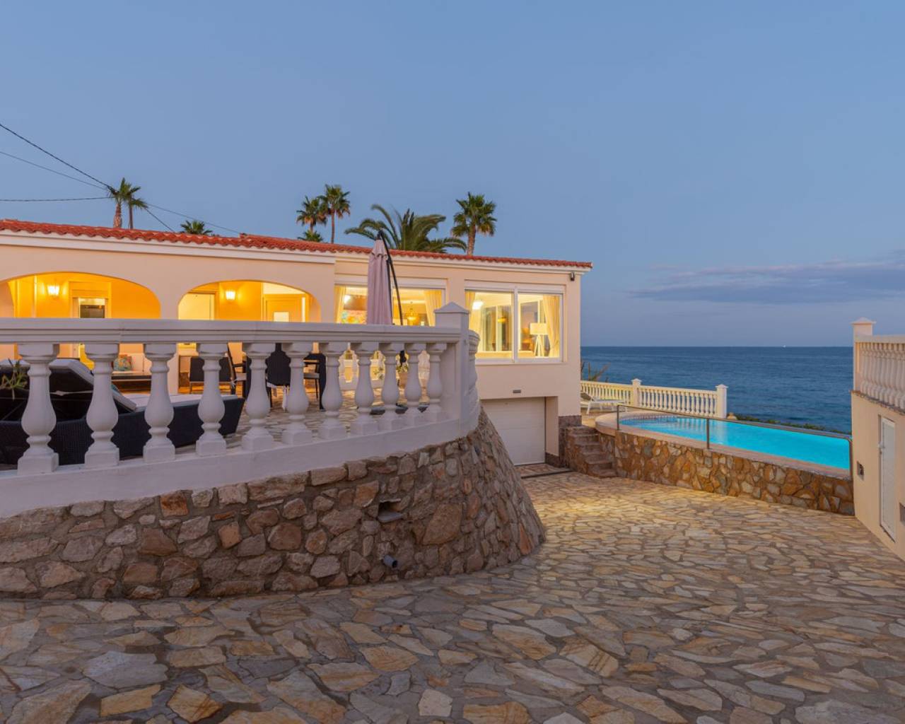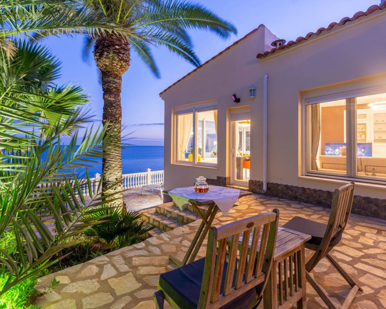 Exceptional Sea Front Villa on the Northern Costa Blanca with Private Staircase to Beach Nestled on the front line of the Northern Costa Blanca, in the highly sought-after residential area of Coveta Fuma, this exceptional villa spans over 220 square meters and sits on a particularly private plot more than five times its size. Positioned between two idyllic coves and on top of a third, it is just a short drive from the charming fishing village of Villajoyosa to the north and the picturesque coastal town of El Campello to the south. This privileged location offers breathtaking sea and mountain views, along with a private staircase leading directly to a secluded beach cove. The tranquil cove is ideal for sunbathing or swimming, away from the crowds. Additionally, Villa Bahía Verdosa is conveniently located near Coveta Fuma's local shopping center. Its proximity to Alicante—just 25 minutes away—ensures easy access to the international airport, two golf courses, and a marina. Access and Privacy The villa is accessed via an automated sliding gate leading to a private driveway from a quiet residential cul-de-sac in Coveta Fuma. Design and Layout Set on a corner plot, this single-story villa (with a garage located on a lower level) seamlessly integrates with the lush Mediterranean landscape. The property was fully renovated in 2019 to the highest standards, with a subsequent upgrade in 2023. During this renovation, the structural framework of the house was retained, but everything else was completely rebuilt. Improvements included: - Wall and roof insulation. - Replacement of all windows, doors, the front gate, and the garage door. - New flooring and roof. - A complete overhaul of the electrical system, plumbing, garden, and terraces. - Entirely reconstructed bathrooms, kitchen, and outdoor kitchen. - Interior design and furnishing with high-quality materials, ensuring both comfort and style. Interior Highlights Ground Floor A spacious, open-plan living area of approximately 76 m² features two lounge/seating areas and a dining zone. Expansive windows flood the space with natural light, showcasing stunning views of the terrace and the Mediterranean sea. Adjacent to the living area is an arched, covered naya-terrace (15 m²) to the west, ideal for enjoying the evening or winter sun. Kitchen A fully equipped, state-of-the-art kitchen is adjacent to the lounge, featuring high-end appliances—perfect for culinary enthusiasts. Bedrooms - Three double bedrooms with built-in wardrobes. - The master bedroom boasts captivating sea views and an en-suite bathroom with dual sinks. Lower Level - An underground garage with space for one car, motorbike, jetski and additional storage. - Private parking for multiple vehicles within the property. Exterior Features** - Covered outdoor BBQ area (11 m²). - Mature, landscaped gardens with numerous palm trees and terraced areas for dining, relaxation, and sunbathing. - A stunning 126 m² pool terrace with a 38 m² infinity pool offering spectacular views. - Private access to a secluded beach cove. Additional Amenities - Alarm system for enhanced security. - Hot and cold air conditioning throughout the property. - Luxury furniture, fixtures, fittings, and appliances included in the price. South-Facing Outlook The villa enjoys a desirable south-facing orientation, ensuring abundant natural light throughout the day. deal for Mediterranean Living This villa is the perfect choice for a family seeking to embrace the best of Mediterranean living, combining luxury, privacy, and a breathtaking coastal setting. It is also well-suited for individuals with reduced mobility and elderly residents.