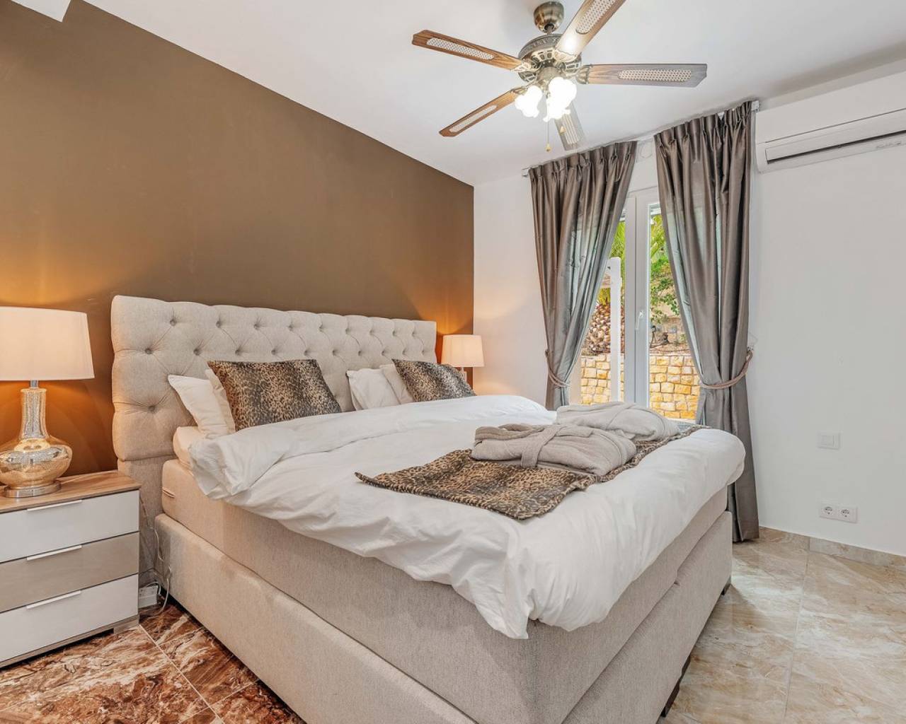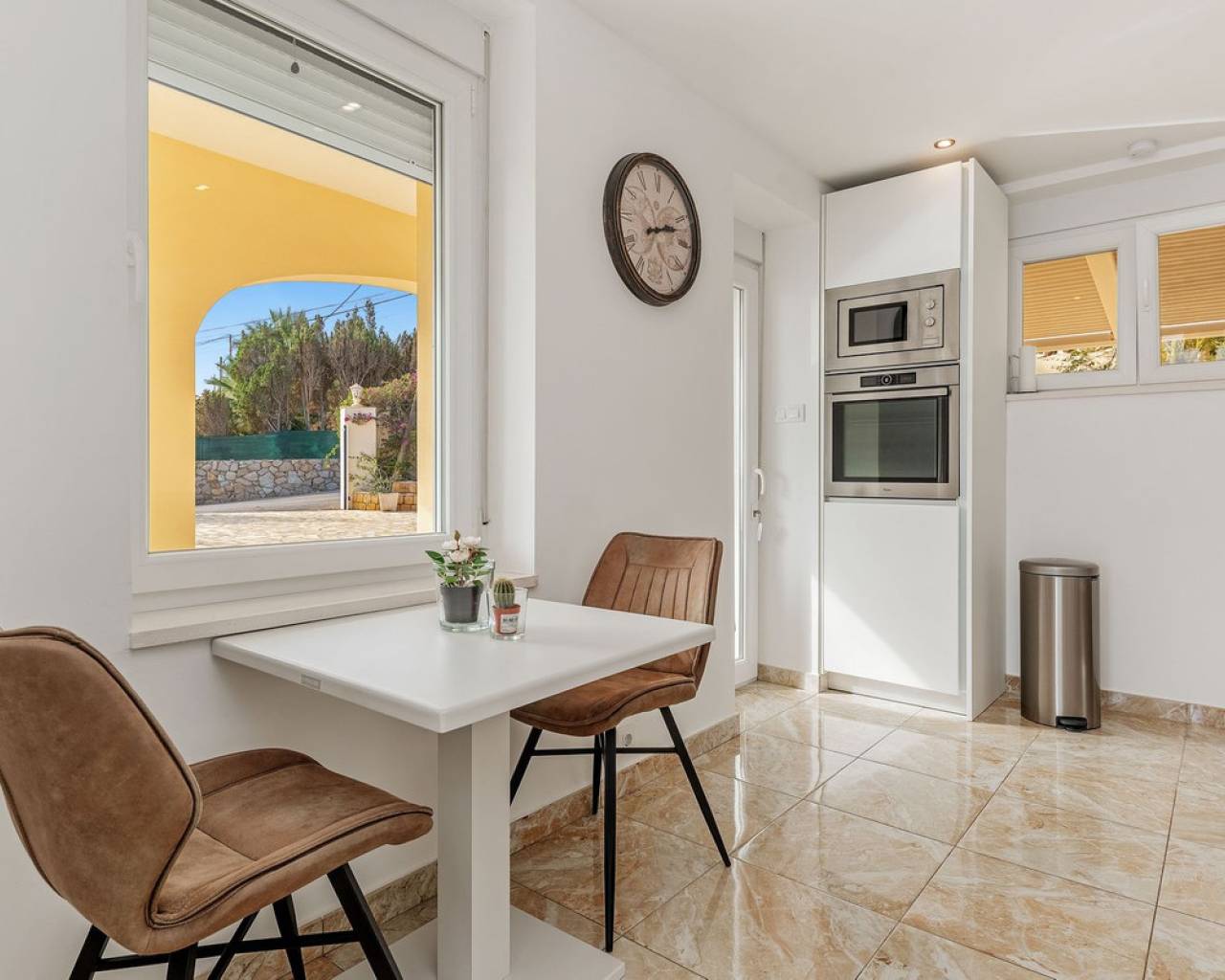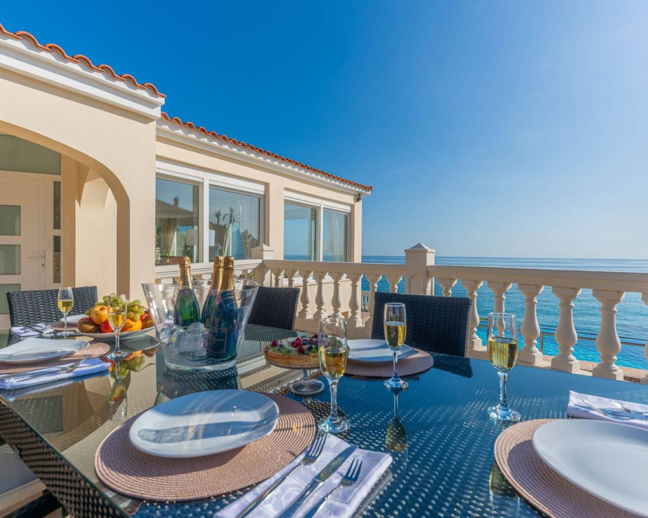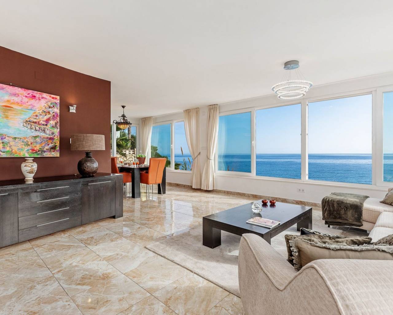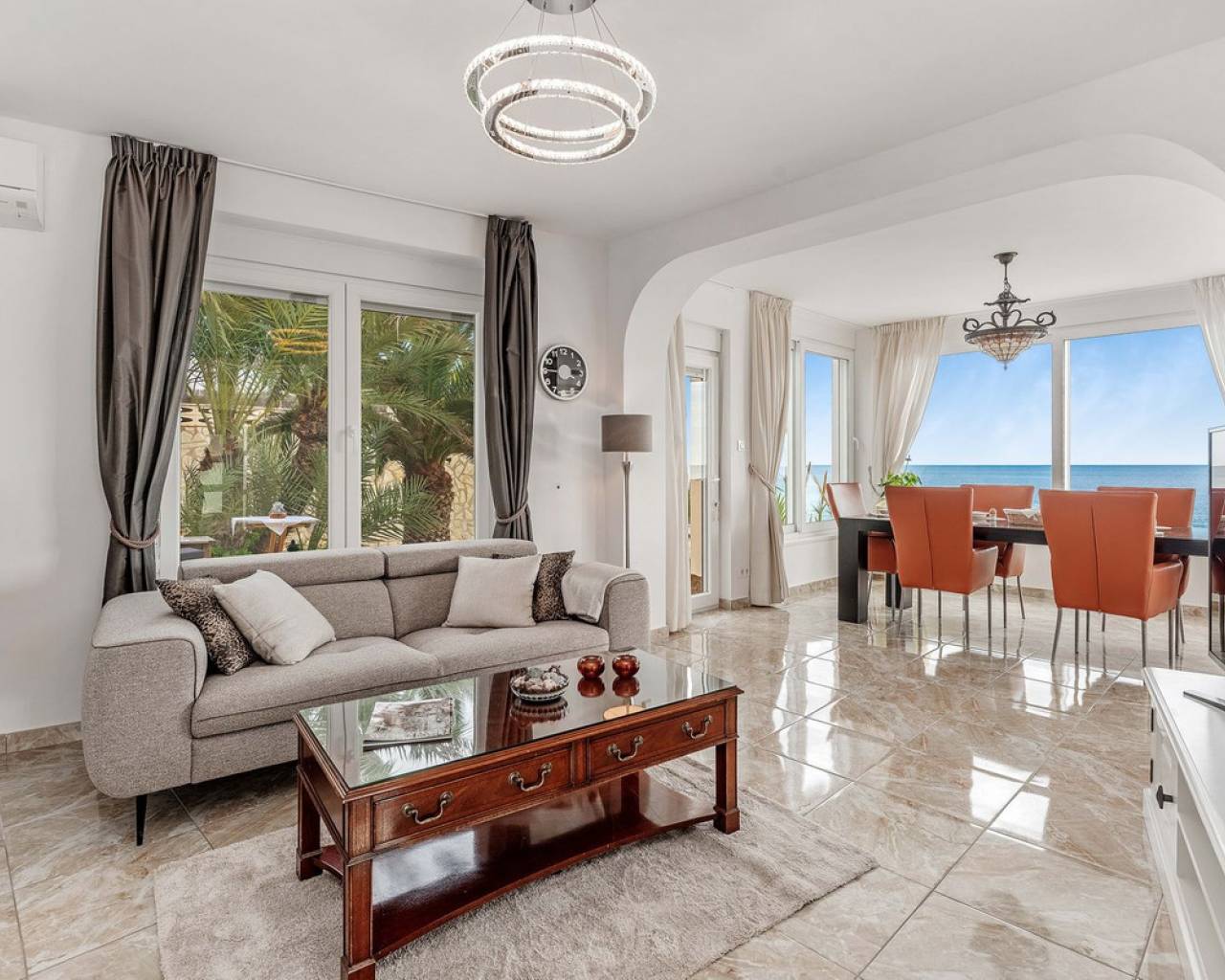 Exceptional Sea Front Villa on the Northern Costa Blanca with Private Staircase to Beach Nestled on the front line of the Northern Costa Blanca, in the highly sought-after residential area of Coveta Fuma, this exceptional villa spans over 220 square meters and sits on a particularly private plot more than five times its size. Positioned between two idyllic coves and on top of a third, it is just a short drive from the charming fishing village of Villajoyosa to the north and the picturesque coastal town of El Campello to the south. This privileged location offers breathtaking sea and mountain views, along with a private staircase leading directly to a secluded beach cove. The tranquil cove is ideal for sunbathing or swimming, away from the crowds. Additionally, Villa Bahía Verdosa is conveniently located near Coveta Fuma's local shopping center. Its proximity to Alicante—just 25 minutes away—ensures easy access to the international airport, two golf courses, and a marina. Access and Privacy The villa is accessed via an automated sliding gate leading to a private driveway from a quiet residential cul-de-sac in Coveta Fuma. Design and Layout Set on a corner plot, this single-story villa (with a garage located on a lower level) seamlessly integrates with the lush Mediterranean landscape. The property was fully renovated in 2019 to the highest standards, with a subsequent upgrade in 2023. During this renovation, the structural framework of the house was retained, but everything else was completely rebuilt. Improvements included: - Wall and roof insulation. - Replacement of all windows, doors, the front gate, and the garage door. - New flooring and roof. - A complete overhaul of the electrical system, plumbing, garden, and terraces. - Entirely reconstructed bathrooms, kitchen, and outdoor kitchen. - Interior design and furnishing with high-quality materials, ensuring both comfort and style. Interior Highlights Ground Floor A spacious, open-plan living area of approximately 76 m² features two lounge/seating areas and a dining zone. Expansive windows flood the space with natural light, showcasing stunning views of the terrace and the Mediterranean sea. Adjacent to the living area is an arched, covered naya-terrace (15 m²) to the west, ideal for enjoying the evening or winter sun. Kitchen A fully equipped, state-of-the-art kitchen is adjacent to the lounge, featuring high-end appliances—perfect for culinary enthusiasts. Bedrooms - Three double bedrooms with built-in wardrobes. - The master bedroom boasts captivating sea views and an en-suite bathroom with dual sinks. Lower Level - An underground garage with space for one car, motorbike, jetski and additional storage. - Private parking for multiple vehicles within the property. Exterior Features** - Covered outdoor BBQ area (11 m²). - Mature, landscaped gardens with numerous palm trees and terraced areas for dining, relaxation, and sunbathing. - A stunning 126 m² pool terrace with a 38 m² infinity pool offering spectacular views. - Private access to a secluded beach cove. Additional Amenities - Alarm system for enhanced security. - Hot and cold air conditioning throughout the property. - Luxury furniture, fixtures, fittings, and appliances included in the price. South-Facing Outlook The villa enjoys a desirable south-facing orientation, ensuring abundant natural light throughout the day. deal for Mediterranean Living This villa is the perfect choice for a family seeking to embrace the best of Mediterranean living, combining luxury, privacy, and a breathtaking coastal setting. It is also well-suited for individuals with reduced mobility and elderly residents.