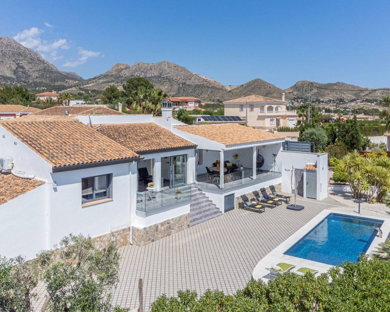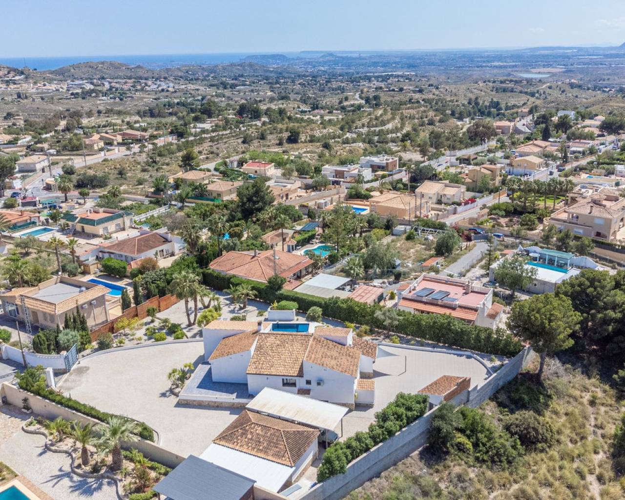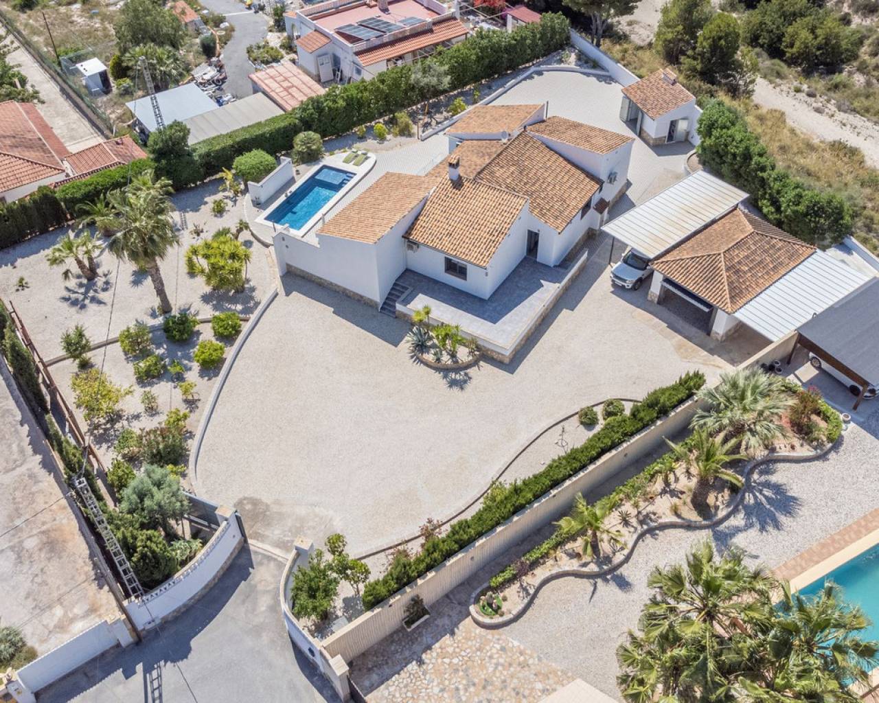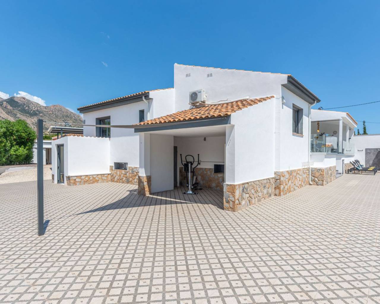Villa Mirador del Sol – A Private Retreat with Coastal Views in Pla Lloma, Busot Set in the highly desirable Pla Lloma area near the charming village of Busot, Villa Mirador del Sol is a beautifully refurbished residence that offers the perfect blend of privacy, elegance, and Mediterranean living. With over 250 m² of interior space and nestled on a plot more than eight times its footprint, this exceptional home provides a rare opportunity to enjoy tranquil surroundings just a short distance from the coast. Ideally located, the villa is only 4 minutes from the heart of Busot, 20 minutes from the golden beaches of El Campello and San Juan, and just 30–35 minutes from Alicante city and its international airport. Entrance and Grounds A quiet cul-de-sac leads to the property's automated entrance gates, which open onto a generous gravel driveway with access to a private garage and two covered carports, one of which is tall enough to accommodate a motorhome. Design and Layout The villa offers flexible and spacious accommodation across two levels: Main Floor • Elegant L-shaped kitchen fully equipped. Generously sized workspace, connected to a bright open-plan lounge area featuring a wood-burning stove. • Adjacent dining area with direct access to two sun-drenched terraces totaling 42 m², both offering spectacular coastal and countryside views. • Two double bedrooms with built-in wardrobes, including a master suite with en-suite shower room. • A second modern bathroom is located near the second bedroom and hallway. Lower Floor – Guest Accommodation * Independent entrance * Open-plan lounge and bedroom area * Additional double bedroom with built-in wardrobes * Shared bathroom located between the two sleeping areas * Outdoor BBQ kitchen area opposite private guest quarters. * Ideal for guests or extended family Exteriors and Amenities • A brand-new designer swimming pool with a stainless steel waterfall feature serves as the centerpiece of the garden. • Expansive terraced areas surround the pool, perfect for lounging or entertaining. • A private sauna and outdoor exercise zone are located nearby for wellness and relaxation. • Beautifully landscaped plot with graveled areas, mature Mediterranean trees, shrubs, and hedges. • Approx. 750 m² of garden space. • An outdoor bathroom next to covered BBQ area, ideal for al fresco dining. Orientation and Ambience: The villa enjoys a south-westerly orientation, maximizing natural light and offering breathtaking sunset views over the hills as well as towards the distant coastline.
