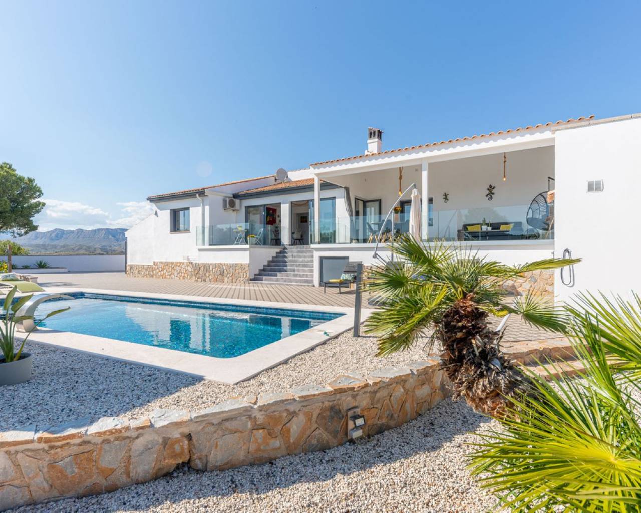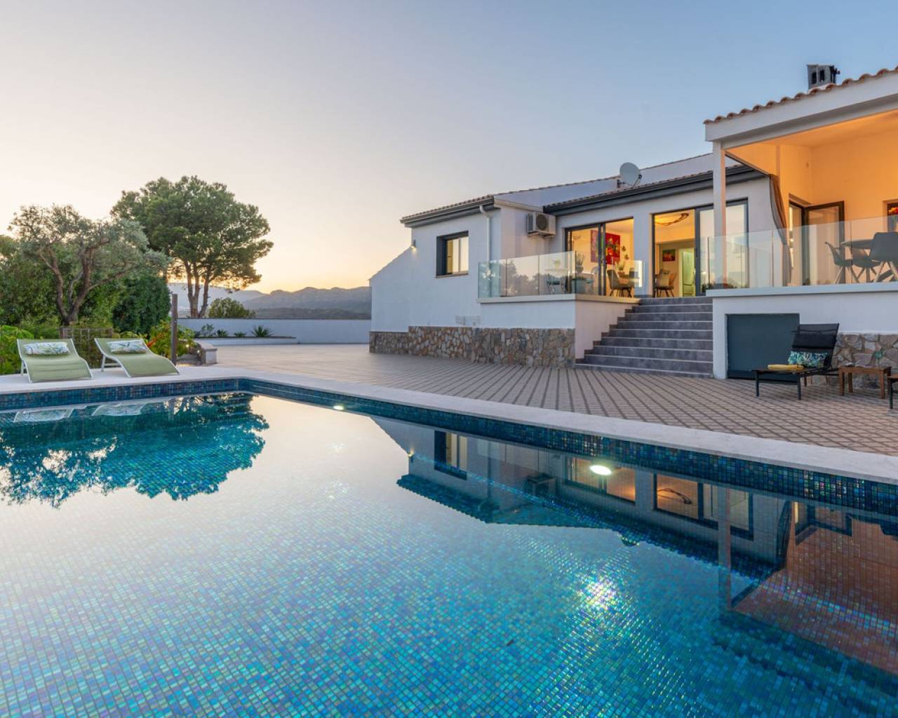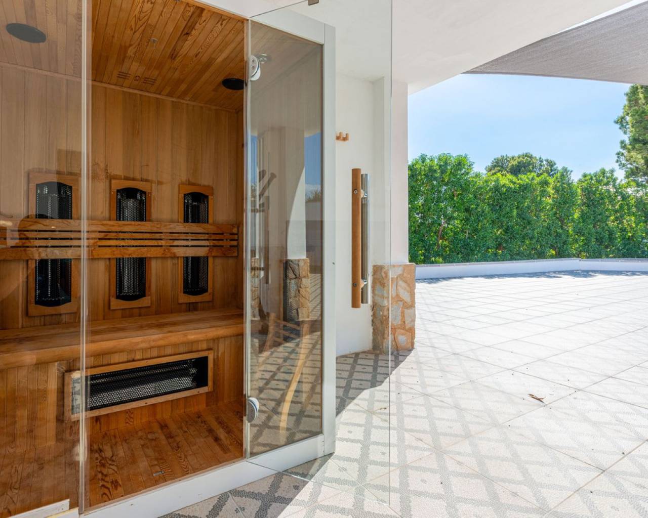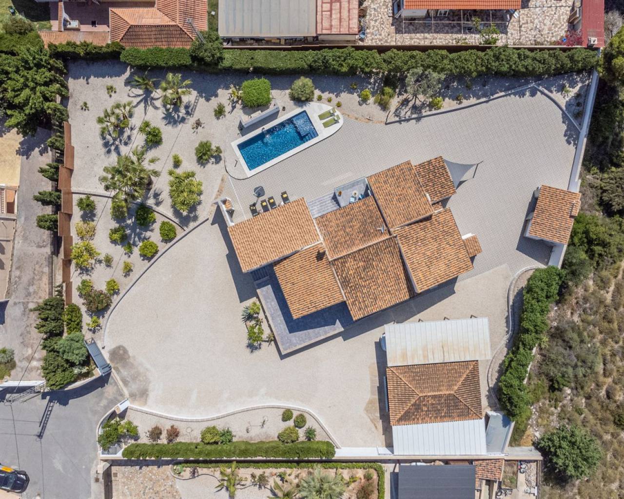 Villa Mirador del Sol – A Private Retreat with Coastal Views in Pla Lloma, Busot Set in the highly desirable Pla Lloma area near the charming village of Busot, Villa Mirador del Sol is a beautifully refurbished residence that offers the perfect blend of privacy, elegance, and Mediterranean living. With over 250 m² of interior space and nestled on a plot more than eight times its footprint, this exceptional home provides a rare opportunity to enjoy tranquil surroundings just a short distance from the coast. Ideally located, the villa is only 4 minutes from the heart of Busot, 20 minutes from the golden beaches of El Campello and San Juan, and just 30–35 minutes from Alicante city and its international airport. Entrance and Grounds A quiet cul-de-sac leads to the property's automated entrance gates, which open onto a generous gravel driveway with access to a private garage and two covered carports, one of which is tall enough to accommodate a motorhome. Design and Layout The villa offers flexible and spacious accommodation across two levels: Main Floor • Elegant L-shaped kitchen fully equipped. Generously sized workspace, connected to a bright open-plan lounge area featuring a wood-burning stove. • Adjacent dining area with direct access to two sun-drenched terraces totaling 42 m², both offering spectacular coastal and countryside views. • Two double bedrooms with built-in wardrobes, including a master suite with en-suite shower room. • A second modern bathroom is located near the second bedroom and hallway. Lower Floor – Guest Accommodation * Independent entrance * Open-plan lounge and bedroom area * Additional double bedroom with built-in wardrobes * Shared bathroom located between the two sleeping areas * Outdoor BBQ kitchen area opposite private guest quarters. * Ideal for guests or extended family Exteriors and Amenities • A brand-new designer swimming pool with a stainless steel waterfall feature serves as the centerpiece of the garden. • Expansive terraced areas surround the pool, perfect for lounging or entertaining. • A private sauna and outdoor exercise zone are located nearby for wellness and relaxation. • Beautifully landscaped plot with graveled areas, mature Mediterranean trees, shrubs, and hedges. • Approx. 750 m² of garden space. • An outdoor bathroom next to covered BBQ area, ideal for al fresco dining. Orientation and Ambience: The villa enjoys a south-westerly orientation, maximizing natural light and offering breathtaking sunset views over the hills as well as towards the distant coastline.